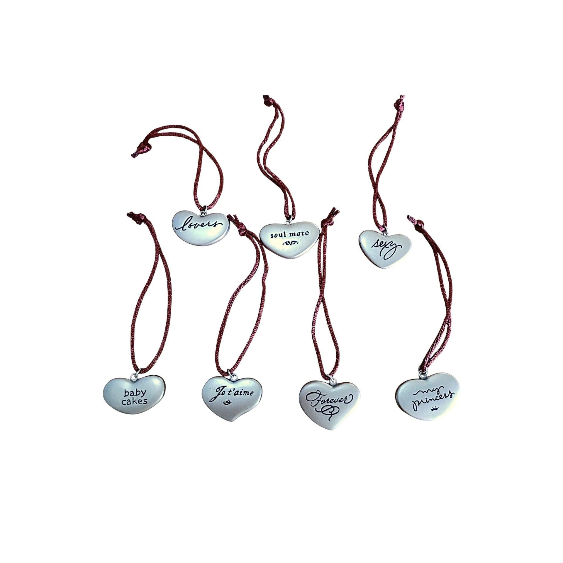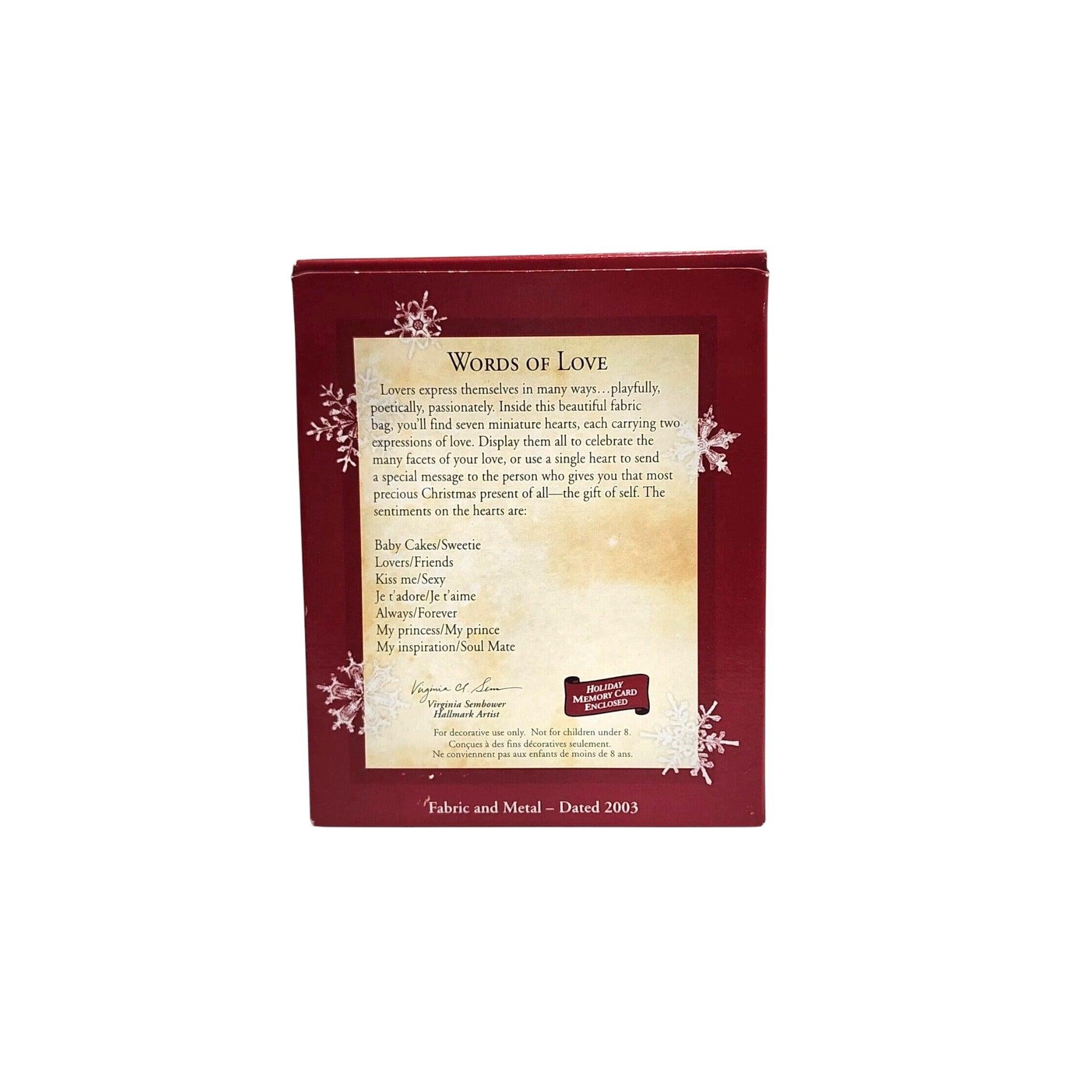 Celebrate love in all its forms with the 2003 “Words of Love” ornament from Hallmark Keepsake collection (model QXG8869). The set features seven miniature metal hearts, each engraved with two heartfelt expressions—like Baby Cakes/Sweetie, My Prince/My Princess, Always/Forever, and more.