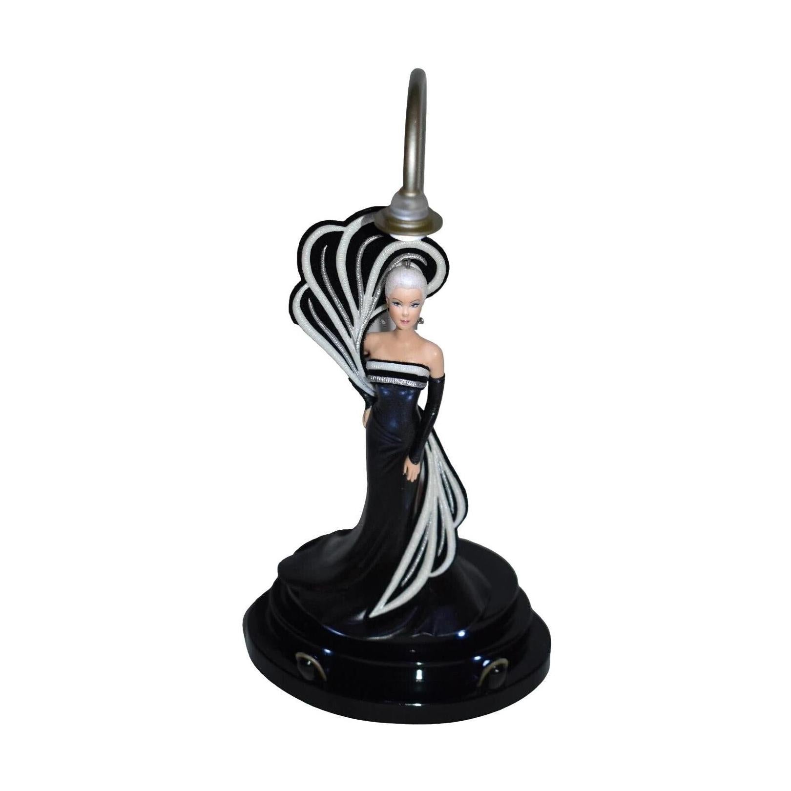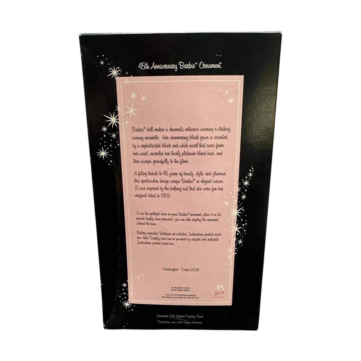 Celebrate nearly half a century of glamour with the 2004 45th Anniversary Barbie Keepsake Ornament. Barbie graces a shimmering black evening gown with a striking black-and-white swirl accent that echoes vintage haute couture. Her platinum blonde hair and poised elegance make this piece a timeless tribute to Barbie’s enduring legacy. It includes a lighted display stand to beautifully showcase the figure’s silhouette and style without needing additional power—just hang it as is.