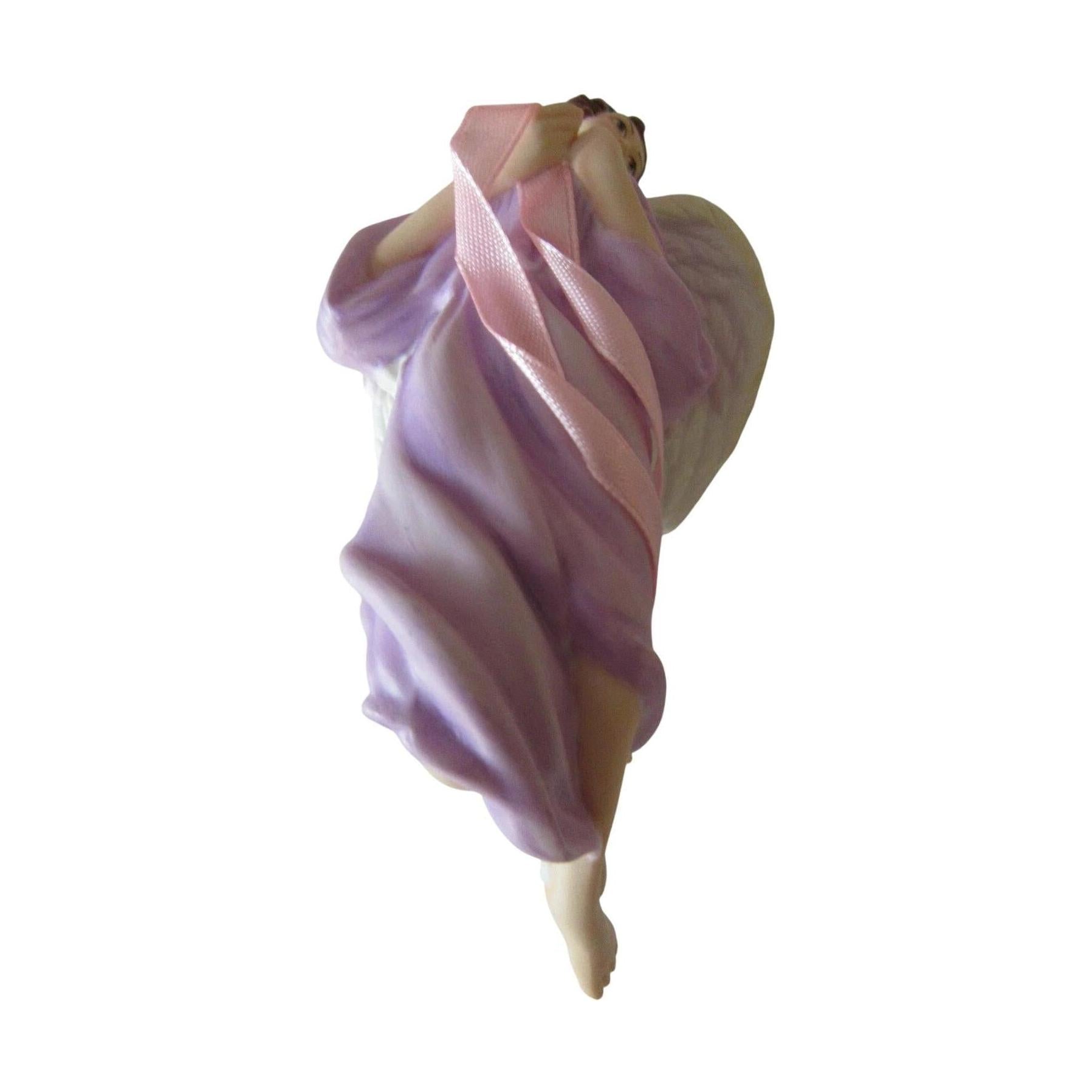 The 2004 Angel of Compassion ornament from Hallmark’s Susan G. Komen Collection showcases a graceful porcelain design that embodies elegance and serenity. This exquisite angel wears a flowing purple gown accented with a pink ribbon motif, complemented by white wings and short brunette hair. A soft pink ribbon completes the look for easy hanging.