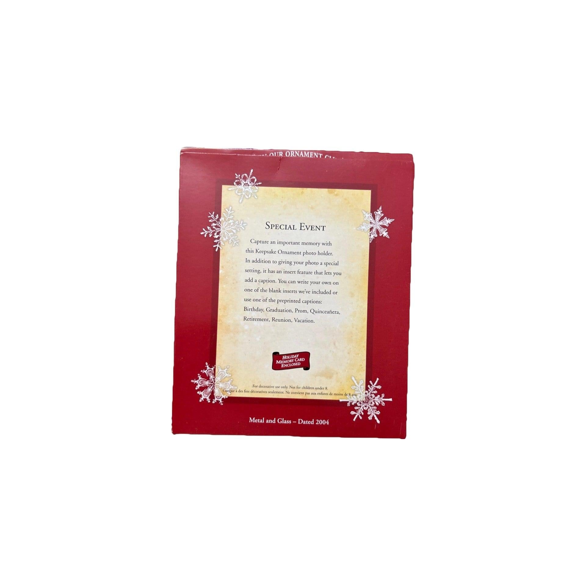 Capture and commemorate milestone moments with the 2004 Special Event photo-holder ornament. Crafted from glass and metal, this elegantly scroll-framed keepsake includes preprinted inserts for occasions like Birthday, Graduation, Prom, Quinceañera, Retirement, Reunion, and Vacation—along with blank inserts for your own personalized captions. It arrives in its original box with a holiday memory card—no power or accessories needed to make your cherished memories shine.