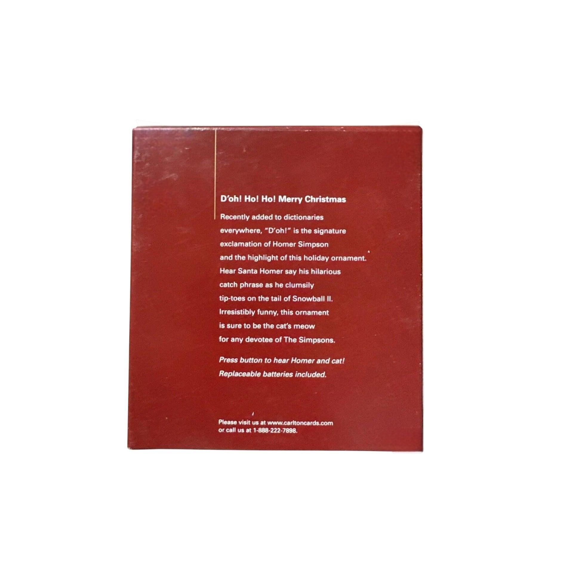 Celebrate holiday cheer with a Springfield style twist: the 2004 The Simpsons “D’oh! Ho! Ho! Merry Christmas” ornament from Carlton Cards. This vibrant collectible features Homer Simpson in festive garb, complete with built-in sound functionality that lets Homer deliver his signature “D’oh!” in a Christmas context. The piece typically includes original retail box packaging and is ready to hang and display.