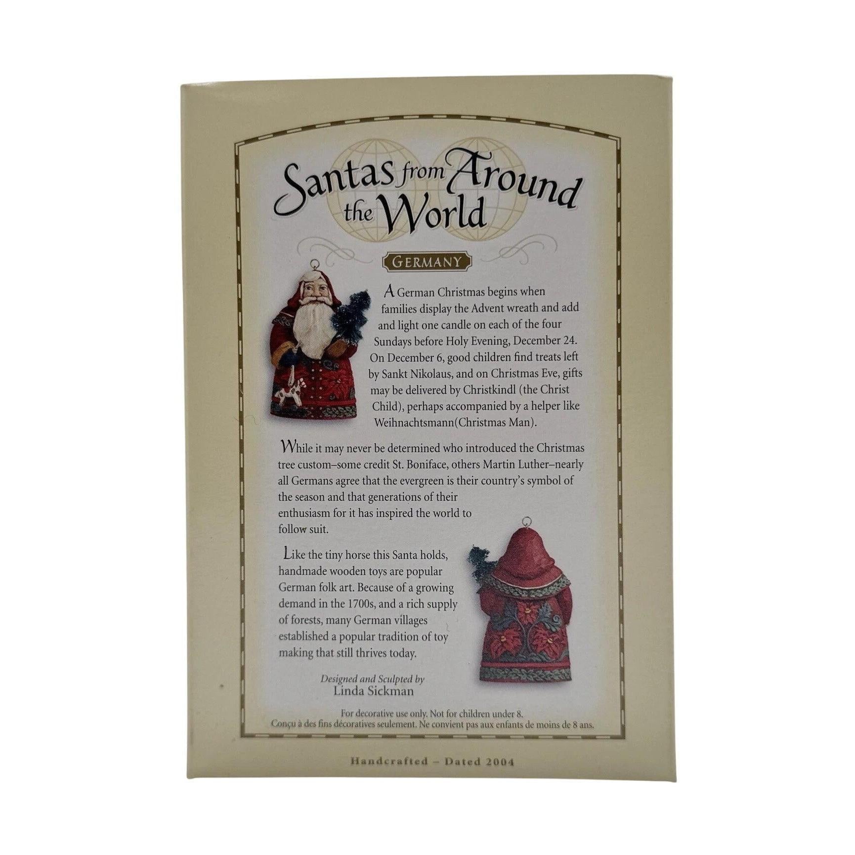 Explore festive traditions from across the globe with Germany, a collectible from Hallmark’s 2004 Santa’s from Around the World series, wearing a crimson poinsettia-trimmed coat and holding a miniature Christmas tree and toy rocking horse. Packaged mint-in-box with original tag, this keepsake requires No Power Needed—ready to hang and bring a touch of German holiday heritage to your decor.