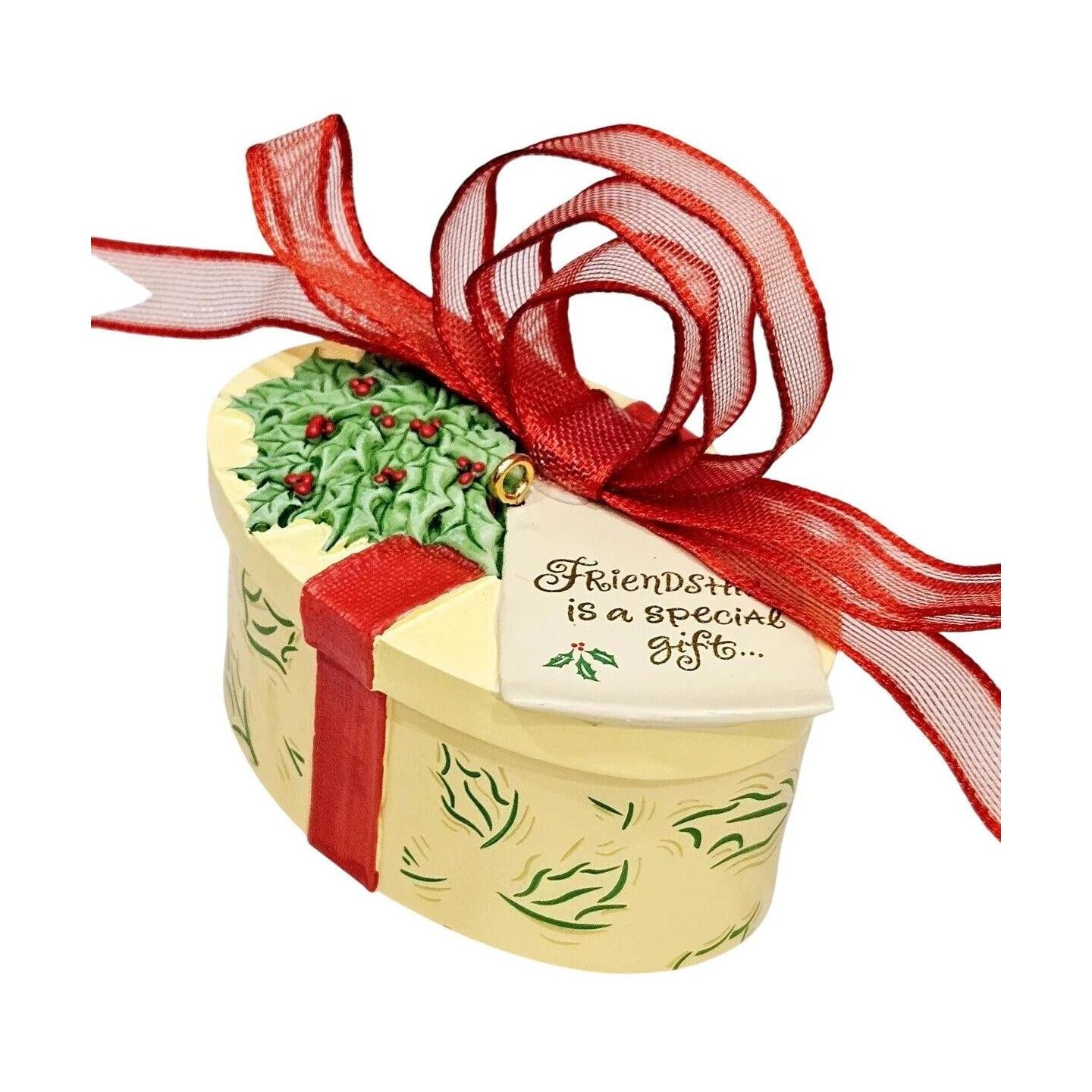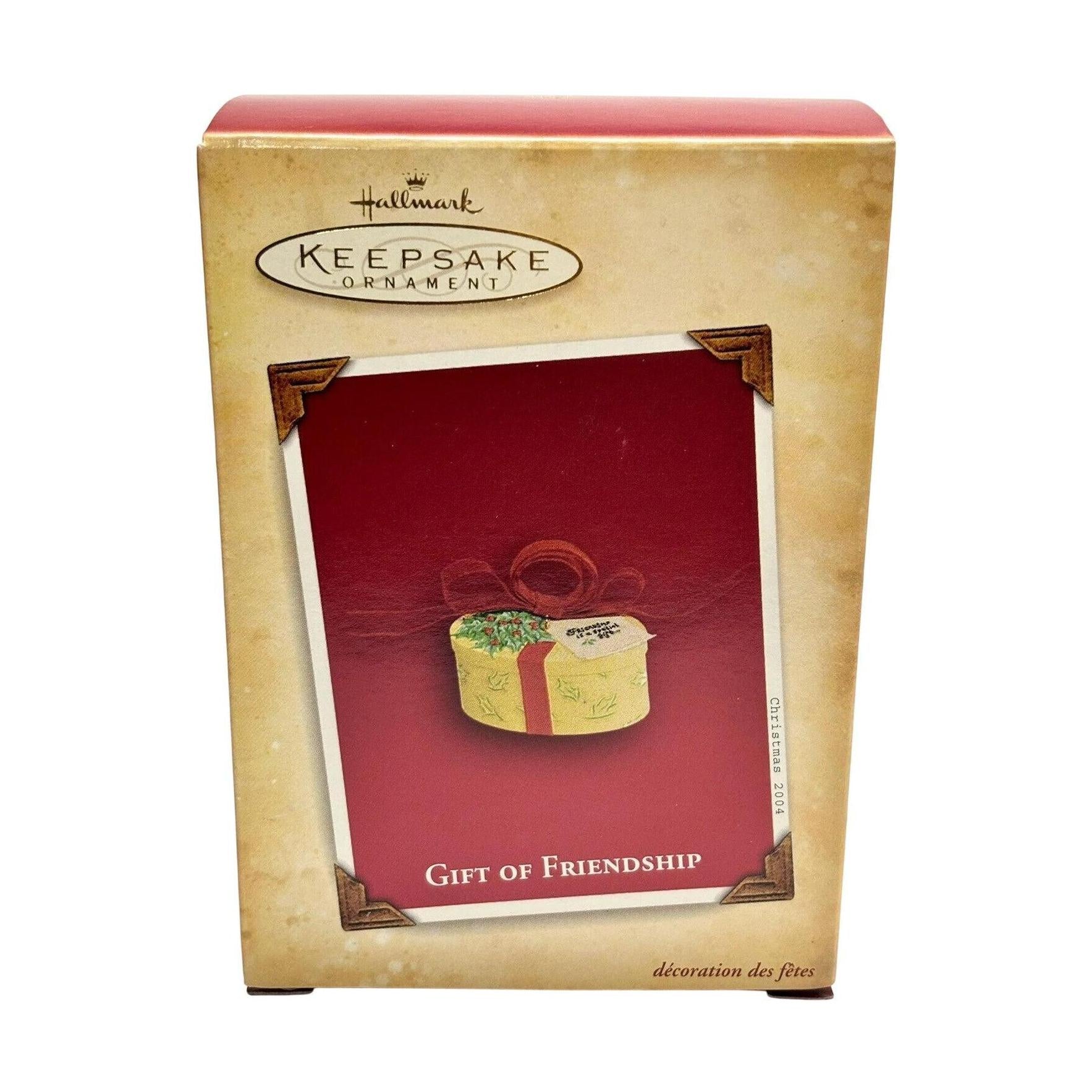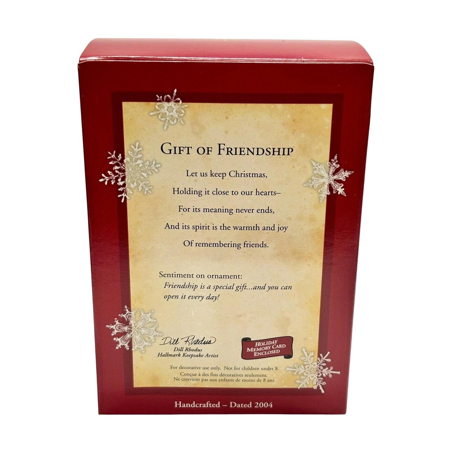 Celebrate the cherished bond of friendship with this 2004 edition from Hallmark Keepsake: Gift of Friendship. The design features a red-wrapped “gift box” motif ornament bearing the sentiment: “Friendship is a special gift… and you can open it every day!” This keepsake is painted in warm holiday tones, finished in mixed-media with a hinged box-style form, making it both decorative and meaningful. Its compact size (approximately 4″ wide) makes it a thoughtful piece for gifting, honoring a dear friend, or adding to any “friends & family” themed collection.