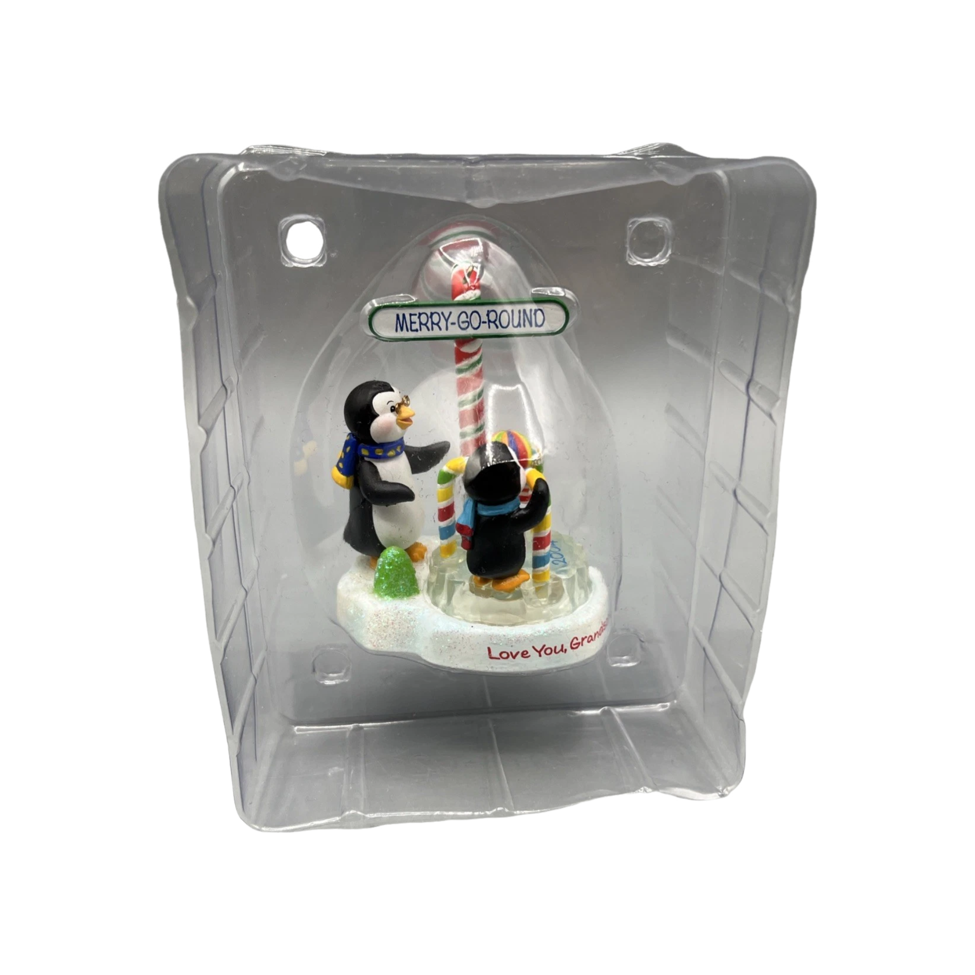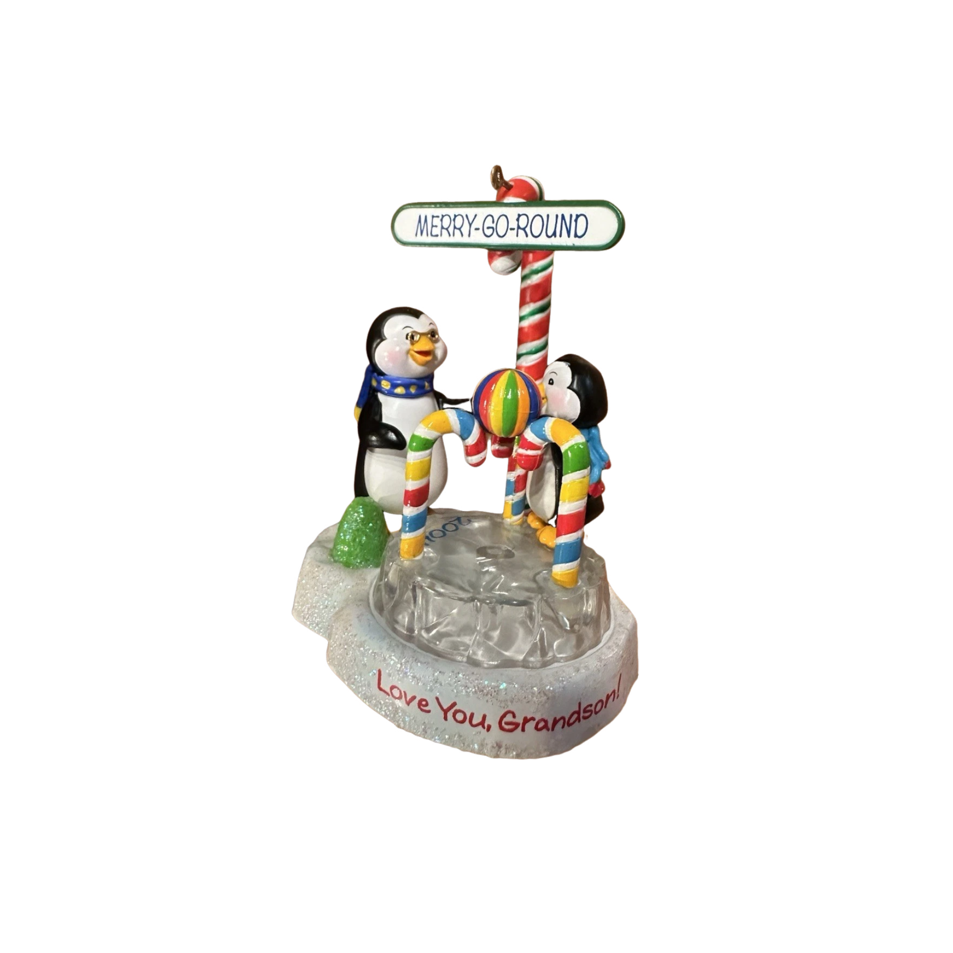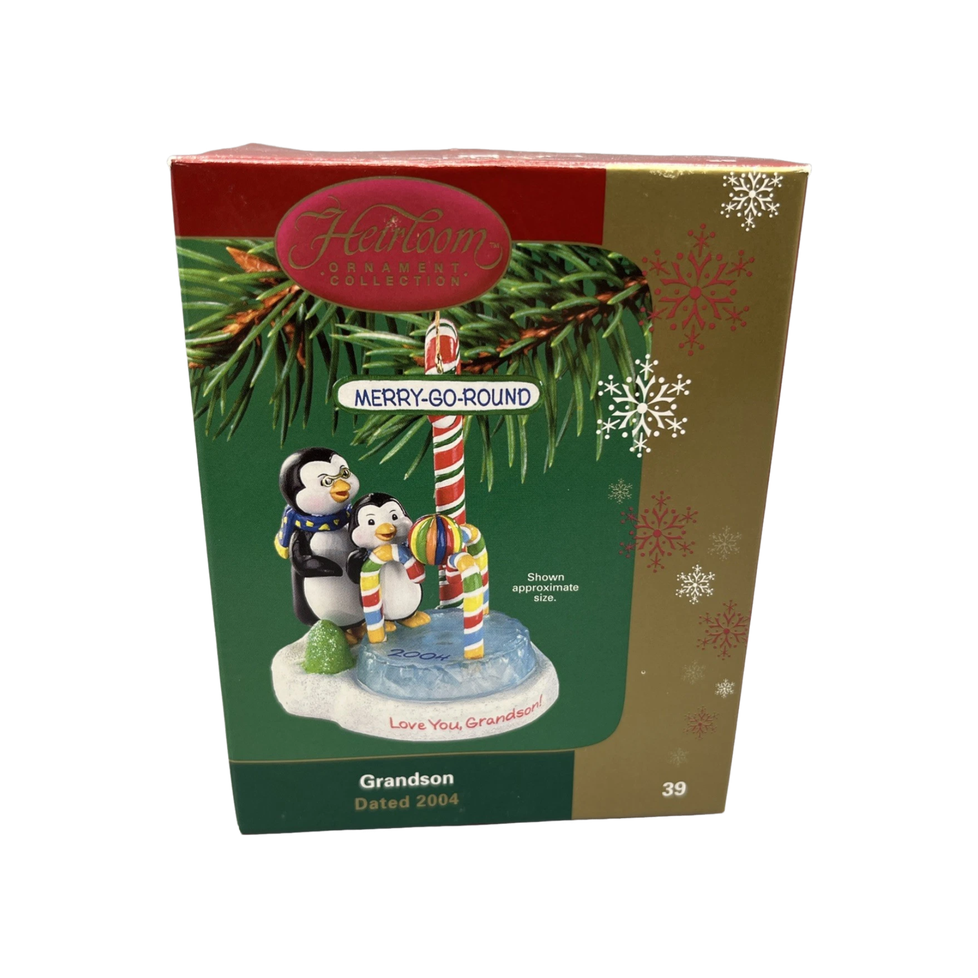 This 2004 Heirloom-series ornament celebrates the special role of a grandson in a charming animal-themed design. The piece features a grandparent animal—likely a proud bear, rabbit or similar—holding or standing beside a younger animal figure labelled “GrandSon,” etched into the design or on a plaque. Rendered in molded resin/ plastic with soft detailing and cheerful holiday colour accents, this keepsake piece brings both familial affection and classic holiday charm to any tree or collection. Ideal for grandchildren-gift trees, animal-themed collections or nostalgic décor with a warm personal message.