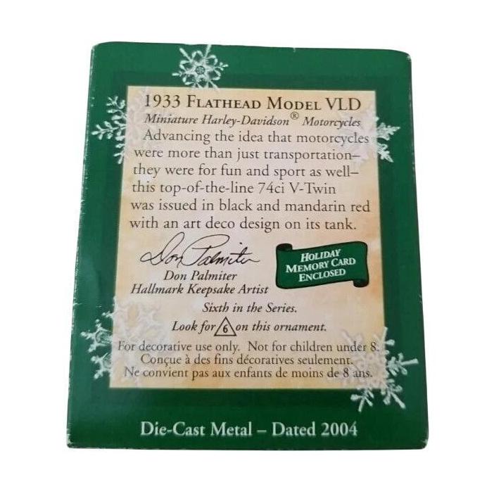 Start your miniature collection with a historic classic. The 2004 Hallmark Keepsake miniature, 1933 Flathead Model VLD, is the sixth entry in the Mini Harley‑Davidson Motorcycles series. Celebrating one of Harley’s iconic powerhouses, this die-cast replica captures the machine's artful design, complete with bold black and mandarin-red paintwork and signature Art Deco detailing on the fuel tank. Crafted by the talented Don Palmiter, this compact model (just about 1″ wide) is fully decorative—no batteries, cords, or setup required. It’s an evocative keepsake ideal for shelves, dashboards, or festive décor.