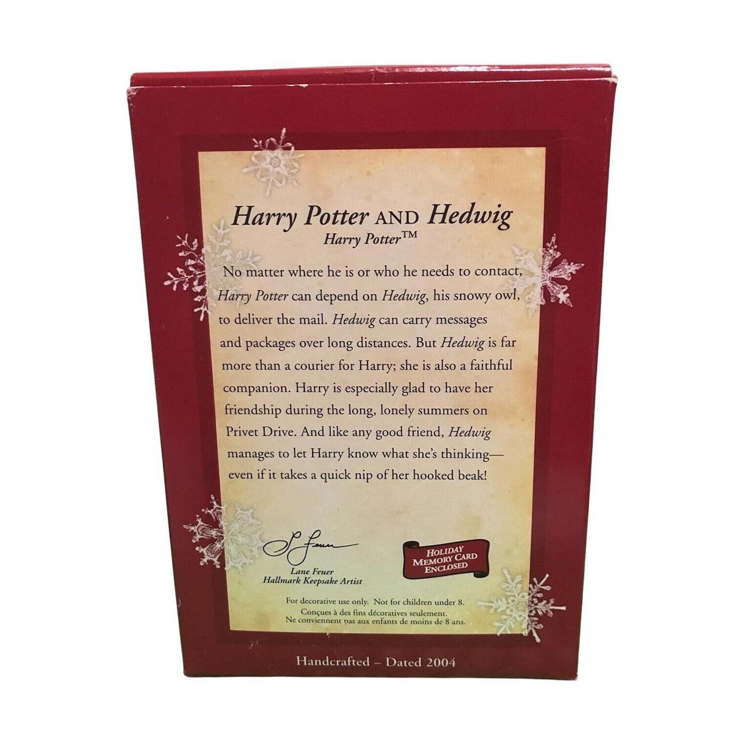 This 2004 Hallmark ornament set features Harry Potter and his faithful snowy owl, Hedwig, as separate sculpted resin figures—Harry standing 4″ tall and Hedwig measuring about 3″ wide. Created by artist Lane Feuer, each piece is intricately hand-painted to capture the magical bond between wizard and owl. Packaged in its original red Keepsake box with tag and holiday memory card, this collectible requires No Power Needed, making it ready to hang right from the packaging.
