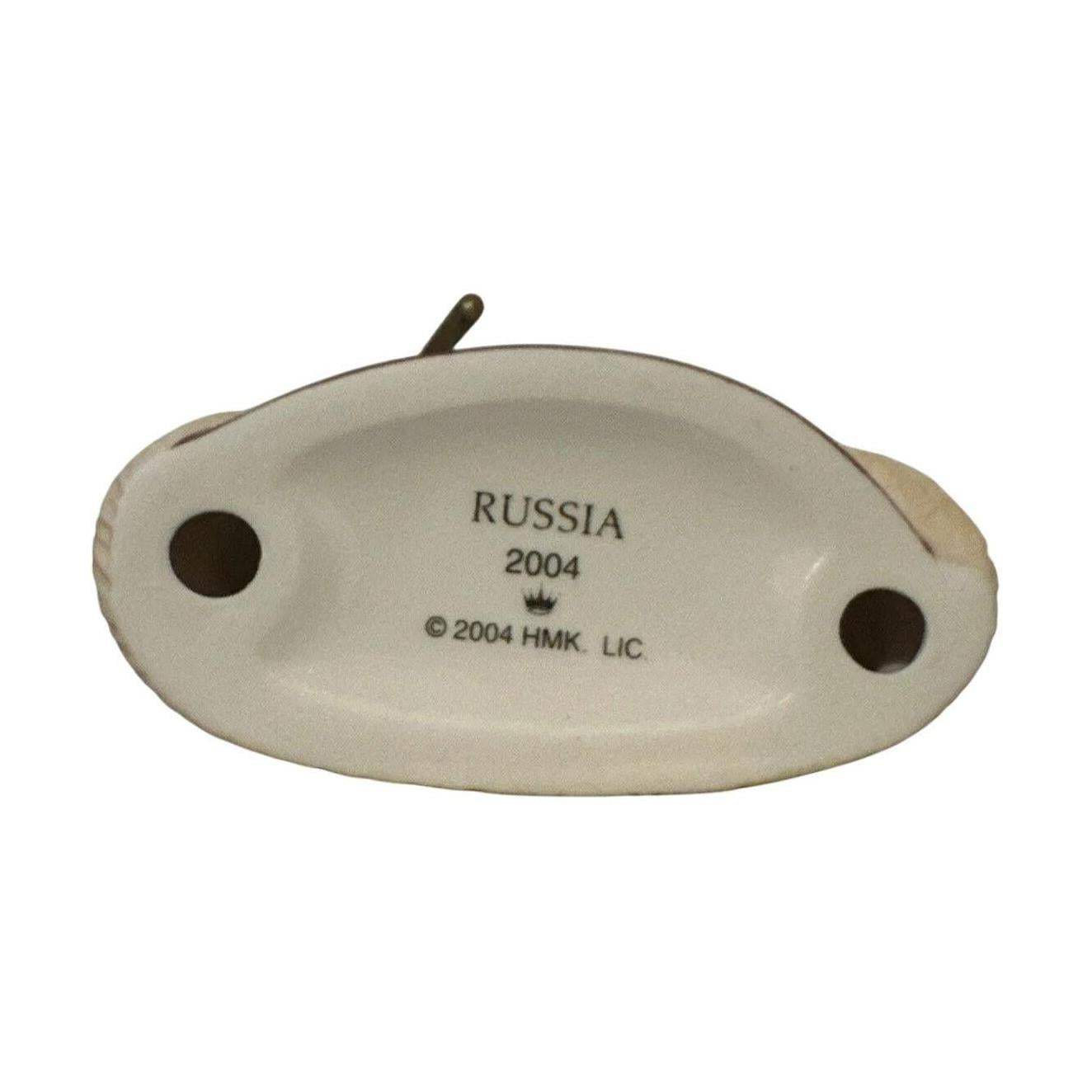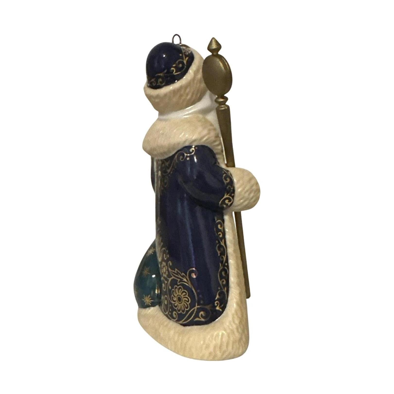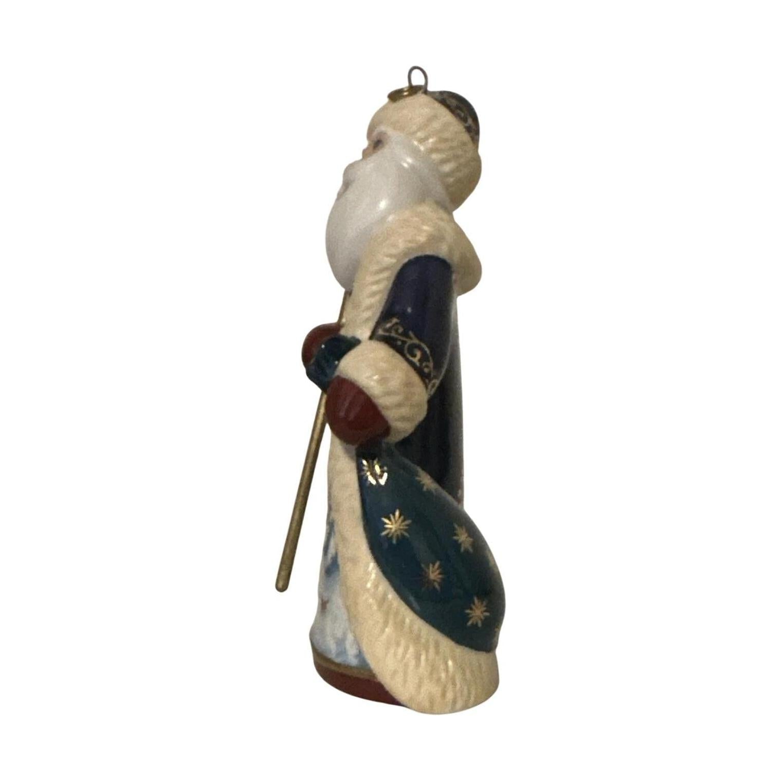 Embark on a global Christmas journey with Russia, from Hallmark’s 2004 Santa’s from Around the World series. This stunning porcelain Santa is beautifully dressed in a cobalt-blue coat with luxurious fur trim, featuring a snowy cottage—complete with cardinals and pine trees—hand-painted across the front. He holds a golden staff and is topped with a plush fur hat. Mint-in-box with original tag, this keepsake arrives ready to hang—no batteries or cords needed.