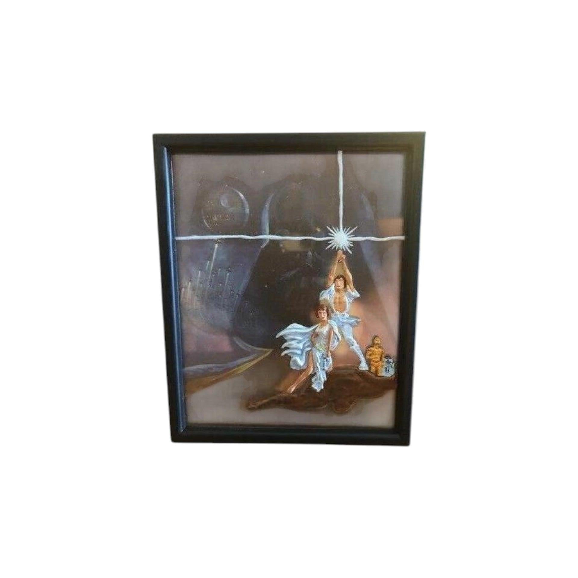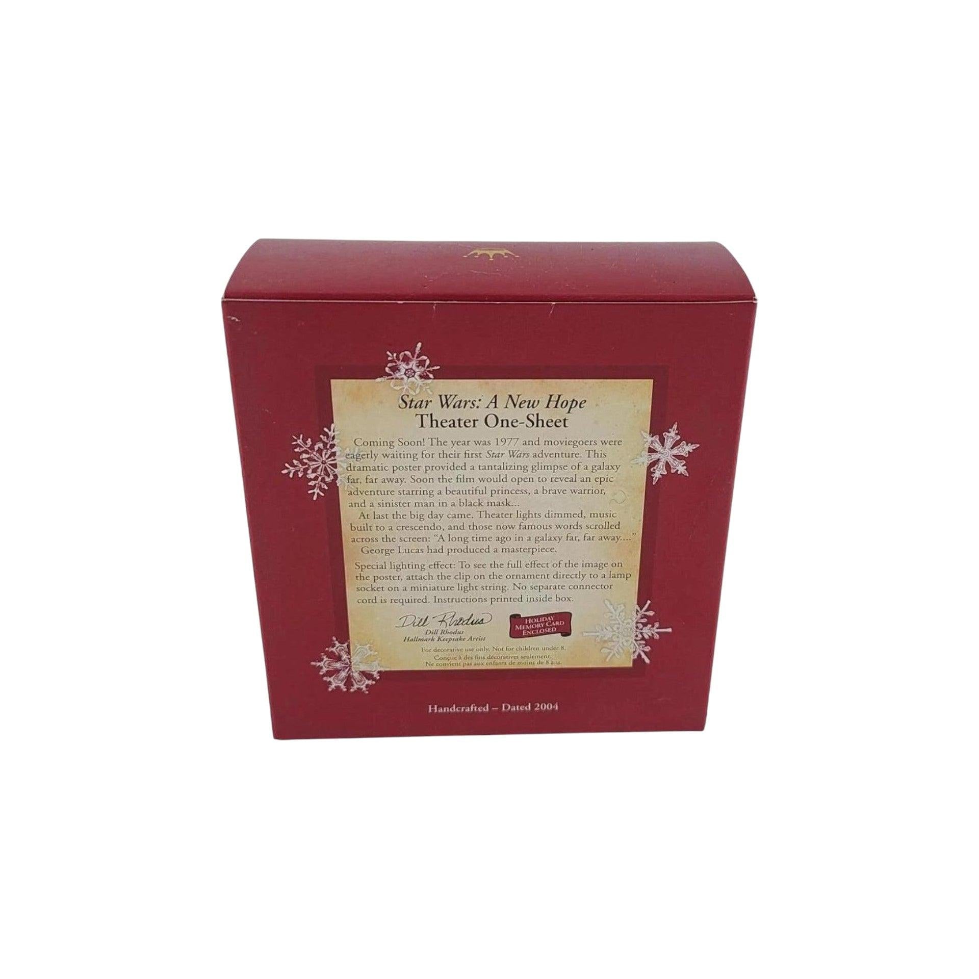 This 2004 edition of the Hallmark Keepsake ornament celebrates the original star-wars film with a stylised recreation of the “theater one-sheet” poster for Star Wars: A New Hope. The rectangular ornament captures iconic characters—such as Darth Vader and Princess Leia—in vibrant pop-art style, and includes a clip at the top enabling optional illumination when mounted on a miniature light string. Designed by artist Dill Rhodus, this piece blends cinematic nostalgia with holiday décor.