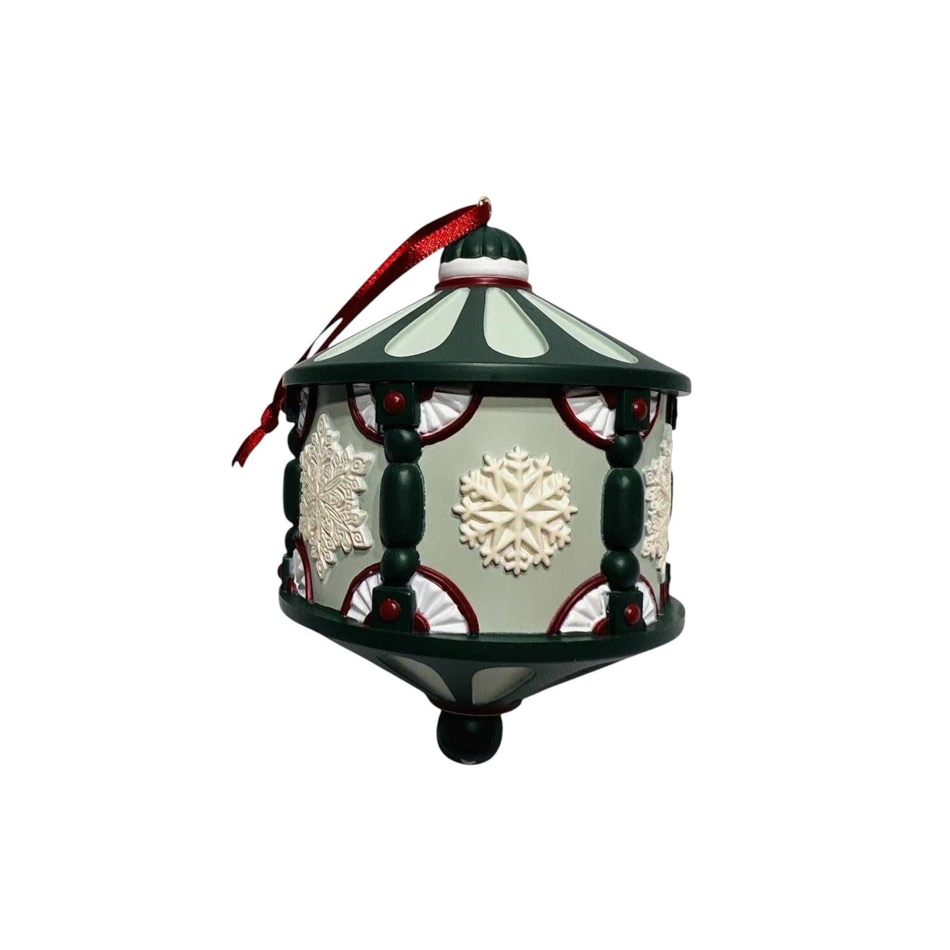 Relive the cozy charm of a snow-lit Victorian evening with the 2004 Victorian Christmas ornament from Thomas Kinkade’s Painter of Light series. This “Magic” Keepsake piece invites you to turn the knob on the bottom to see three different Thomas Kinkade paintings scroll by in the viewing portal. The scenes include a stone mansion with lanterns glowing, children sledding down a hill, and a horse-drawn carriage traveling through the snow-covered street.