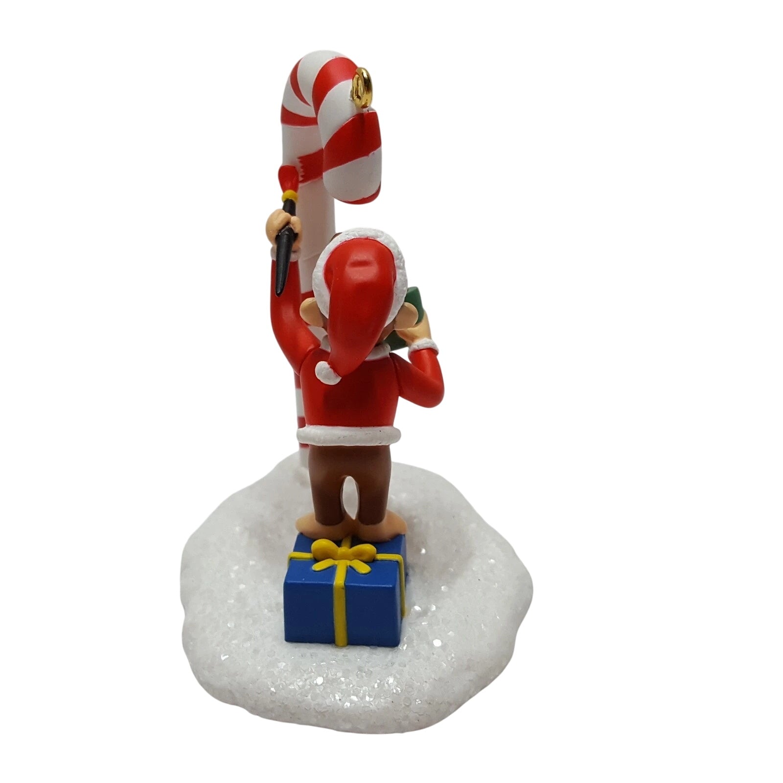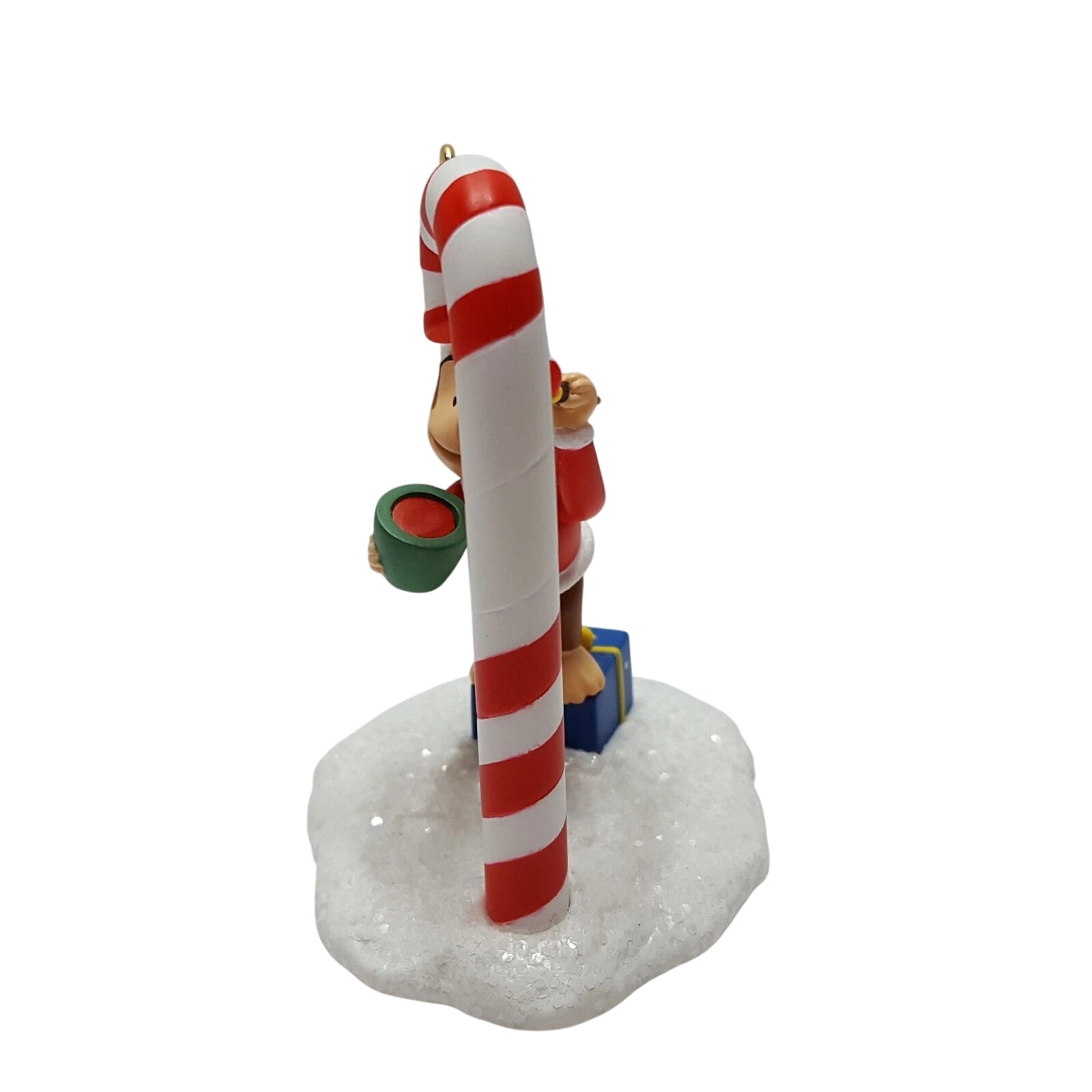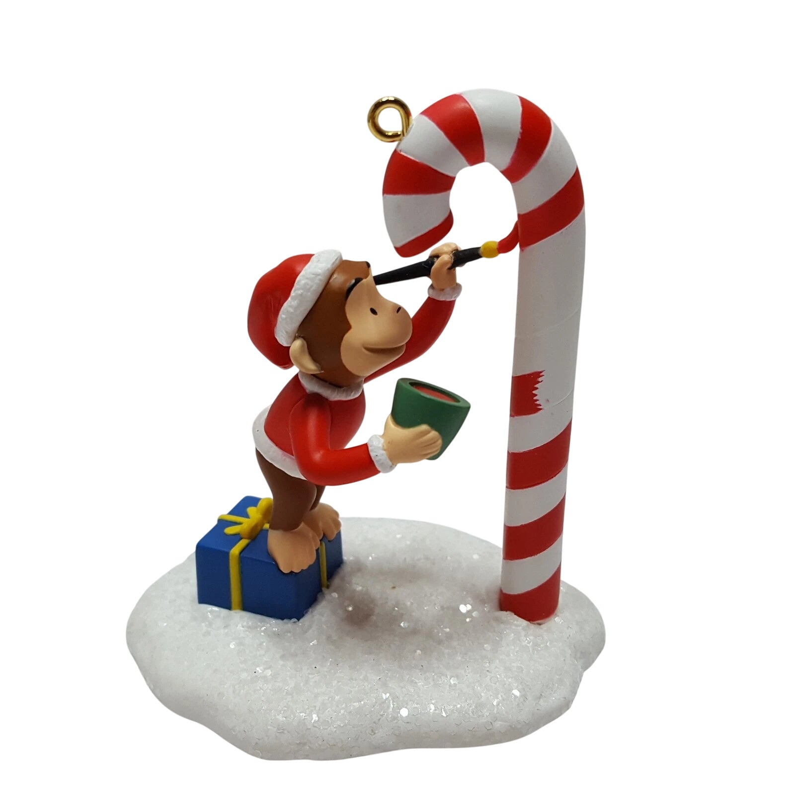 Celebrate the mischievous charm of Curious George with the 2005 edition of the Hallmark Keepsake Ornament (SKU QXI6222). George is depicted wearing a Santa hat and festive sweater, standing atop a brightly wrapped present as he paints bold red stripes on a giant candy cane—his antics turning even the tree into a work of holiday art. Crafted in vibrant mixed media with expressive detail, the design captures both the child-like creativity of George and the joy of Christmas mischief. Ideal for fans of the classic book/TV character, collectors of licensed animation ornaments, or anyone seeking a playful holiday keepsake with a nostalgic twist.