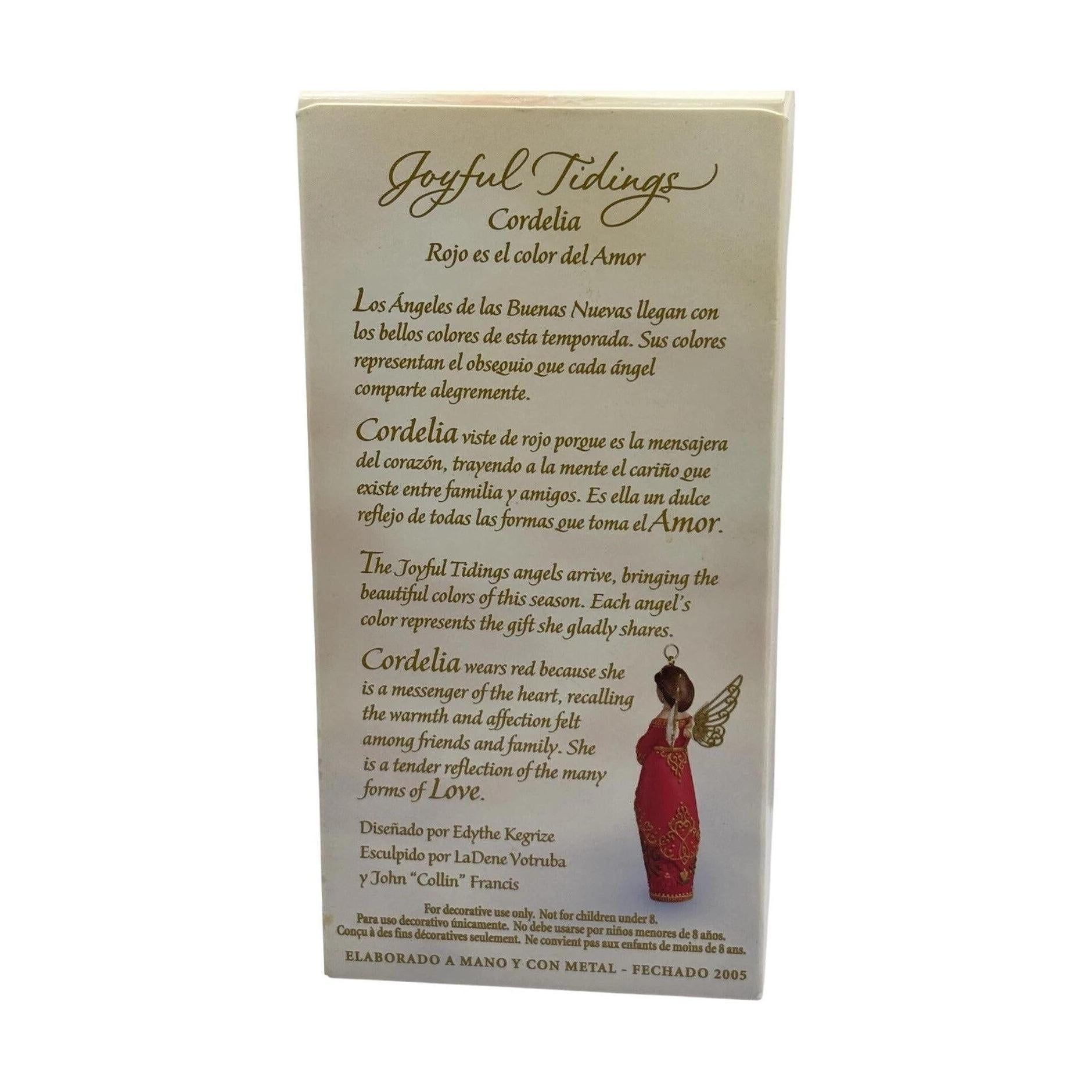 This 2005 edition from the Hallmark Keepsake “Joyful Tidings” collection features the angel Cordelia in a rich red design symbolizing love. The ornament is handcrafted and metal-based, part of the series where each angel represents a specific color and its meaning. Designed by artist Edythe Kegrize, and sculpted by LaDene Votruba & John “Collin” Francis. With its symbolic motif, this piece is a thoughtful choice for collectors of themed angel ornaments, red-color series, or those seeking a meaningful holiday keepsake emphasizing love.