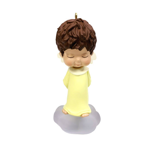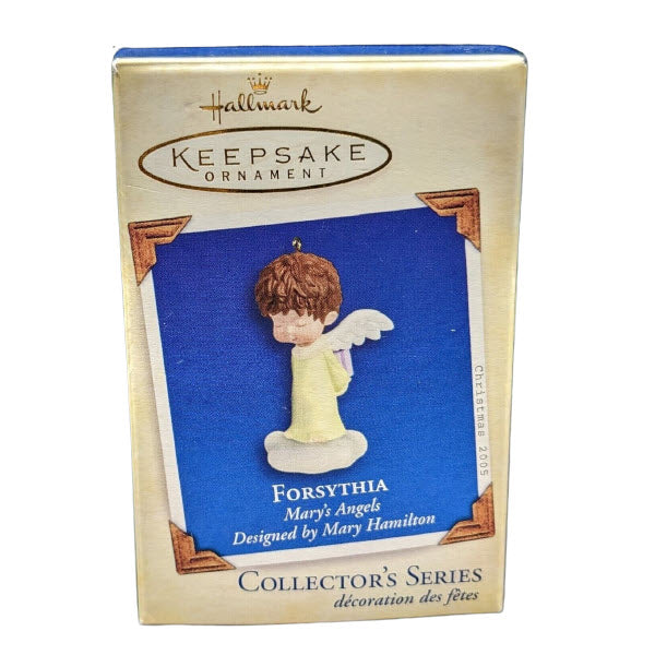 Meet Forsythia, the 18th angel in Hallmark’s cherished Mary’s Angels collection, first released in 2005. This sweet miniature ornament portrays a contemplative angel standing atop a fluffy cloud, wearing a light yellow gown and holding a neatly wrapped gift—symbolic of her hopes for peace on earth and holiday joy Mint‑in‑box sets typically include the ornament, original collector’s box, and hanging loop—purely decorative, requiring no power, batteries, or cords