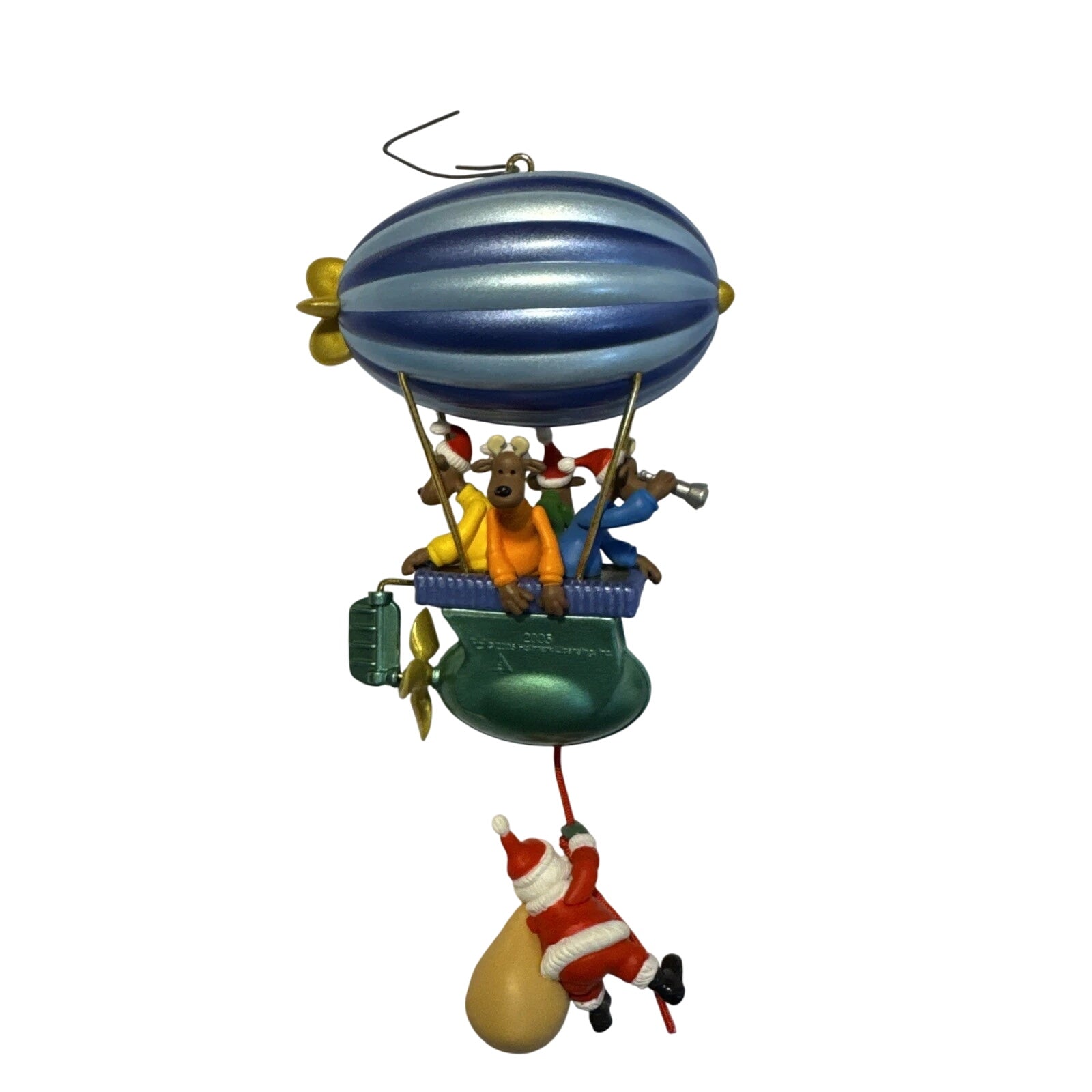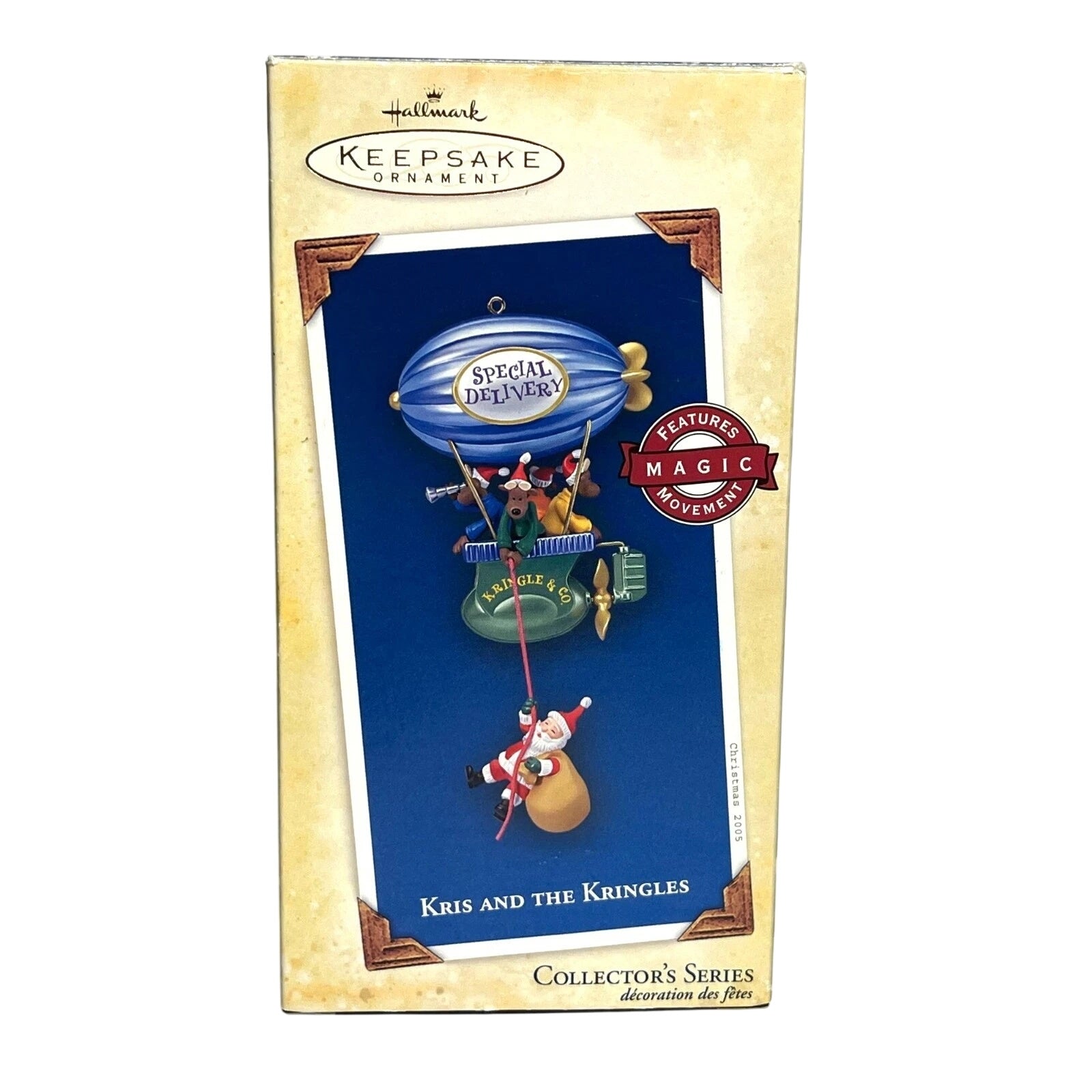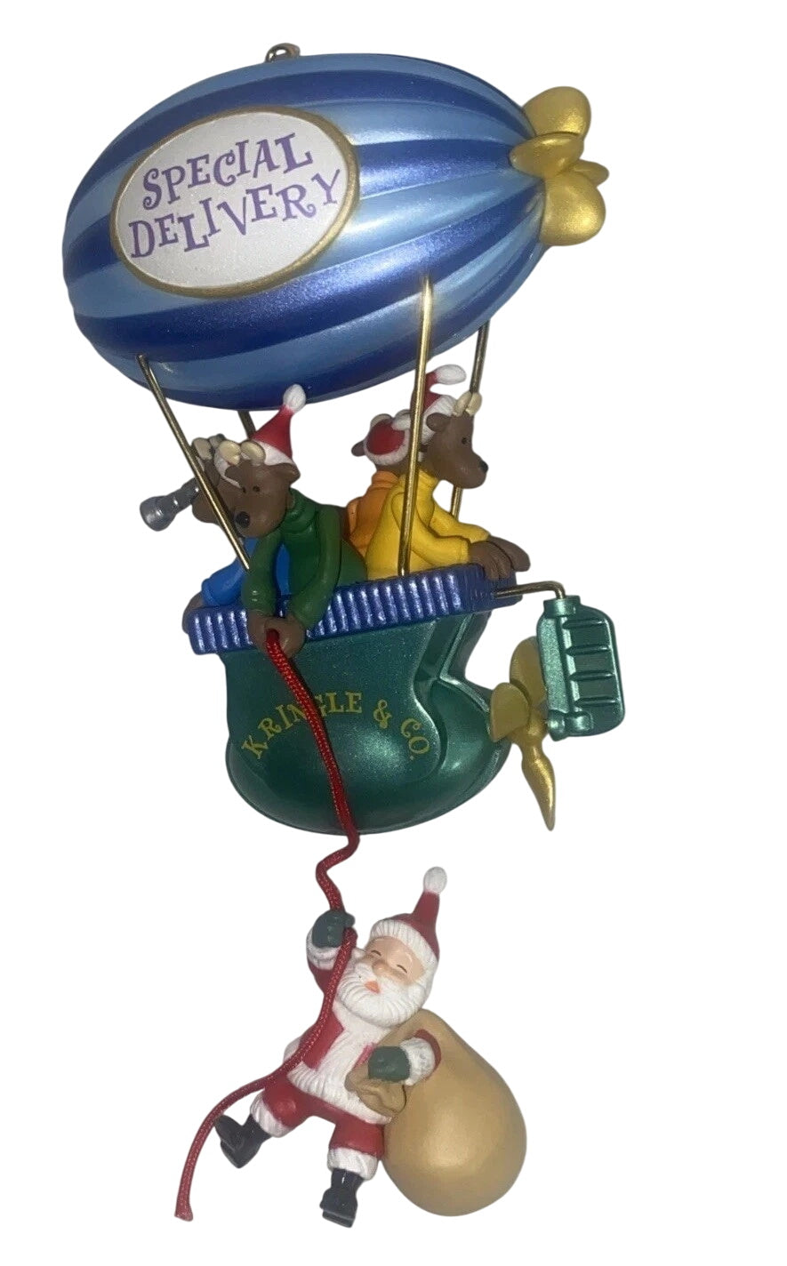 This spirited finale rounds out Hallmark’s Kris and the Kringles series with a playful, wind-up “magic” ornament. In 2005 Kris and the Kringles, Santa lifts off toward a blimp holding his reindeer with a simple pull of the cord—no batteries required! Crafted by Ken Crow, this piece is beautifully detailed and designed to bring motion to your holiday décor. The ornament stands approximately 6″ tall and arrives Mint-in-Box, making it a perfect collector’s centerpiece.