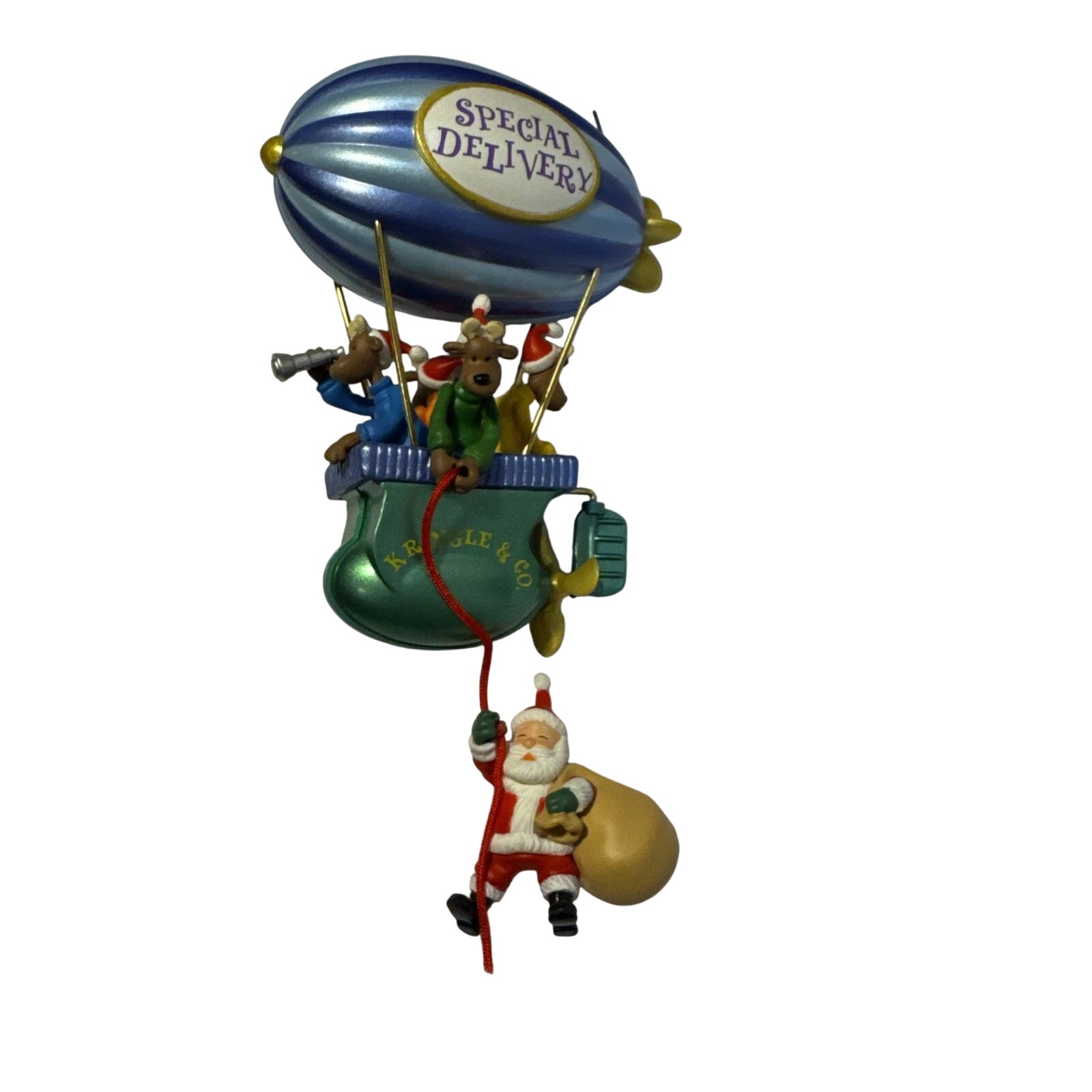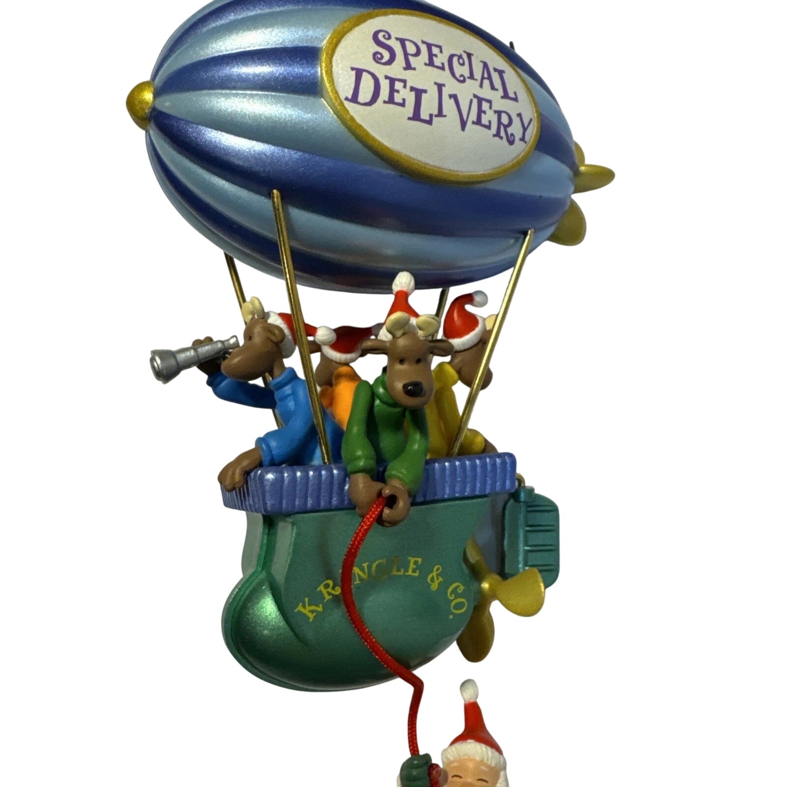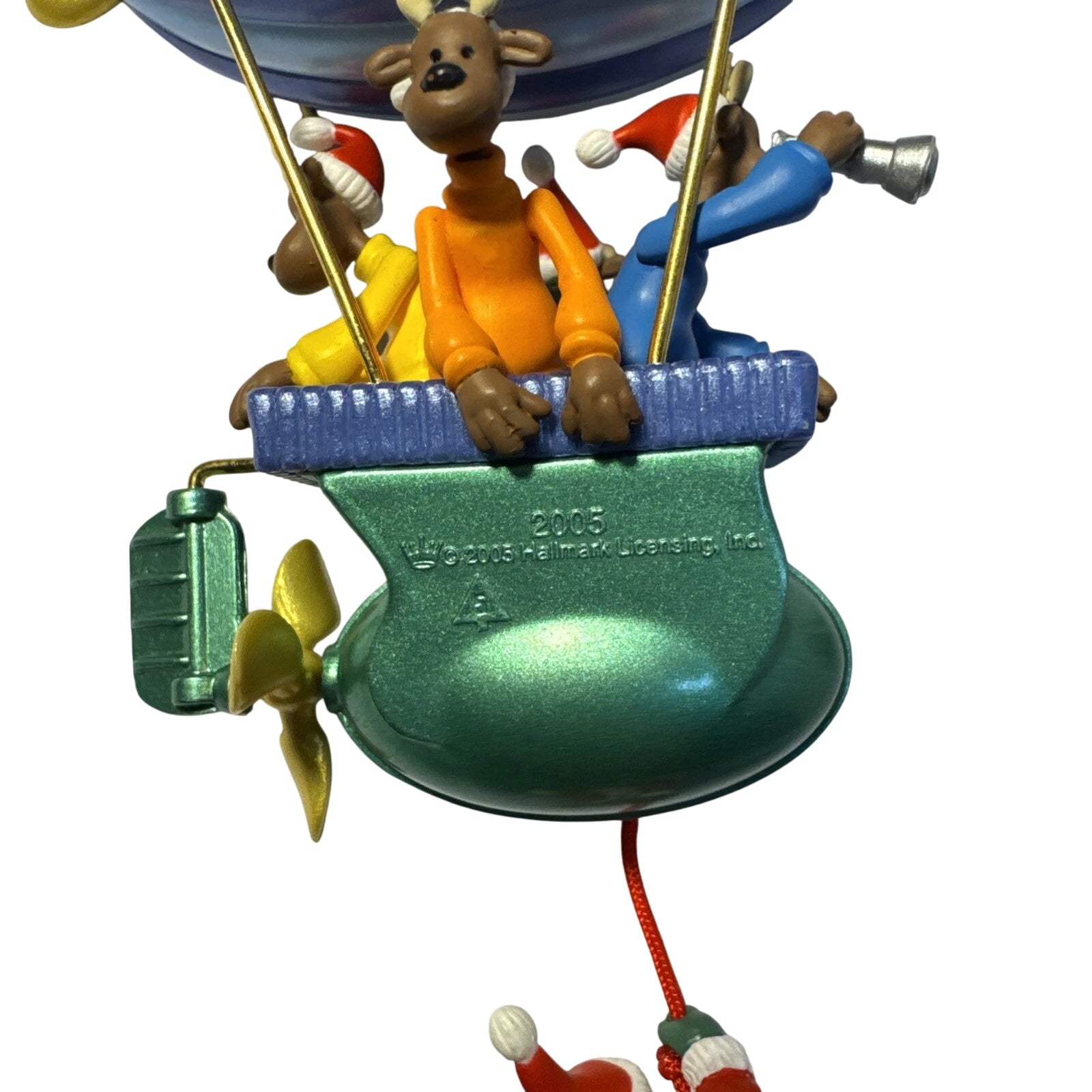 This spirited finale rounds out Hallmark’s Kris and the Kringles series with a playful, wind-up “magic” ornament. In 2005 Kris and the Kringles, Santa lifts off toward a blimp holding his reindeer with a simple pull of the cord—no batteries required! Crafted by Ken Crow, this piece is beautifully detailed and designed to bring motion to your holiday décor. The ornament stands approximately 6″ tall and arrives Mint-in-Box, making it a perfect collector’s centerpiece.