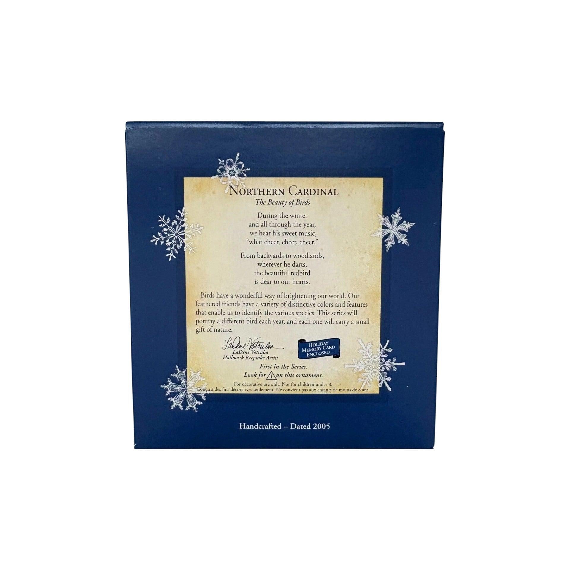 This beautiful Hallmark ornament from the Beauty of Birds series features a Northern Cardinal, one of the most cherished symbols of winter and the holiday season. Sculpted with lifelike detail and rich red coloring, the ornament captures the elegance and vibrant presence of this beloved songbird. Often associated with warmth, remembrance, and hope, this piece makes a timeless keepsake for bird lovers and nature-inspired décor collections. It comes packaged in its original Hallmark Keepsake box with hang tag and does not require batteries, cords, or light strings for display.