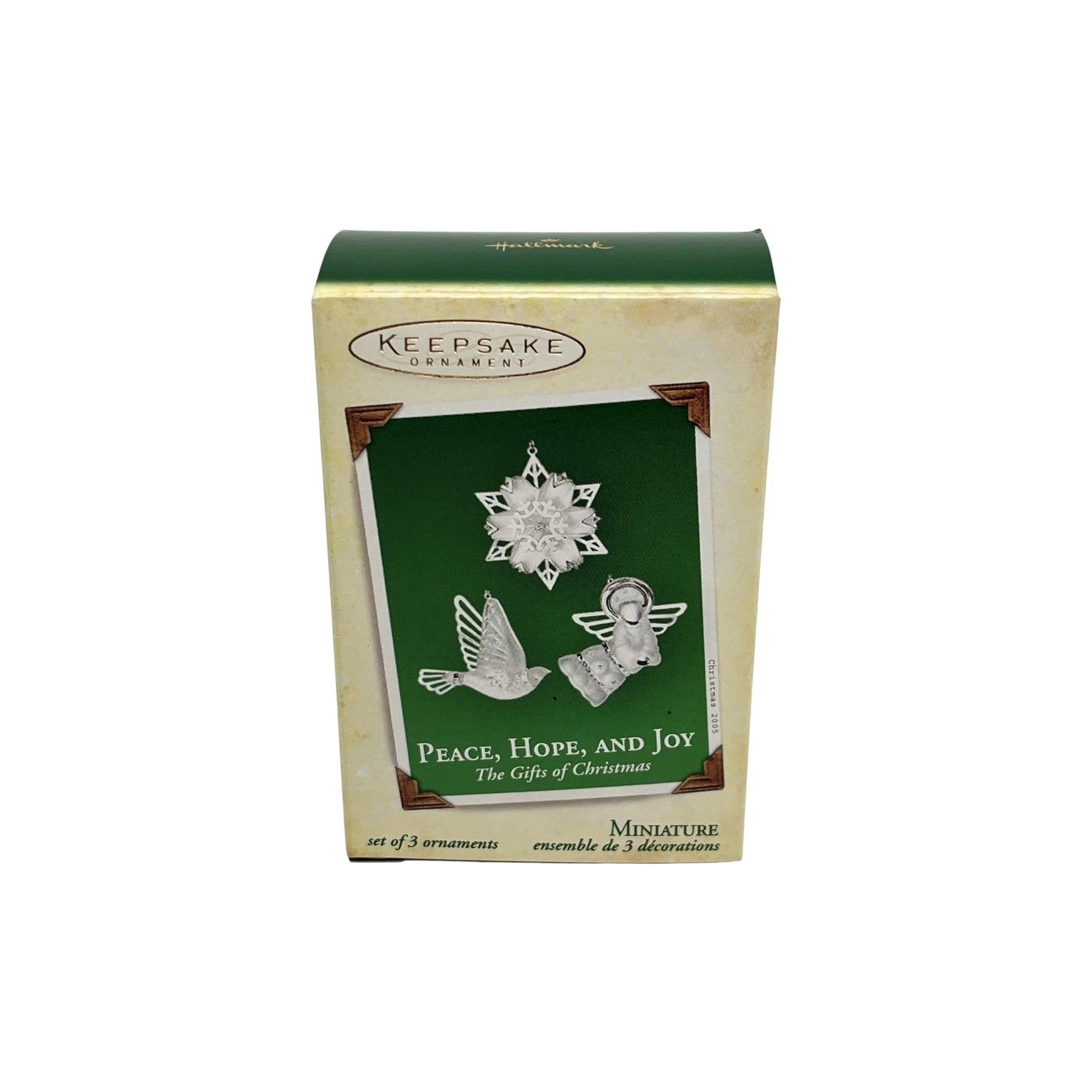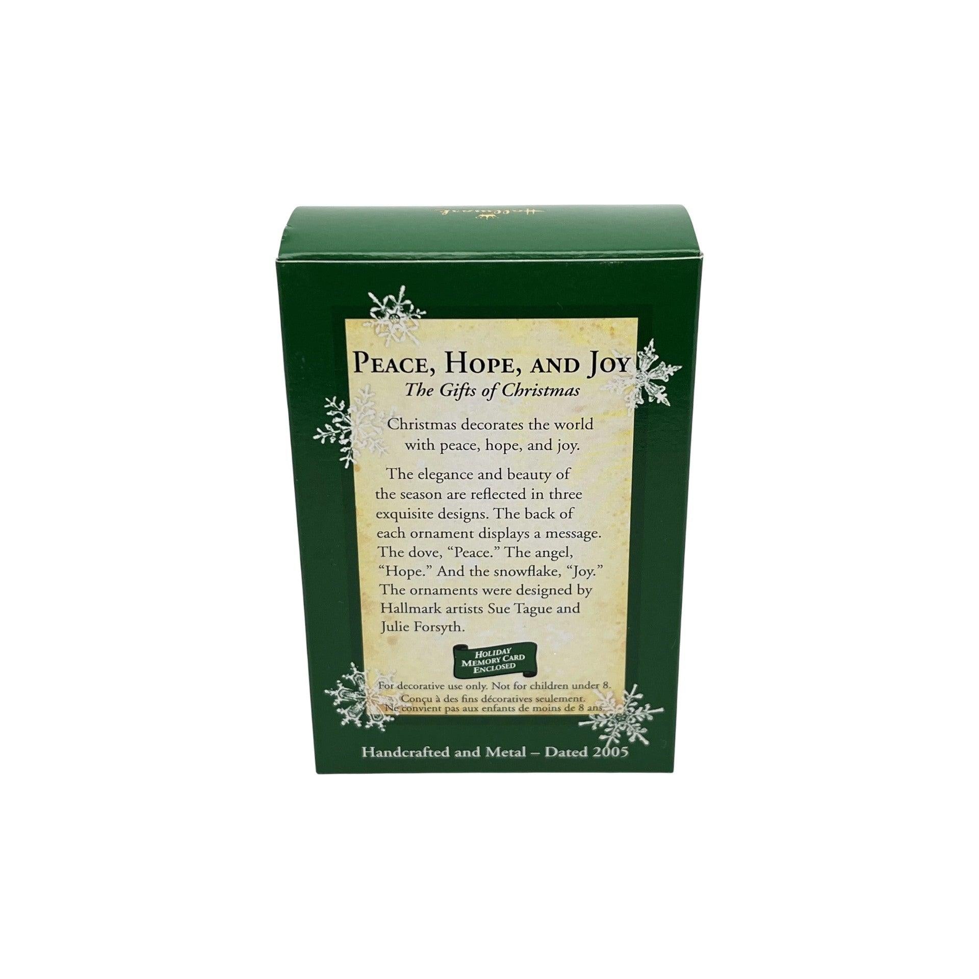 Share a timeless message of faith and comfort with Peace, Hope, and Joy, a beautifully symbolic angel ornament from Hallmark. Introduced in 2005, this elegant design features a serene angel adorned with graceful details that represent the enduring values of peace, hope, and joy at the heart of the Christmas season. With its soft colors and inspirational theme, this ornament makes a meaningful keepsake for angel collectors, faith-based décor, or as a heartfelt gift. The ornament comes packaged in its original Hallmark Keepsake gift box with packaging materials. This ornament is decorative only and does not require batteries, cords, or light strings.