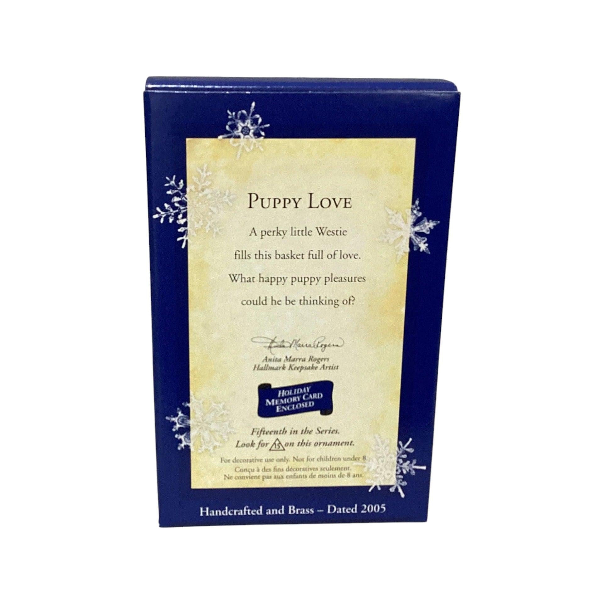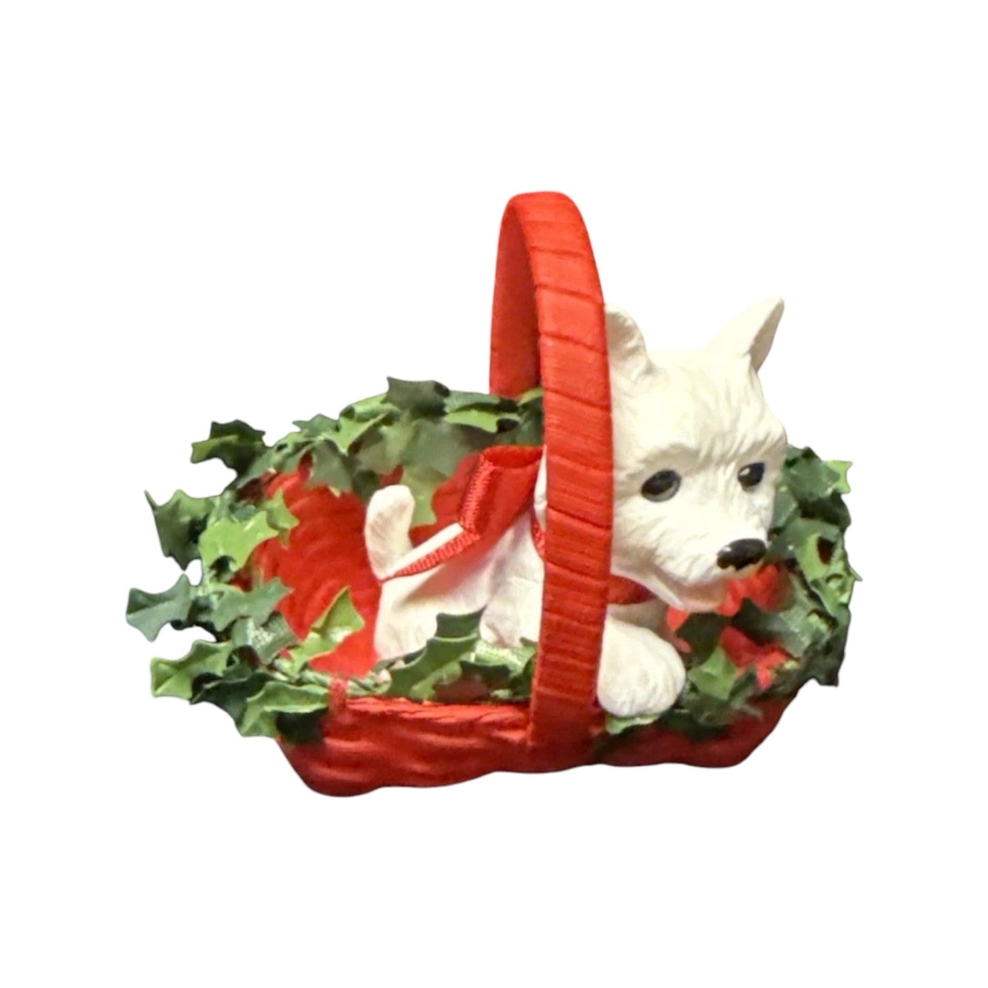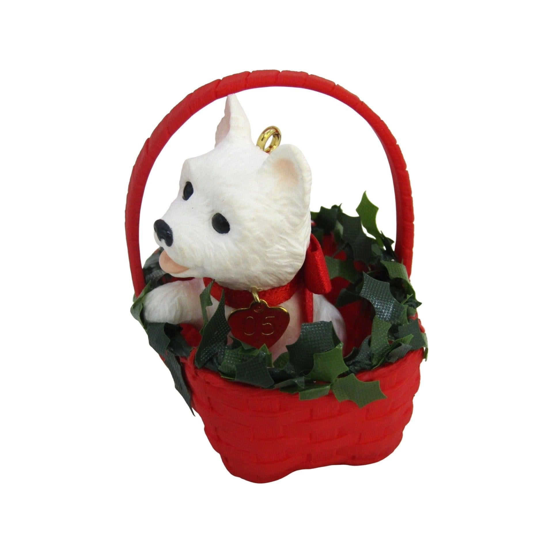Add a Basket-full of holiday cheer with the 2005 Westie (Puppy Love) ornament — the 15th release in Hallmark’s Puppy Love series. The design features a perky West Highland Terrier (“Westie”) puppy nestled in a red basket accented with holly, complete with a heart-shaped brass tag stamped “05”. The ornament is handcrafted, and typically sold in its original box (box condition may vary).