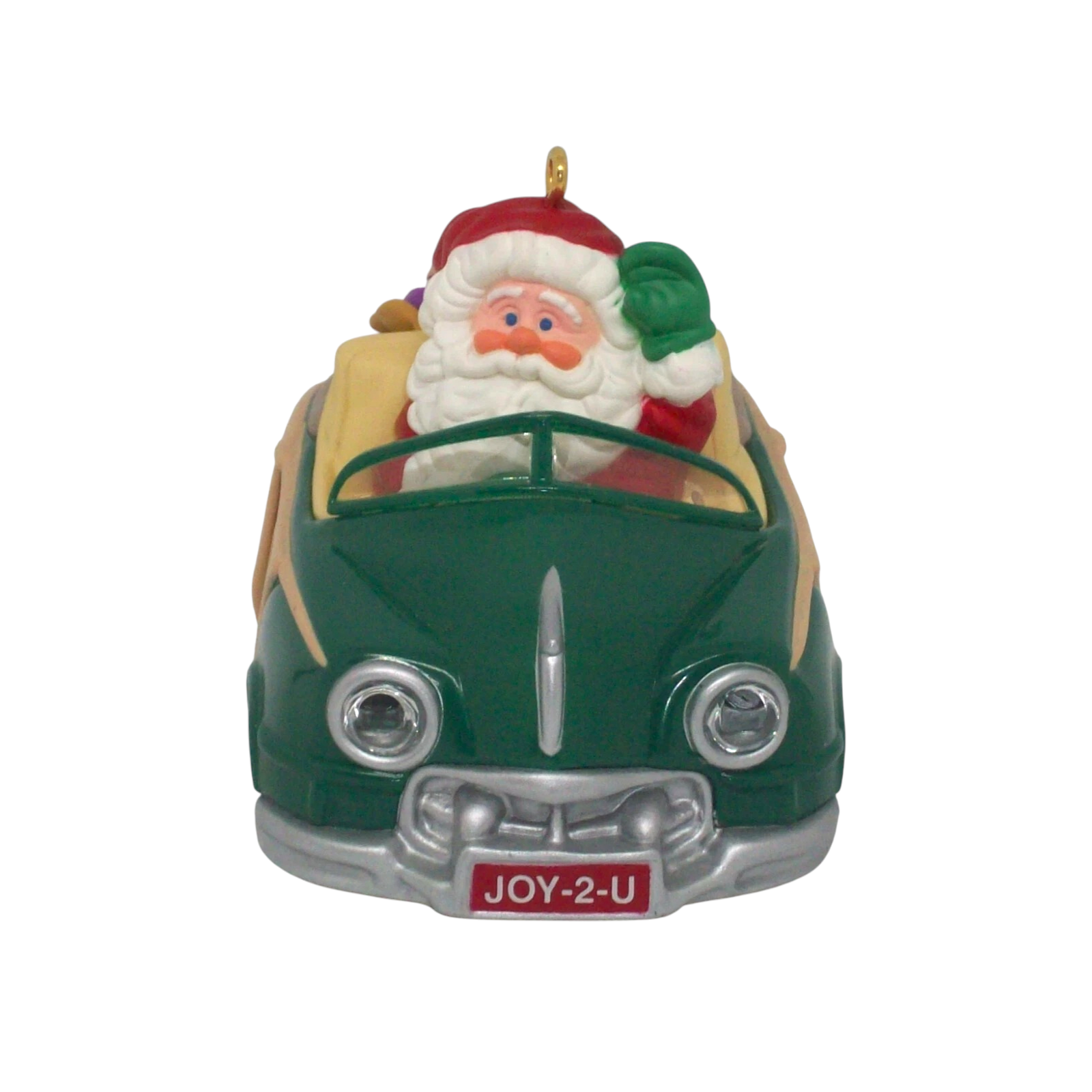 Bring a dash of retro charm to your holiday tree with the 2005 Here Comes Santa (1987 Woody – Special Edition). This special-edition ornament features Santa behind the wheel of a classic green “Woody” station wagon, piled high with gifts and labeled “JOY‑2‑U.” Perfect for collectors and vintage decor lovers, it comes mint-in-box with the original packaging and hanging tag. No batteries or cords needed—simply hang and enjoy the timeless design.