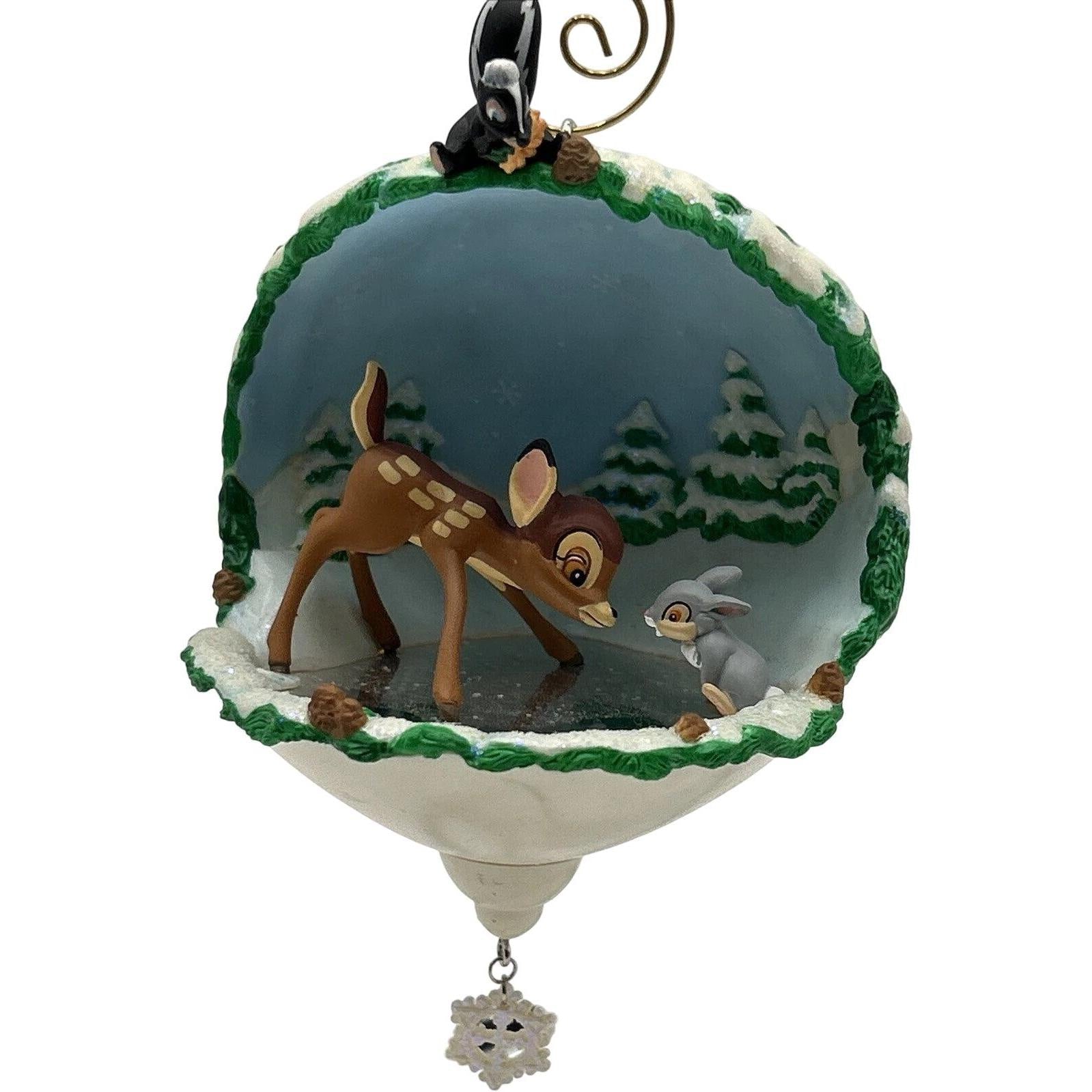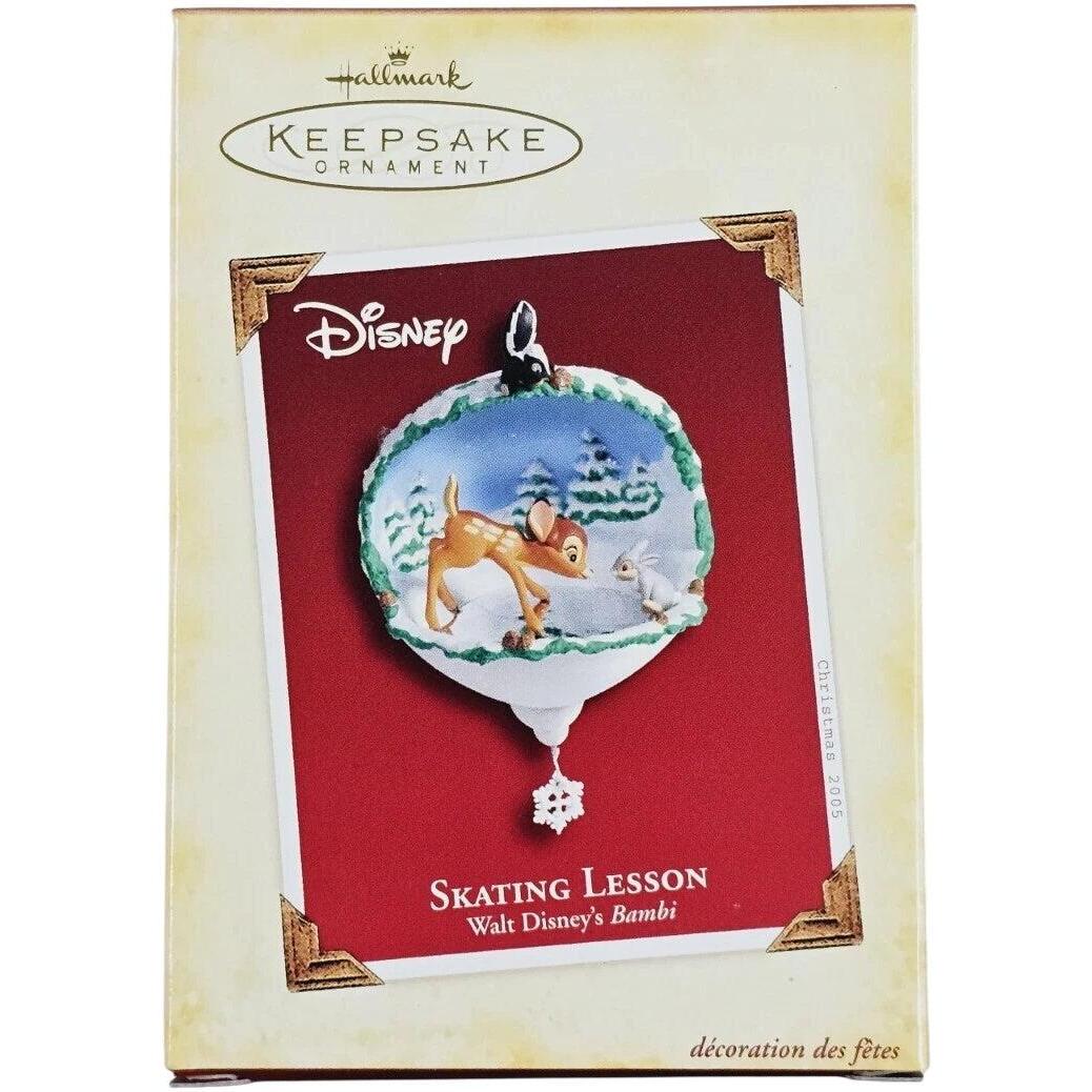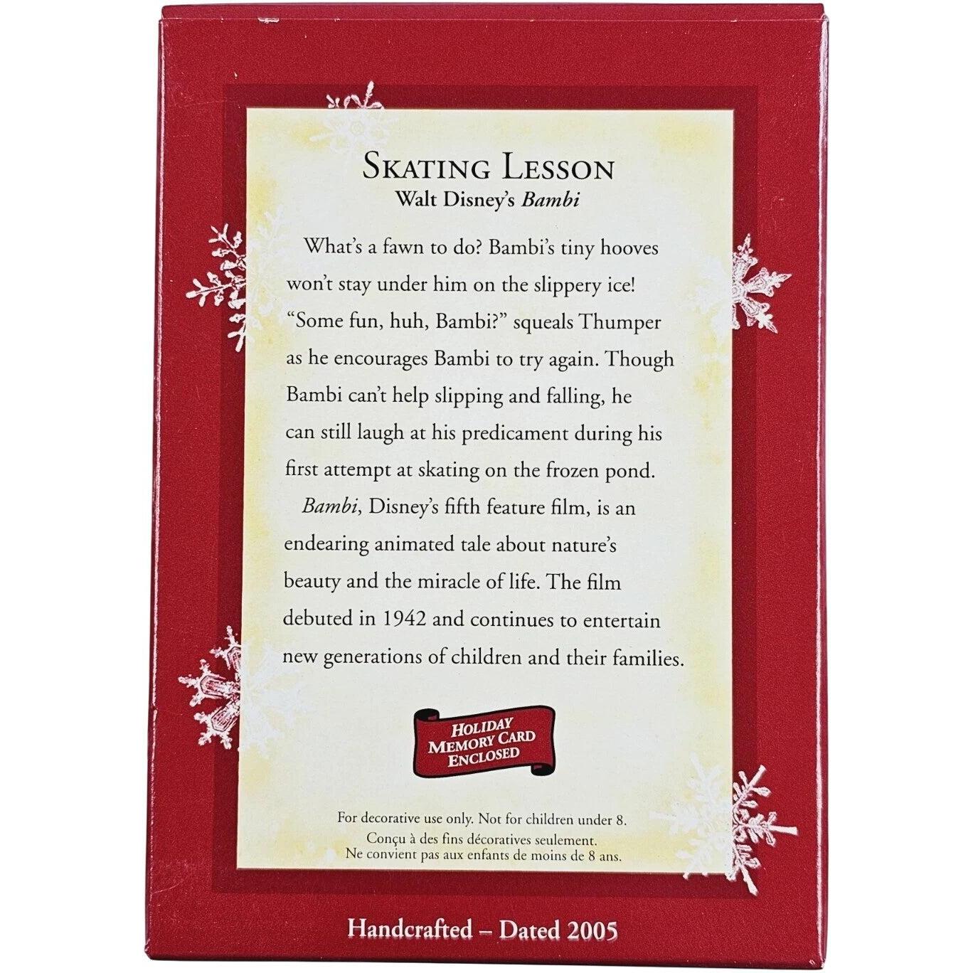 Join Bambi and Thumper as they take to the ice in the heartwarming 2005 Skating Lesson keepsake ornament. This delightful piece illustrates the moment Thumper teaches Bambi how to skate on a frozen pond — a charming nod to friendship and discovery. The ornament measures about 5″ high and was released under Hallmark’s Disney line, item number QXD4242.