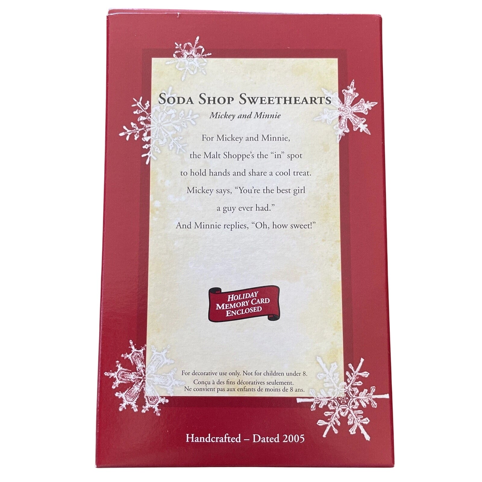 Step back into the 1950s with this charming 2005 edition of the Hallmark Keepsake Ornament titled Soda Shoppe Sweethearts (SKU QRP4072). The scene depicts iconic characters Mickey Mouse and Minnie Mouse leaning in at a classic malt-shop counter, sharing a towering ice-cream sundae over a black-and-white checkered floor and chrome stools. The design uses vibrant color and fine sculpted detail, drawing on the nostalgia of a balloon-lit soda fountain date in mid-century America. As part of Hallmark’s Disney collection, it combines beloved characters, vintage styling and holiday keepsake appeal—making it a meaningful piece for Mickey & Minnie fans, Disney collectors and lovers of retro Americana. With its mix of character licensing, decorative statement and collectible value, it’s a sweet addition to any tree or display.