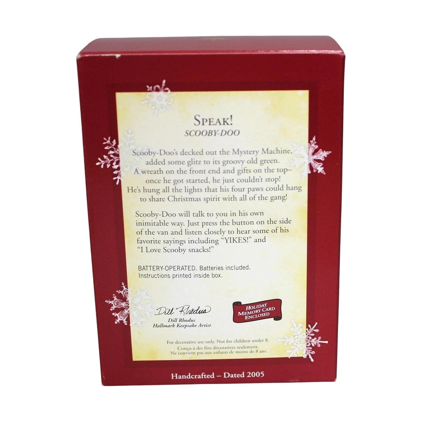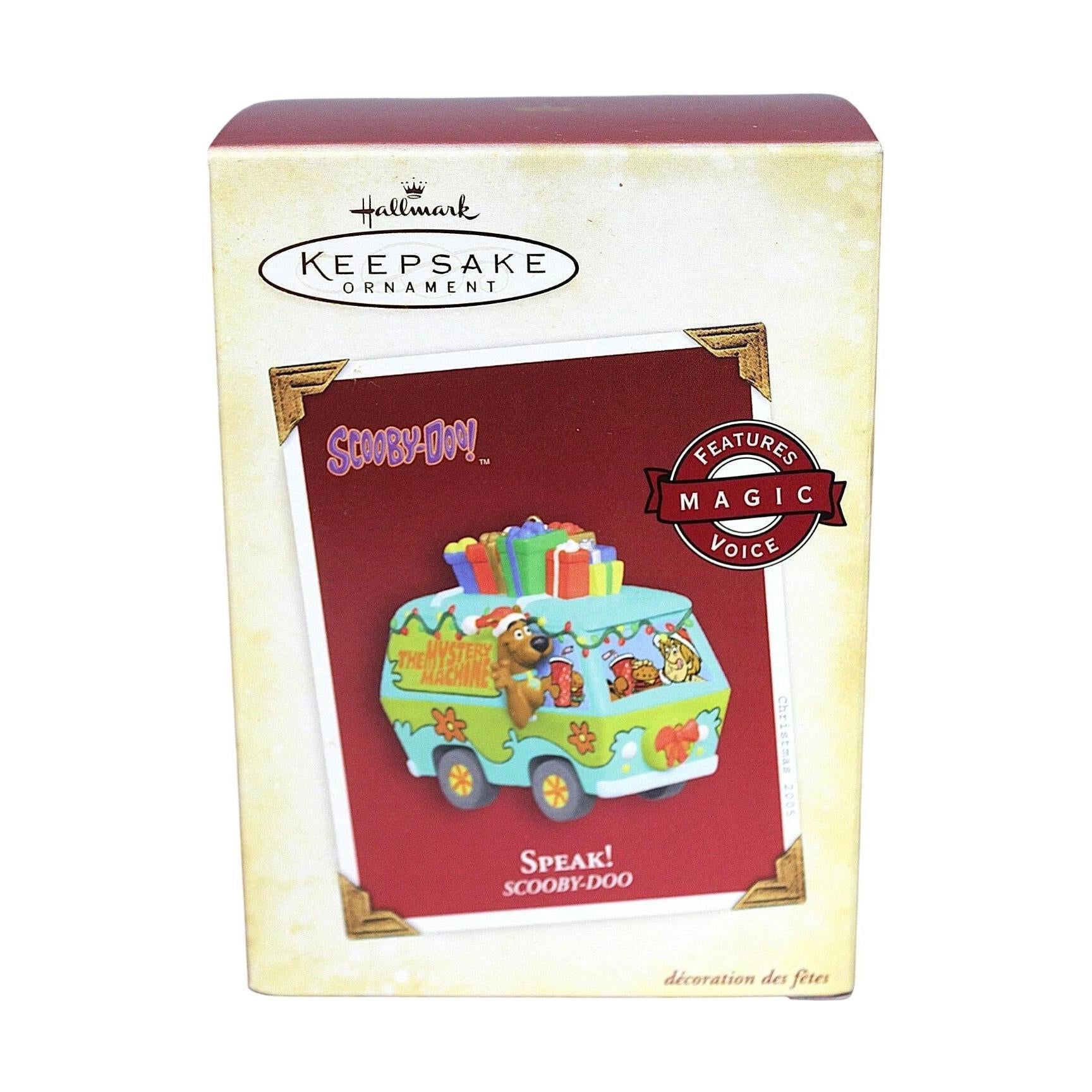 Get ready for some mystery and laughs with the 2005 Speak! Hallmark Keepsake ornament featuring Scooby-Doo. This playful ornament captures everyone’s favorite Great Dane mid-sentence, with Scooby holding a festive bone-shaped tag that says “Ruh-Roh!” Sculpted with rich detail and bright color, it perfectly captures Scooby’s personality and humor. When activated, it plays one of Scooby’s classic phrases, bringing sound and fun to your holiday décor. A favorite among fans of the long-running Hanna-Barbera series, this collectible blends nostalgia and Christmas spirit for a truly groovy addition to your tree.