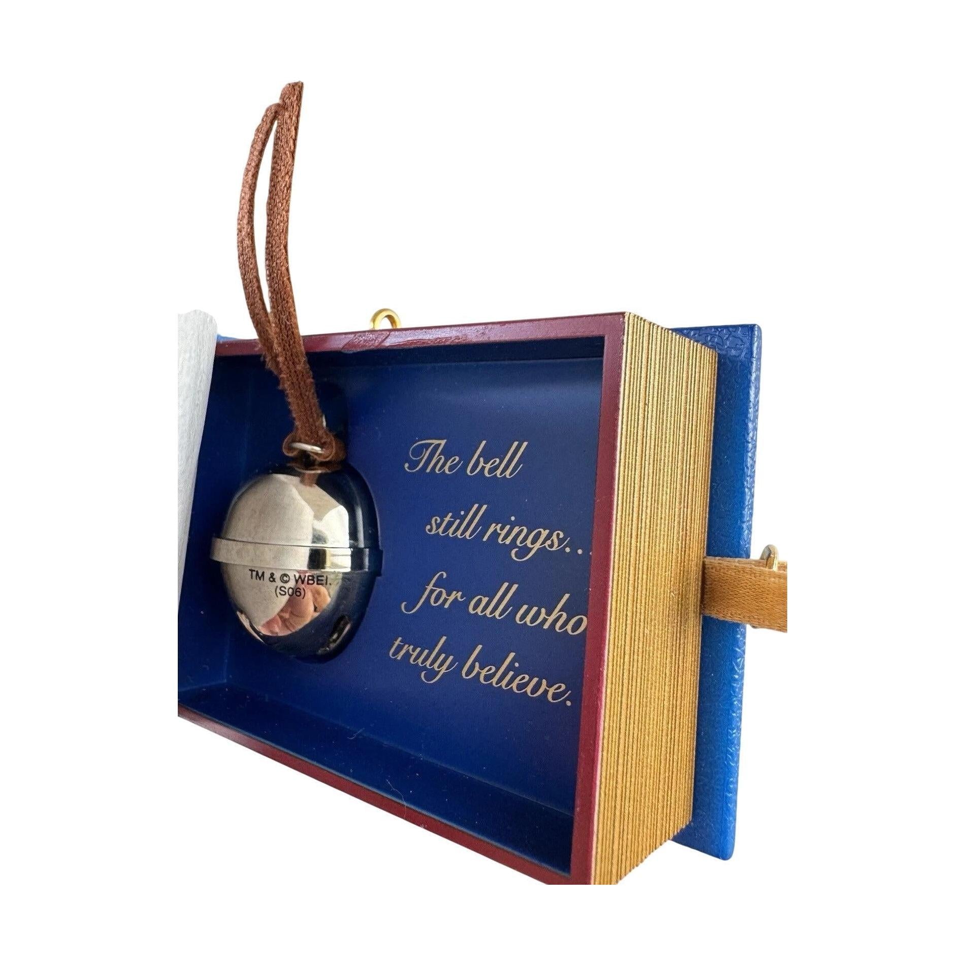Make your holiday season magical with this exquisite 2006 ornament set, A Christmas to Remember, from The Polar Express. This two-piece set includes a beautifully crafted miniature book and a sleigh bell. The book opens to reveal illustrated pages from the movie, and tucked inside is a small bell ornament that echoes the iconic sound of “the bell still rings for all who truly believe.”