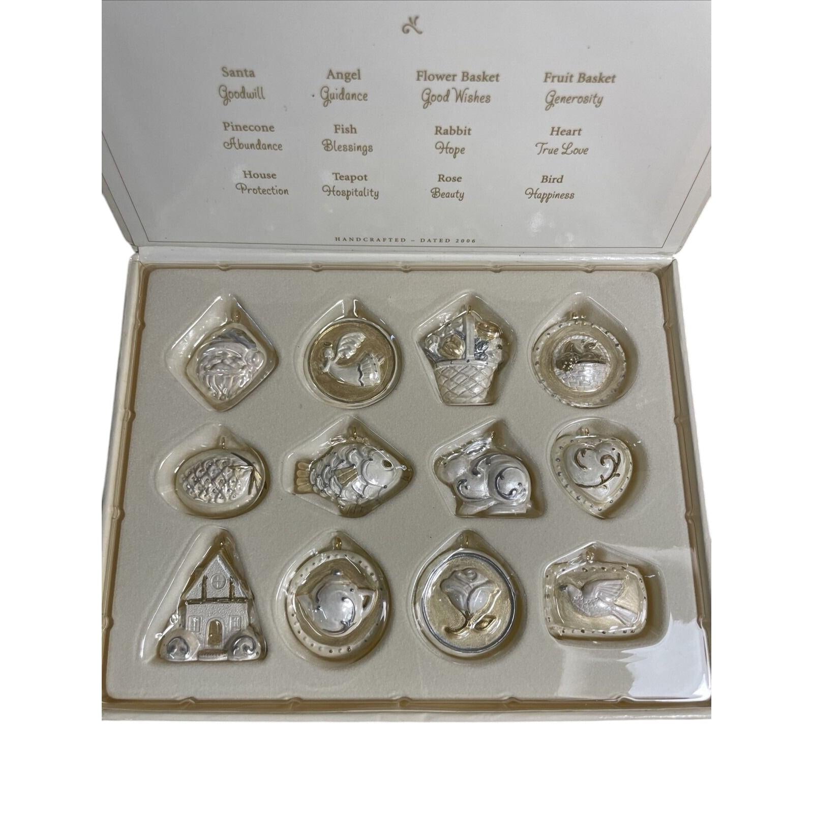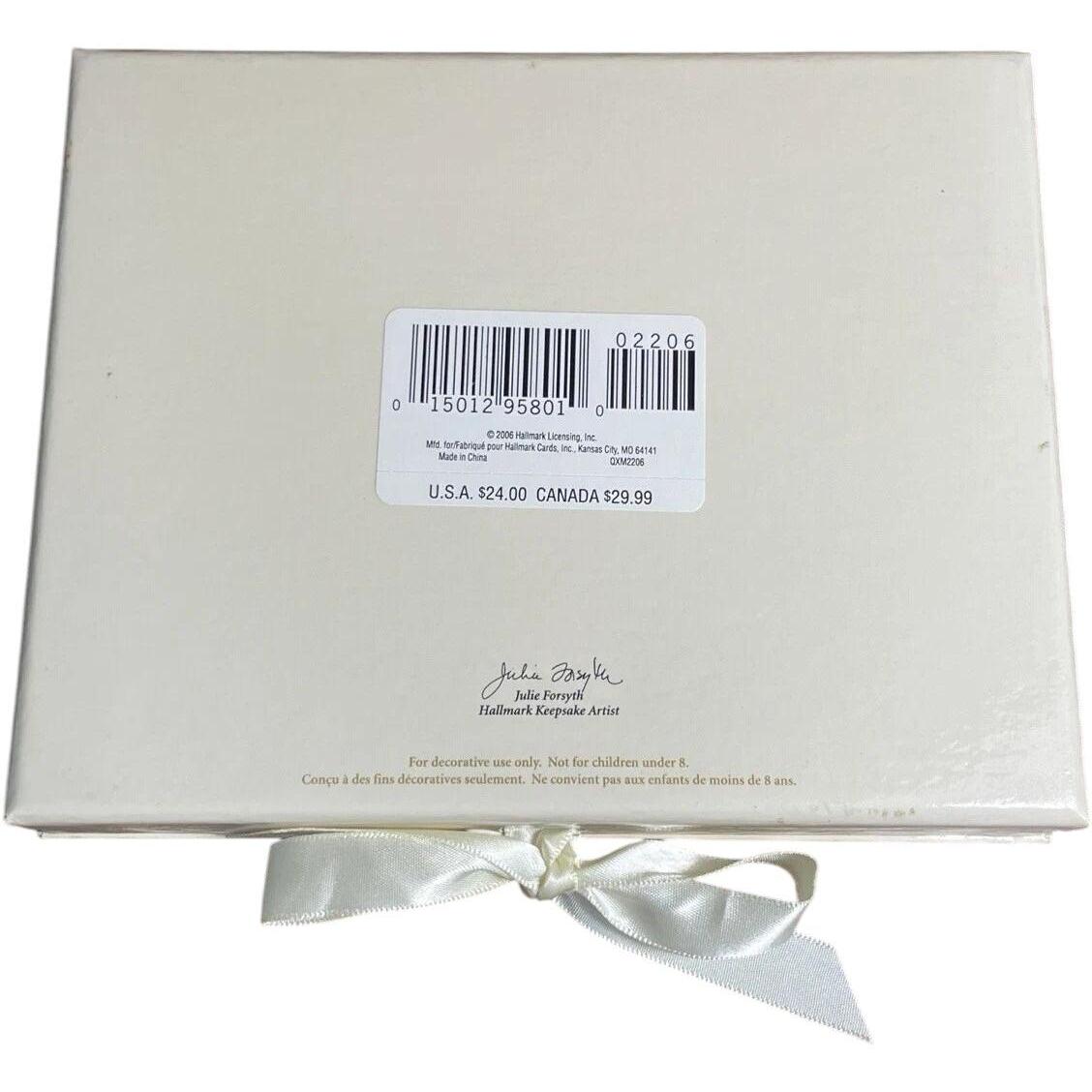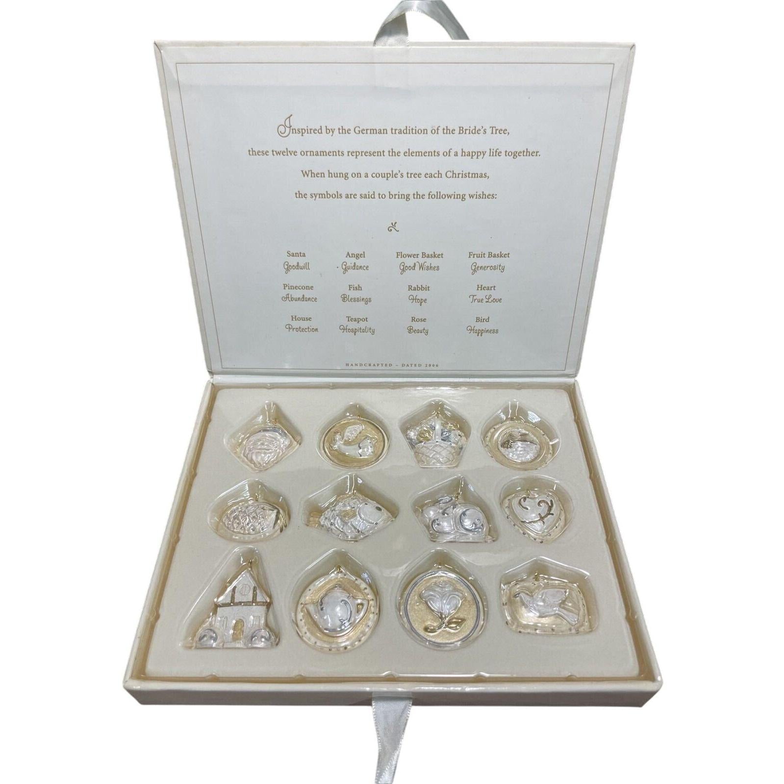 Celebrate love, marriage, and new beginnings with A Happy Life Together, a 2006 Hallmark Keepsake Miniature Ornament Set (12-piece) by Julie Forsythe. Designed in the German tradition of the “Bride’s Tree,” this set includes 12 tiny ornaments—each about 1″ high—representing symbolic aspects of a happy married life. The set comes packaged in a gift box, with the lid tied down by a ribbon bow. Perfect for newlyweds, anniversary gifting, or couples starting their first Christmas tree together.