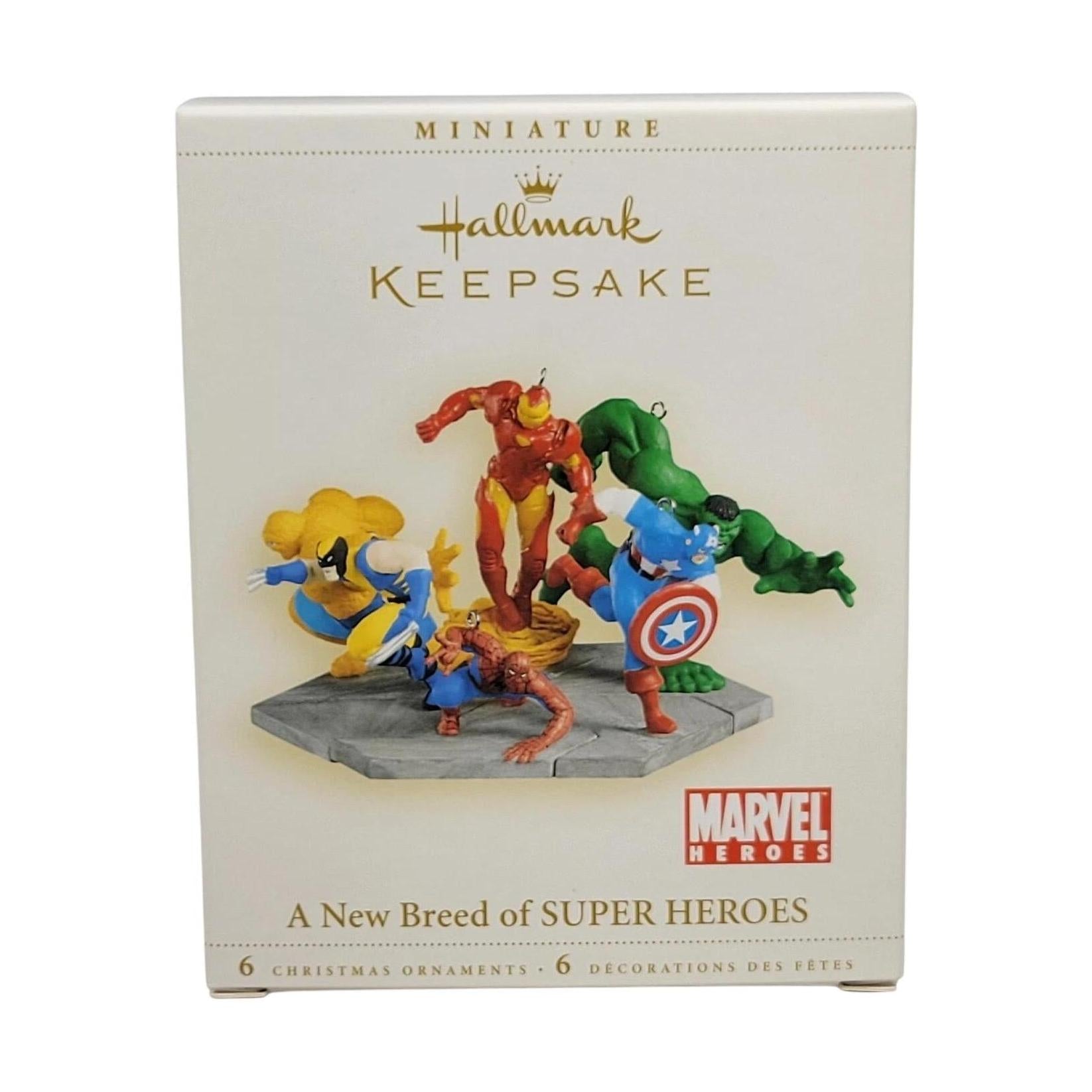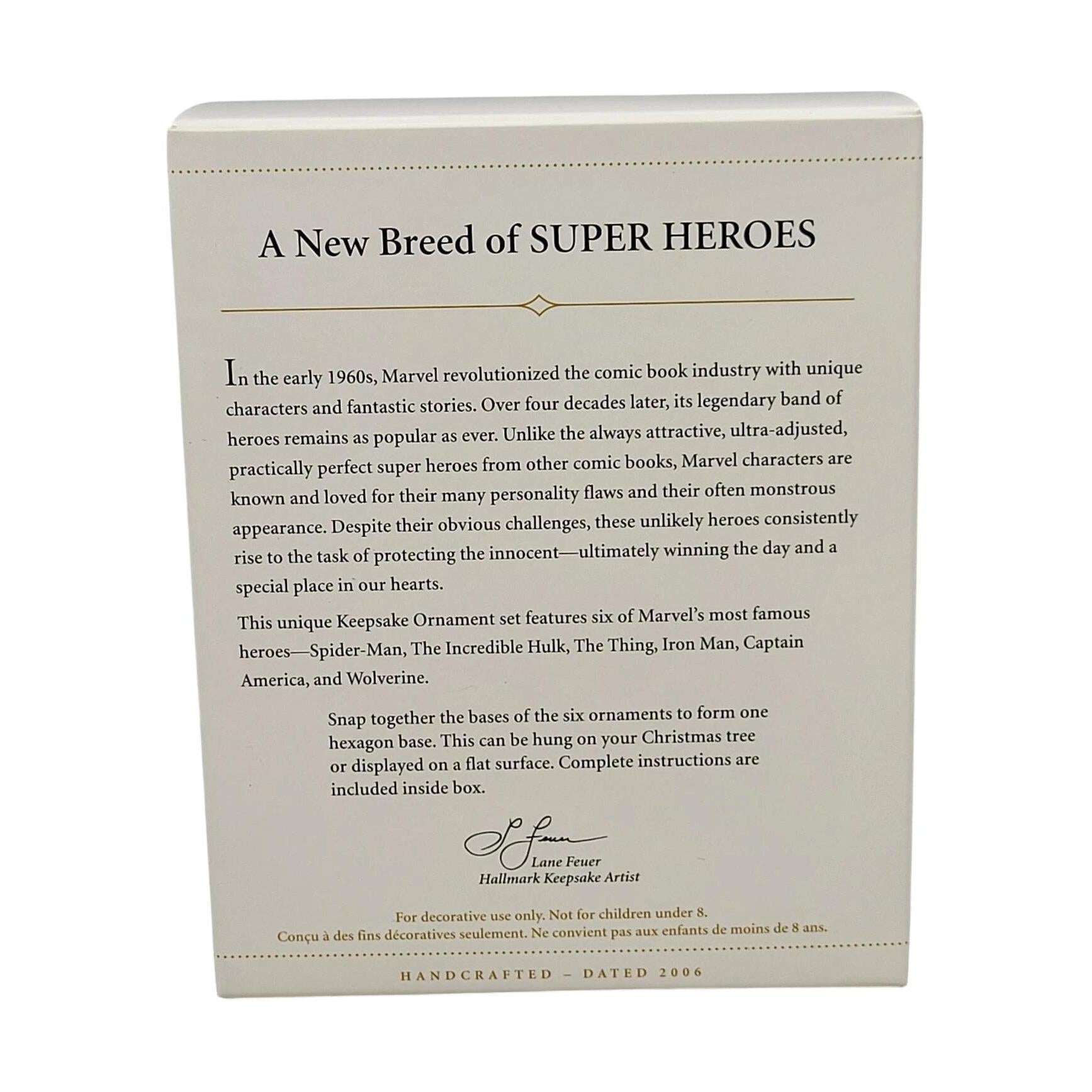 Assemble the heroes of Marvel in miniature form with this 2006 Hallmark Keepsake set, A New Breed of Super Heroes. The set features six beloved characters — Spider-Man, The Incredible Hulk, The Thing, Iron Man, Captain America, and Wolverine — each rendered in one-inch miniature ornaments. Their bases snap together to form a hexagon display base for a unified look.