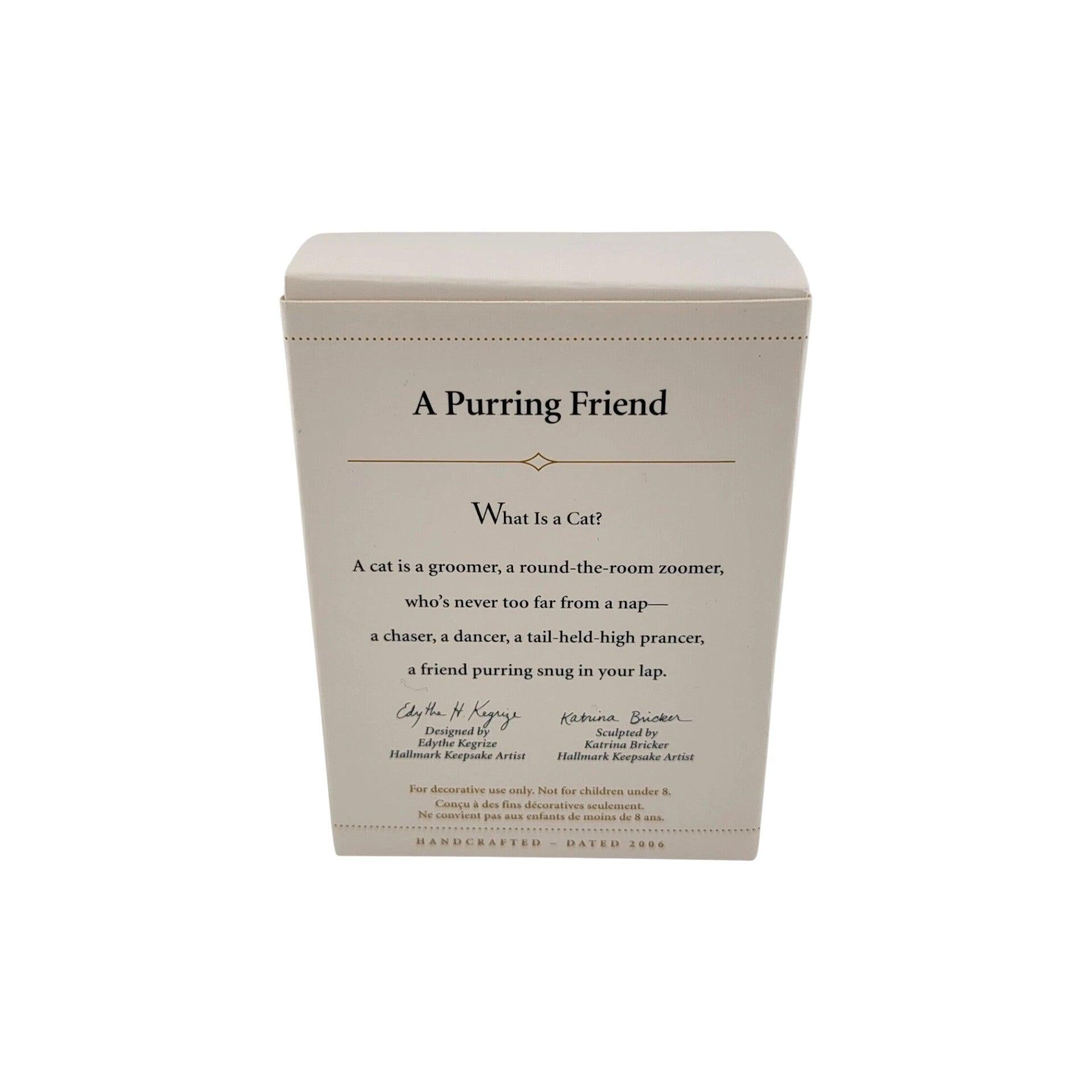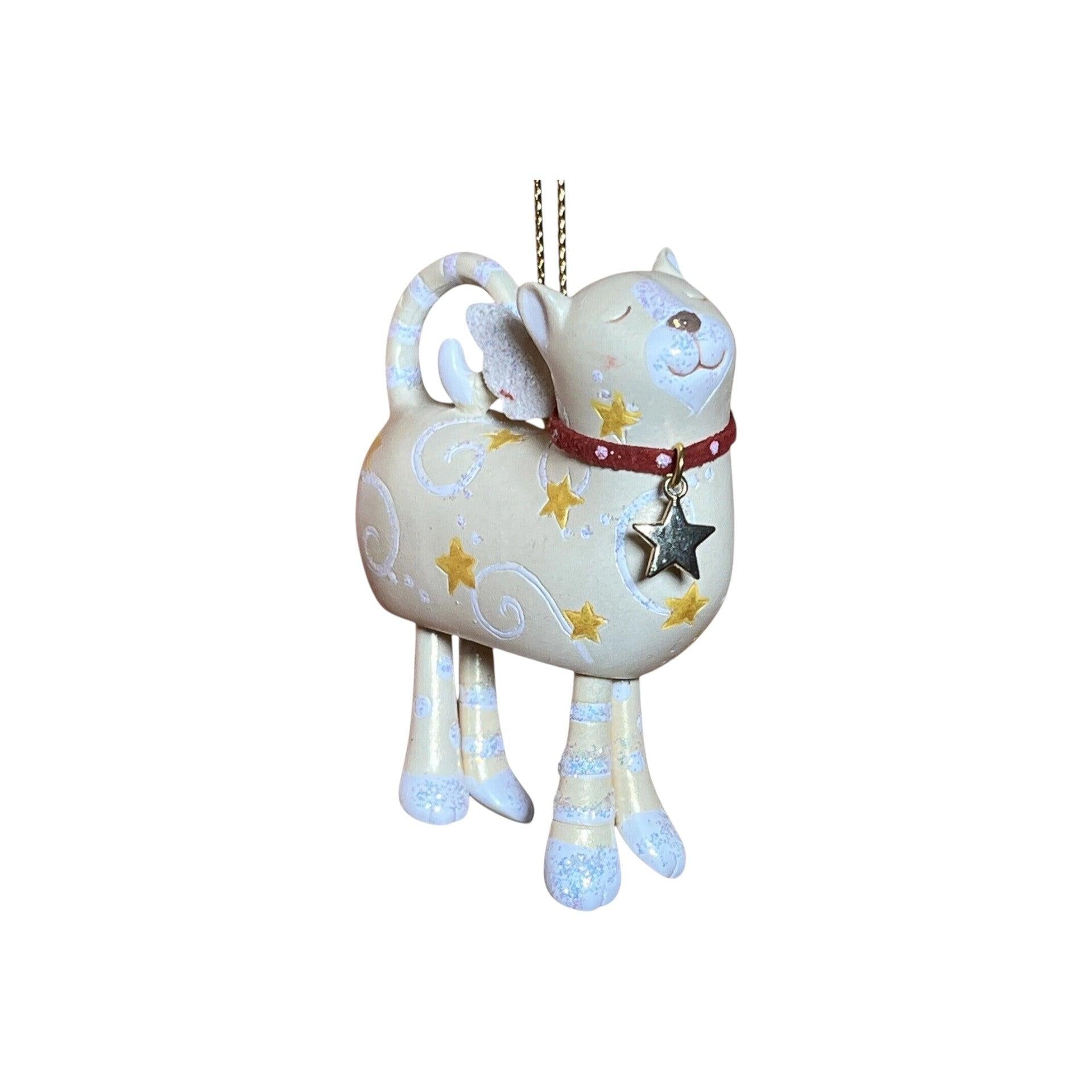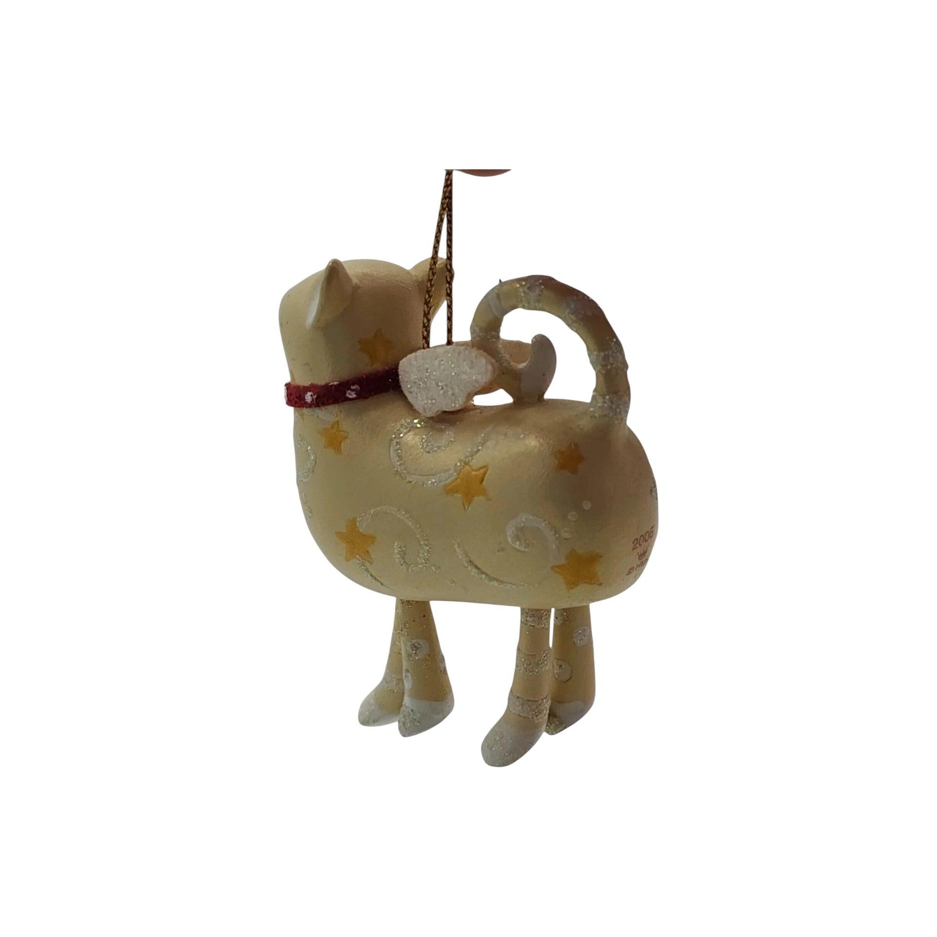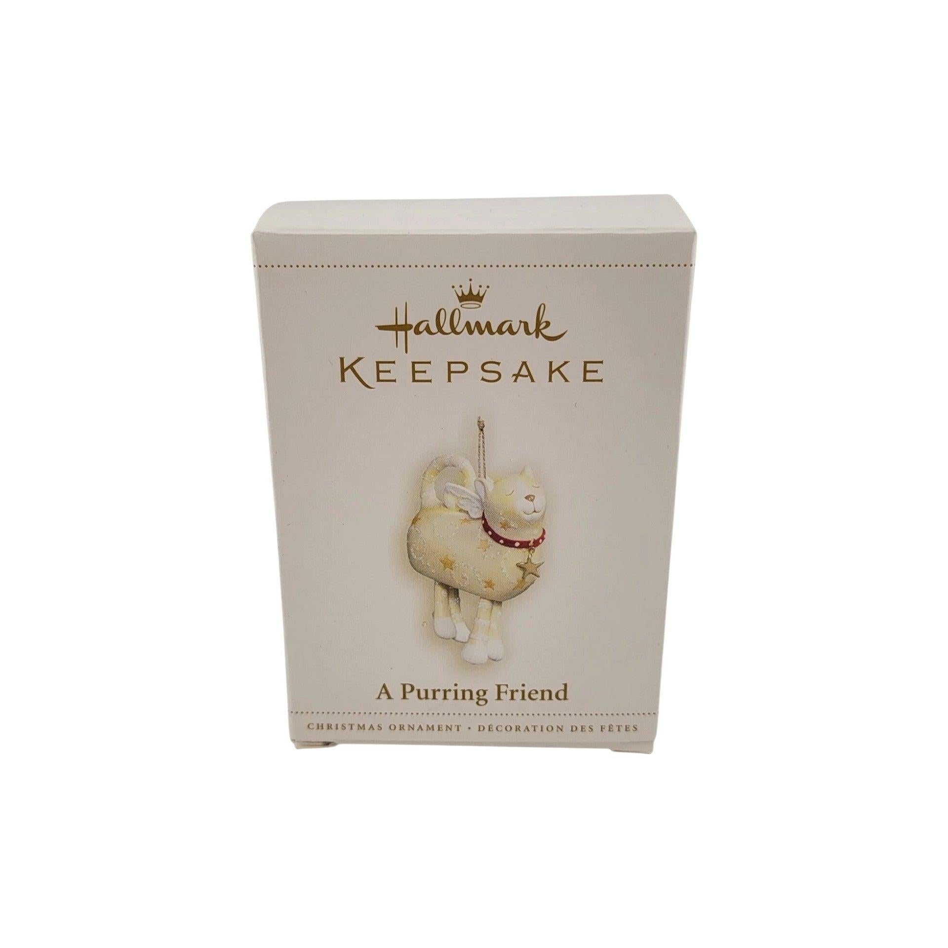 This whimsical 2006 edition from Hallmark features a charming kitten-themed design titled “A Purring Friend”. The ornament depicts a playful cat with angel wings, wearing a red collar with a star, and dangling legs that swing freely—adding movement and character to the tree. Crafted in painted mixed-media (resin with textured and fabric-like accents), the piece invites delight both for cat lovers and ornament collectors alike. At approximately 3″ tall, it’s perfectly sized for decorating, gifting, or adding to a pet-themed keepsake collection.