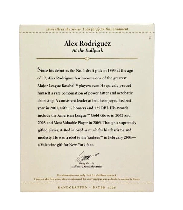 Bring the excitement of the diamond to your holiday décor with the 2006 Alex Rodriguez, At the Ballpark ornament—the 11th figure in Hallmark’s famed At the Ballpark series. This finely sculpted keepsake captures A‑Rod in a poised, ready fielding stance, dressed in classic Yankees pinstripes. Packaged in its original Collector’s Series box, complete with the signature Holiday Memory card, it’s both a festive decoration and a baseball treasure. No batteries or cords required—just hang it and celebrate a moment of MLB greatness in miniature form.
