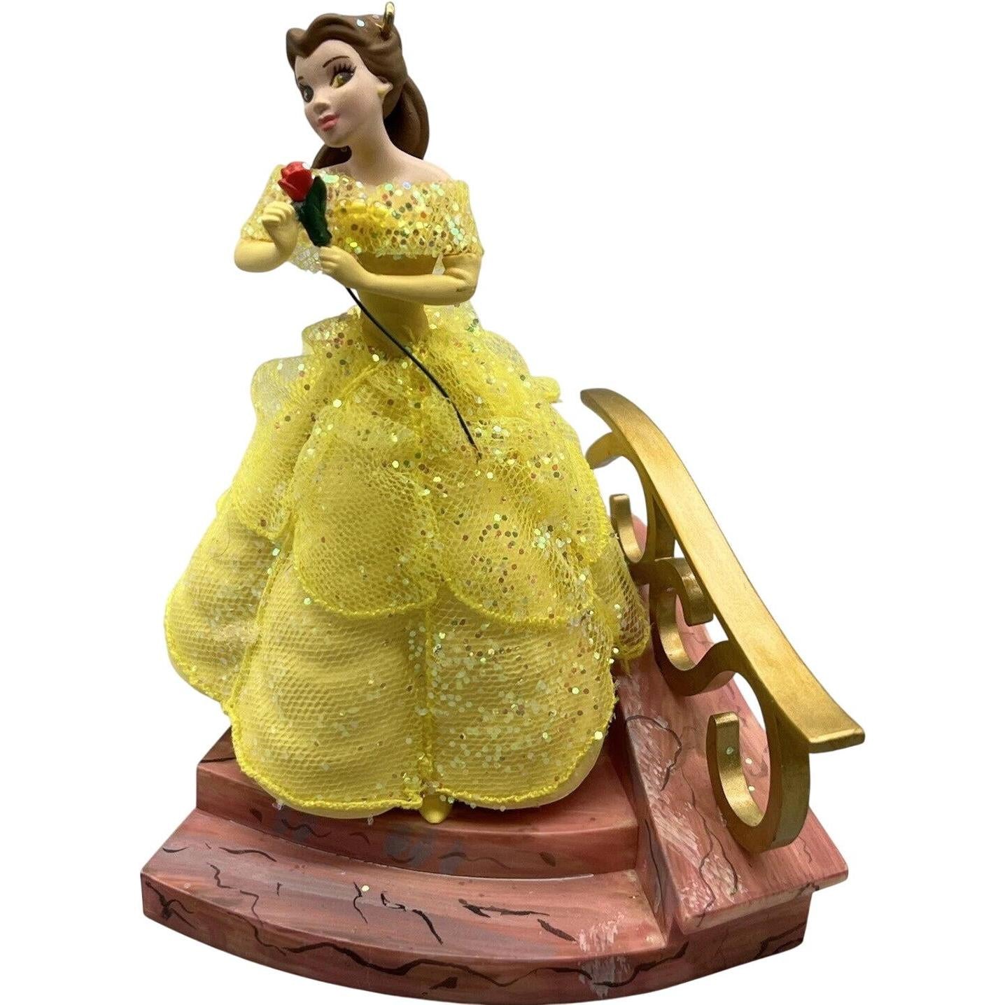 Belle glides down a palace staircase in this exquisite 2006 ornament, wearing her signature yellow ball gown and holding a red rose in hand. The figure is crafted with soft fabric elements for her dress, giving it fluid motion, and detailed facial features to capture her elegance and grace. The piece comes with the keepsake box, hanging ribbon, and Hallmark hang tag. This decorative ornament does not require batteries, cords, or light strings—it’s ready for display as is.