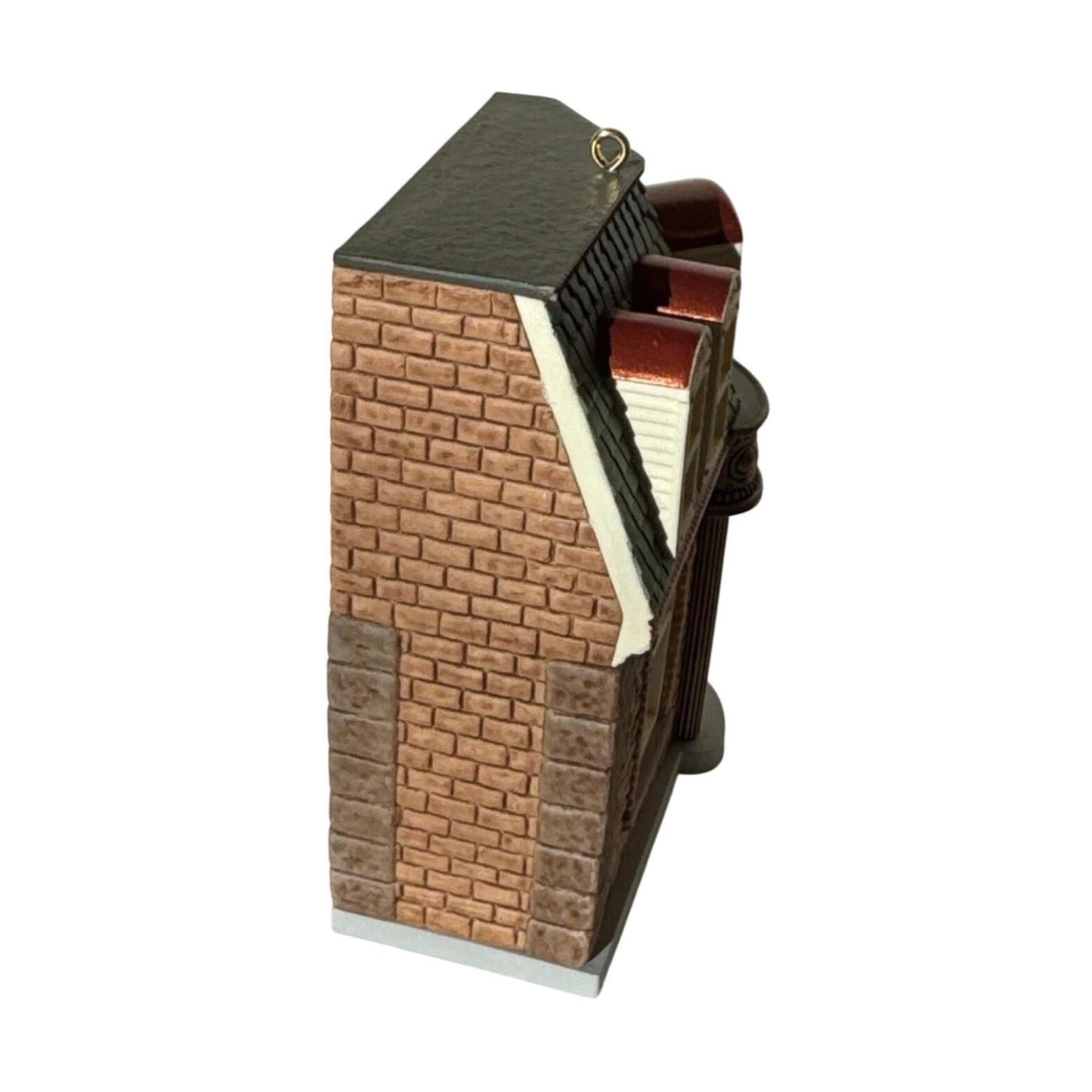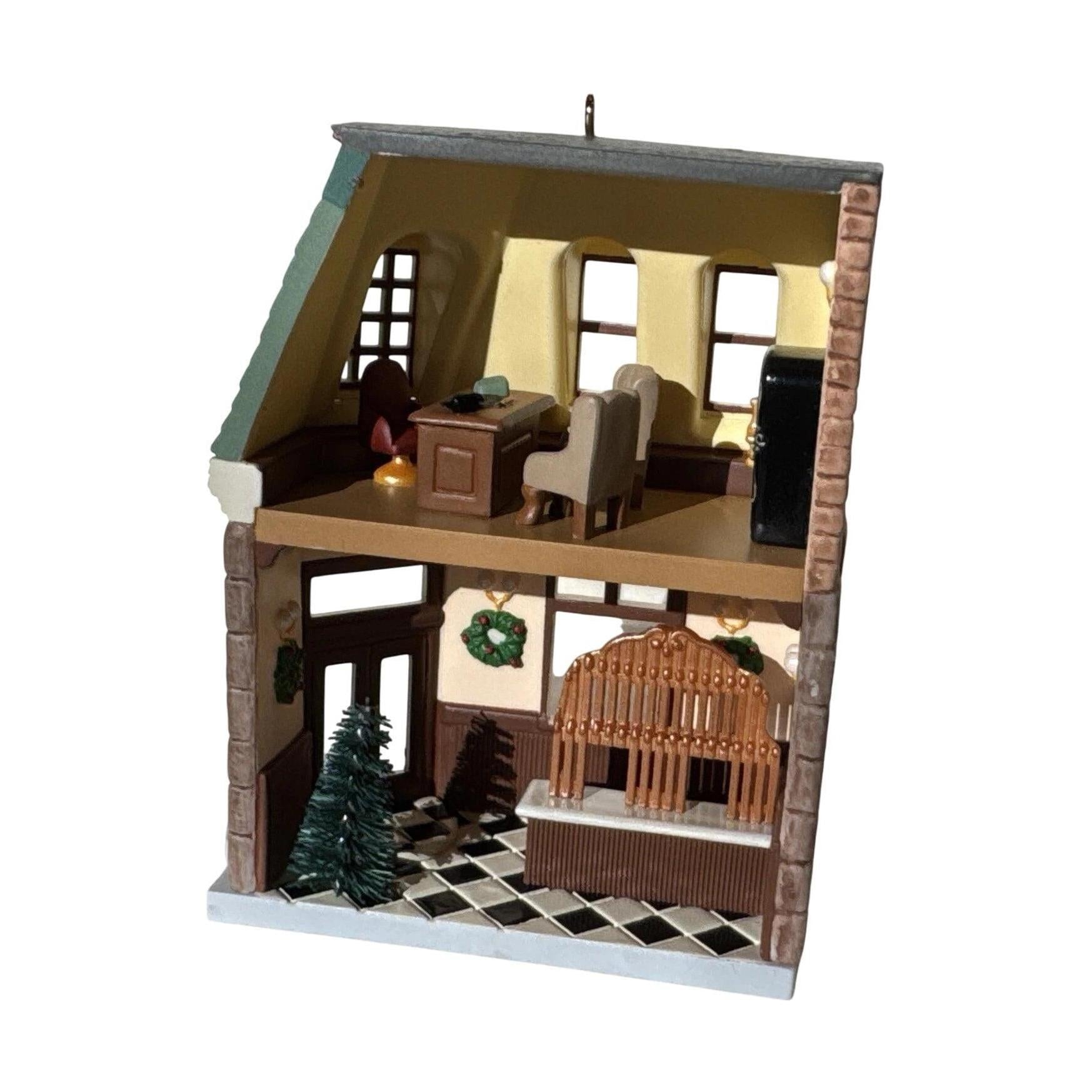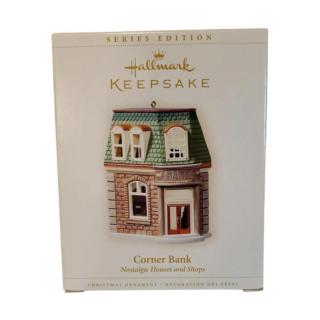 Round the corner into vintage holiday charm with the 2006 Corner Bank, the 23rd release in Hallmark’s beloved Nostalgic Houses & Shops series. Designed by Don Palmiter, this resin-and-plastic miniature resembles a historic bank building with a green mansard roof and detailed arched windows. Peek inside to see the classic tiled floor, teller station, Christmas tree, and festive wreaths. It stands about 4″ tall, arrives in its original Collector’s Series box with hang tag, and—like the rest of the series—requires no batteries, cords, or lights—just unpack and display its nostalgic elegance.