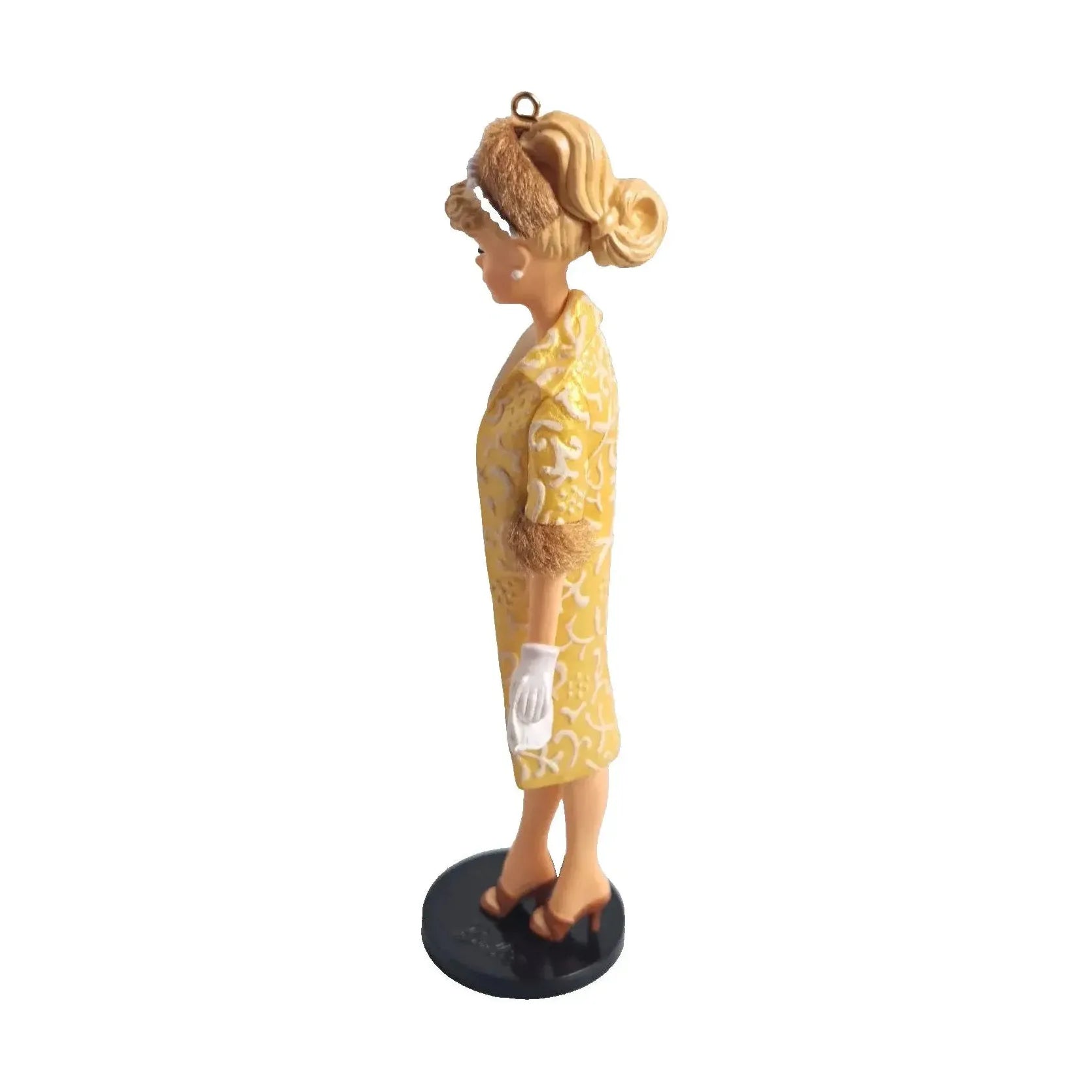 Transport your holiday décor to mid-century glamour with the 2006 Evening Splendor ornament—the 13th entry in Hallmark’s acclaimed Barbie Collector’s Series. Dressed for a dazzling night out, Barbie shines in a gold and cream brocade sheath paired with a matching coat trimmed in faux fur. She accessorizes with a pearl-trimmed headband and necklace, white gloves, open-toe heels, and a playful turquoise clutch for a modern twist. Standing 4½" tall and capturing the elegance of the 1959–1964 fashion era, this keepsake comes ready to hang—no extras required.