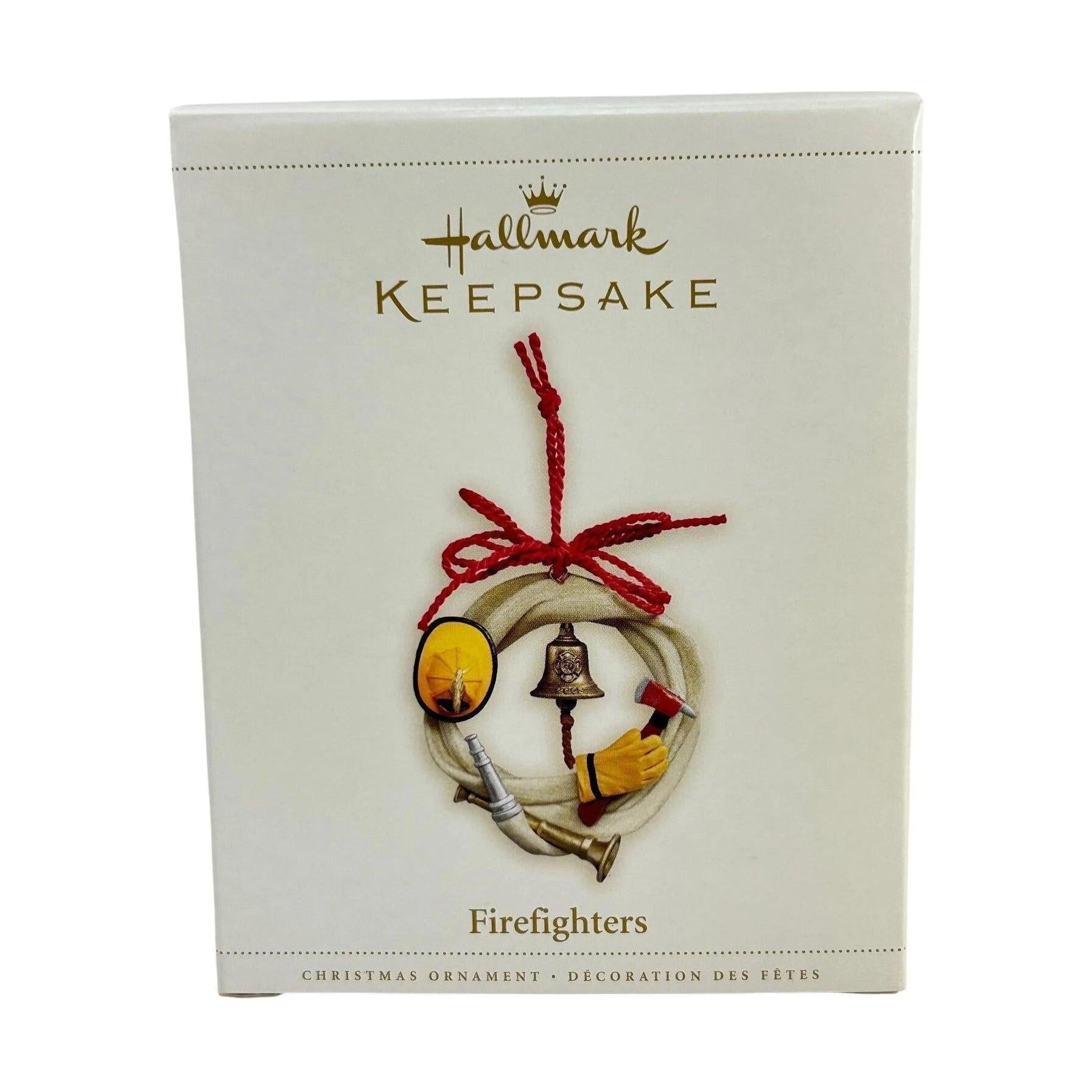 This 2006 release from the Hallmark Keepsake line honors firefighters with a festive wreath made from a firefighter’s hose and includes a shiny date-marked gold bell in the centre. The design incorporates a classic fireman’s helmet, gloves and axe — tools symbolic of the firefighting profession. With its meaningful subject, the piece makes a fitting holiday ornament for those in fire service, supporters of first responders, or collectors of career-themed Keepsakes.