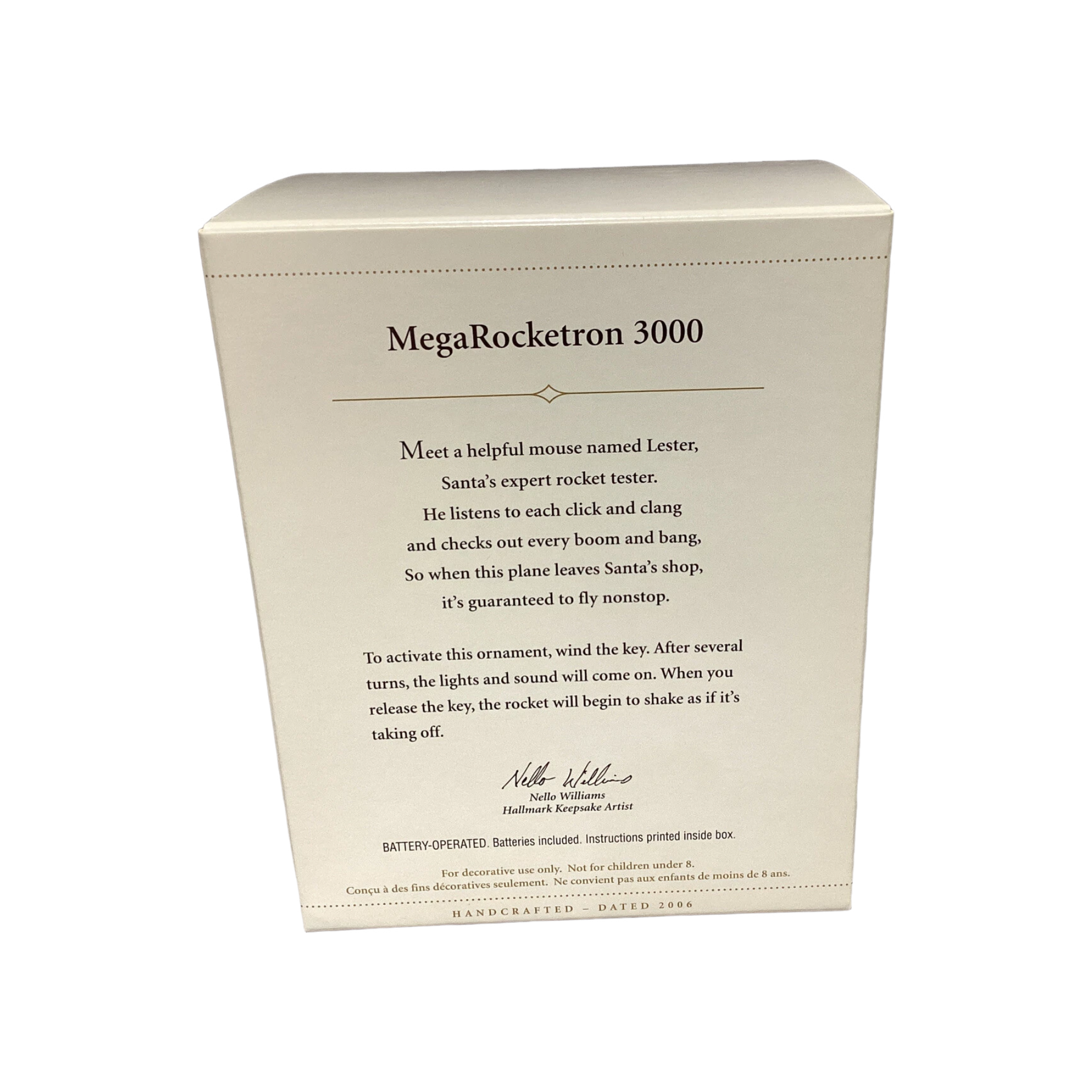 Released in 2006 as a Hallmark Magic ornament, MegaRocketron 3000 features Lester, a helpful little mouse who serves as Santa’s rocket-tester, riding in a retro rocket ship packed with dials, fins, and flashing exhaust. When you wind the key several turns and let it go, the rocket shakes like it’s blasting off while lights and sound effects come on, creating a fun, out-of-this-world display on the tree. In new or mint-in-box condition, the package typically includes the ornament, its original Hallmark box, instructions, and three LR44 button-cell batteries, so it’s ready to hang and enjoy without any external cords or light strings.