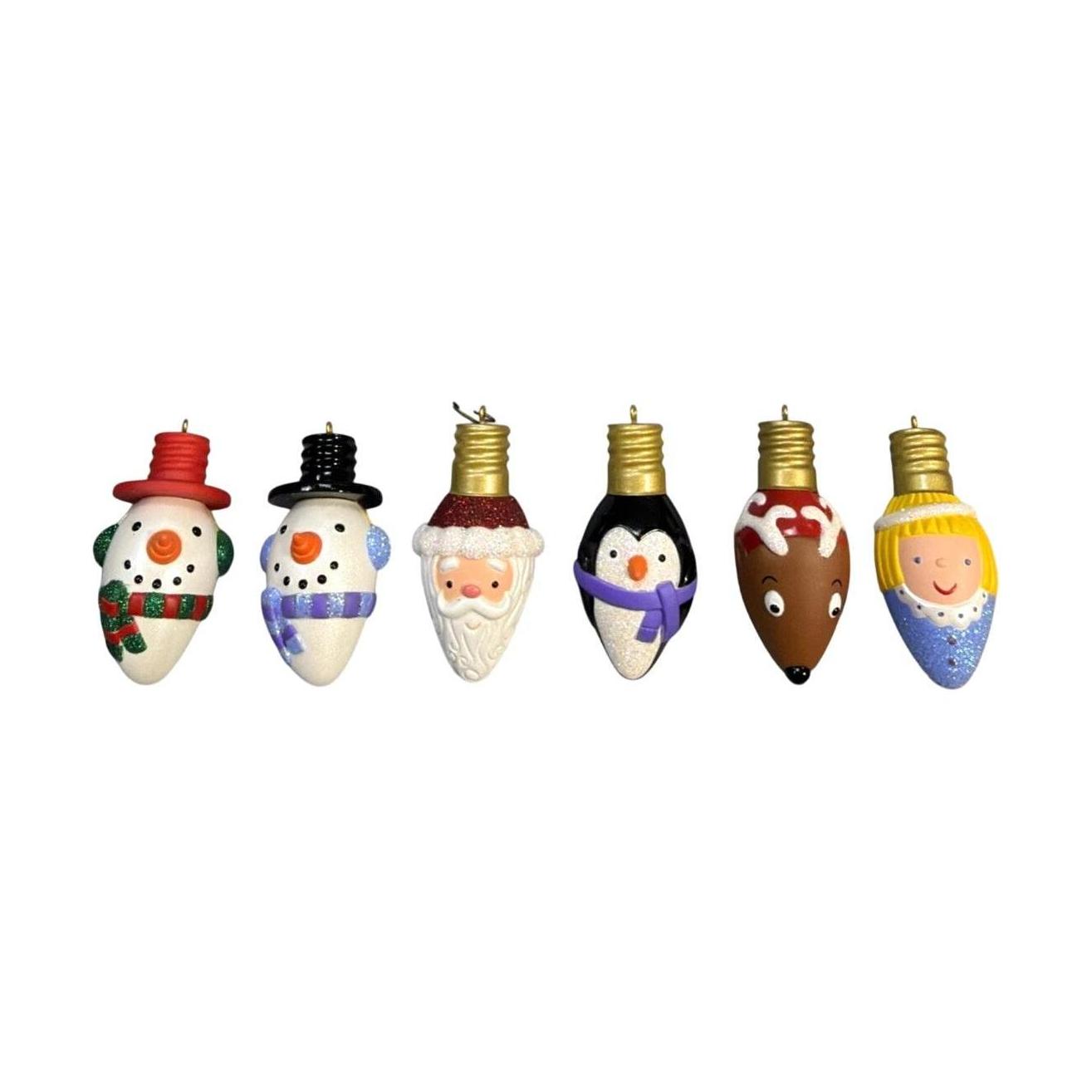 Add a burst of festive cheer with Merry and Bright Minis, a 2006 Hallmark Keepsake miniature set featuring six pint-size ornaments shaped like old-fashioned Christmas light bulbs. Each bulb is painted to represent a favorite holiday figure—Santa, a reindeer, an angel, a penguin, and others—making the set perfect for accenting a tabletop tree, wreath, or mantle display. The set comes boxed and requires no batteries, cords, or setup beyond hanging.