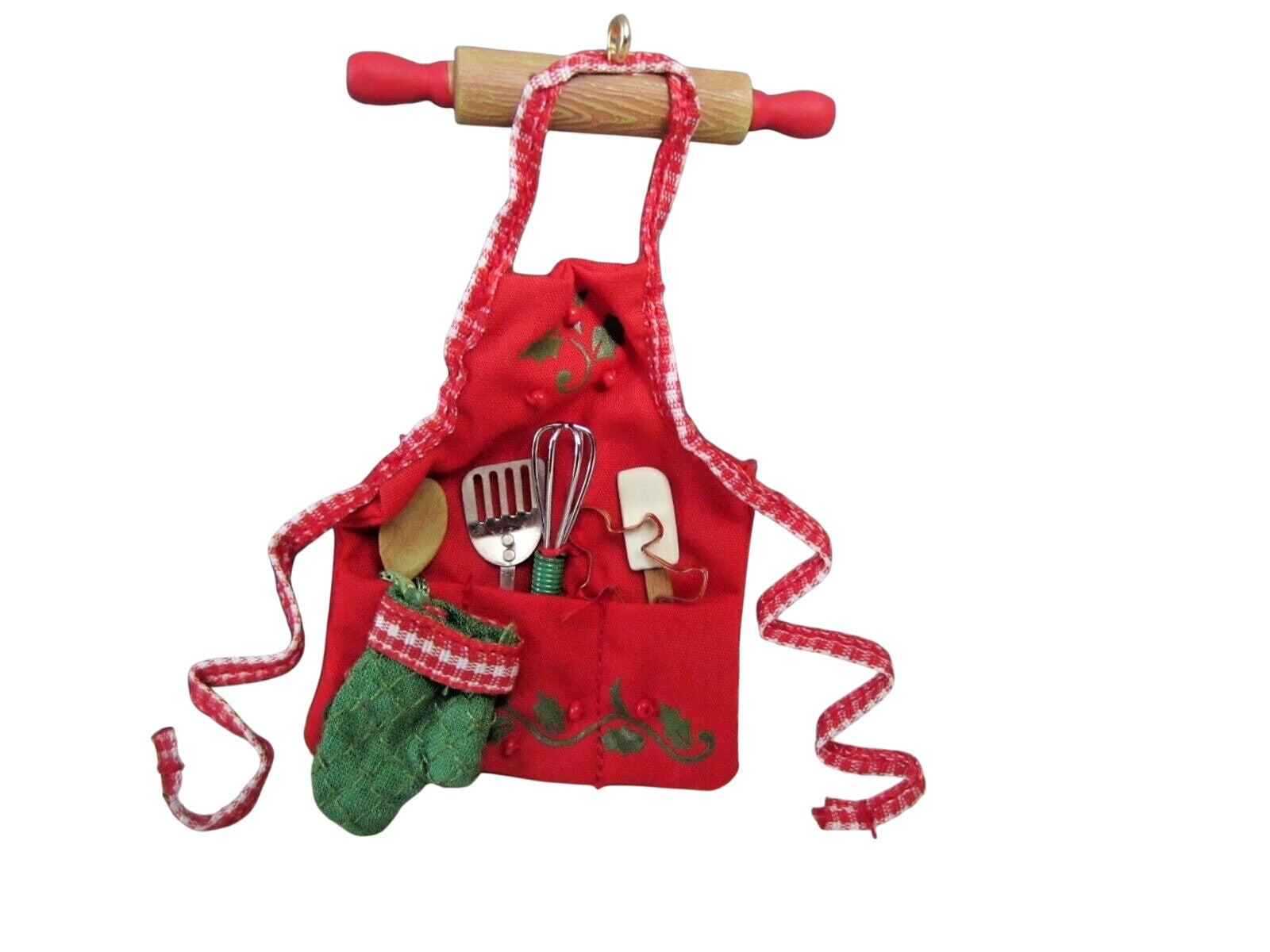 Celebrate the heart of home with the 2006 edition of this charming ornament from Hallmark: “Merry Kitchen Magic.” The design presents a festive red apron hanging from a rolling pin, complete with hanging metal kitchen-tools—like a wooden spoon, cookie-cutter, and oven mitt—evoking warm holiday baking and cozy family gatherings. Crafted in mixed media (metal & fabric) by artist Edythe Kegrize, each detail—from the holly accent on the apron to the textured finish—adds to its nostalgic appeal. At approximately 3.9″ tall and 2.7″ wide, it is perfectly sized to hang on a tree or nestle among kitchen décor, making it a meaningful pick for collectors, baking enthusiasts, and holiday décor lovers alike.