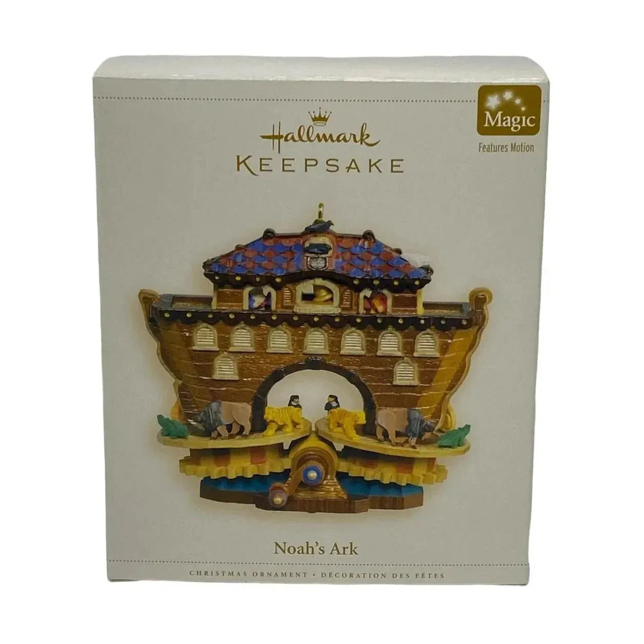 Bring a touch of motion and timeless story to your holiday display with the 2006 Noah’s Ark Hallmark Keepsake ornament. With one gentle crank, you can watch the animals parade in and out of the ark—elephants, giraffes, lions and more—while the ark itself stays beautifully detailed with painted wood-look textures and multicolored accents.