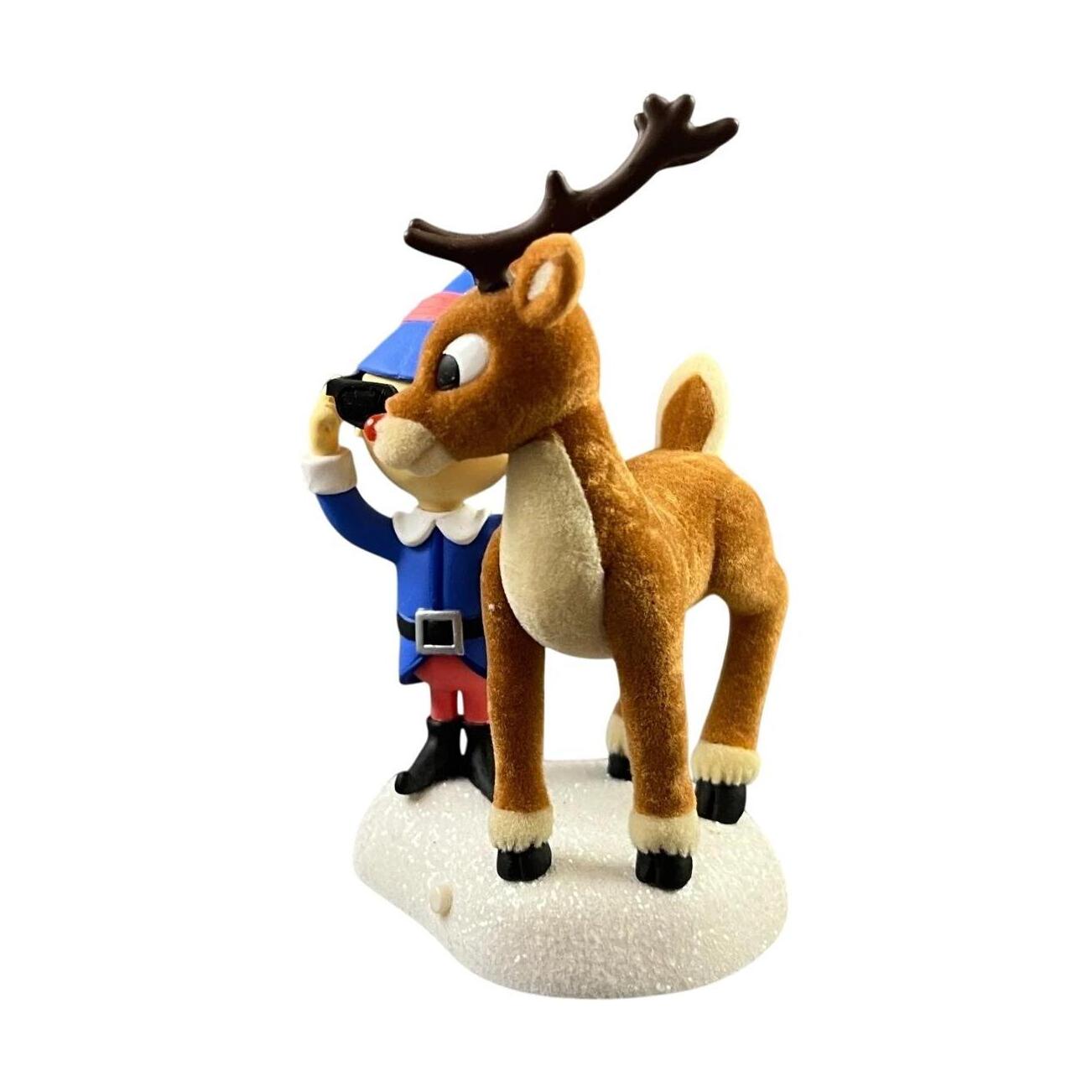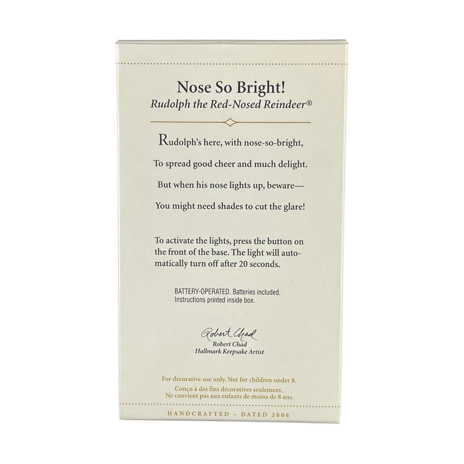 Light up your holidays with this 2006 Nose So Bright! magic Keepsake ornament featuring Rudolph the Red-Nosed Reindeer. Press the button on his base and his famous glowing red nose illuminates (stays lit for 20 seconds) — a fun interactive effect especially delightful for Rudolph fans. The fixture stands around 3.647″ H × 2.358″ W × 2.236″ D and is crafted by artist Robert Chad. It comes with 3 LR41 batteries (included).