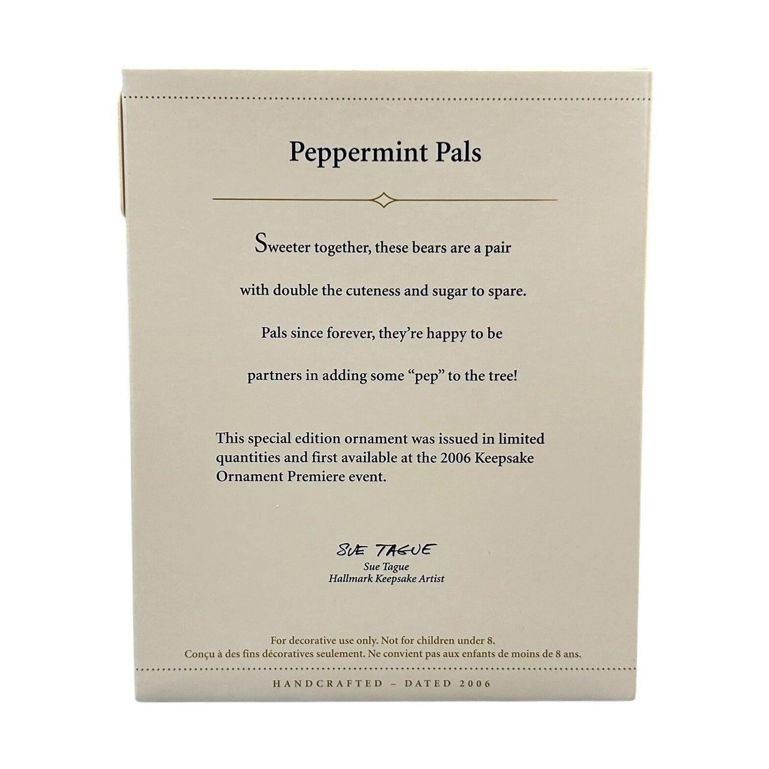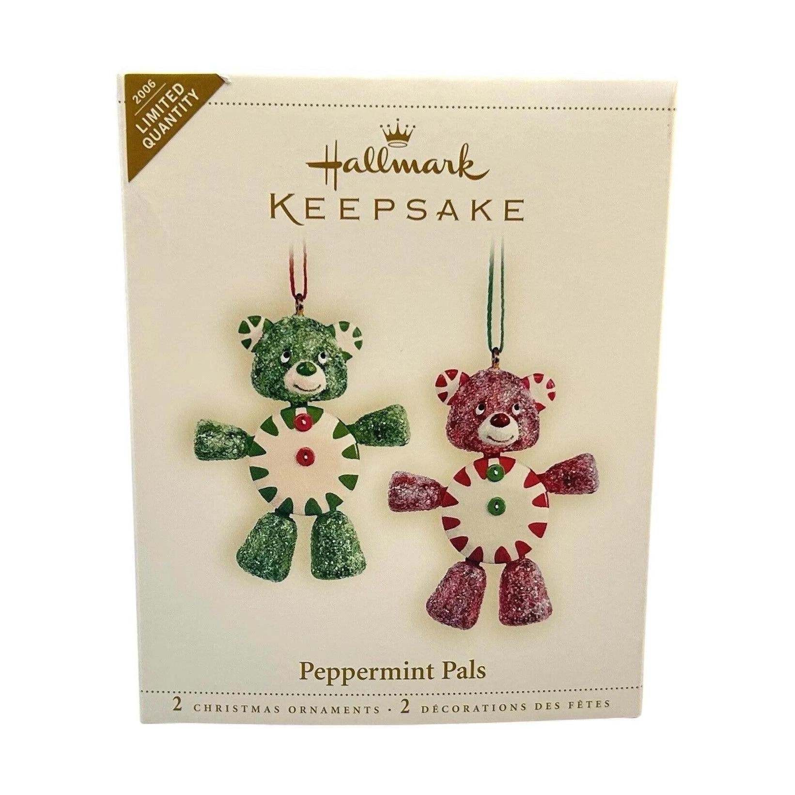 Add a touch of sweet whimsy to your holiday décor with the 2006 edition from Hallmark featuring “Peppermint Pals.” This charming set includes two adorable candy-themed bears, each decorated like peppermint candy with red and white swirl accents and glittery gumdrop hats, embodying playful festive cheer. Designed by Sue Tague, the pair conveys warmth and paired friendship, making them a delightful choice for couples, families, or anyone who loves whimsical holiday collectibles. With their compact size and hand-painted finish, these keepsakes are perfect for hanging together as a set on your tree or gift-giving to someone special.