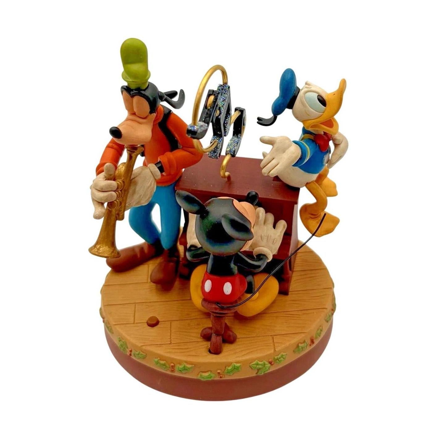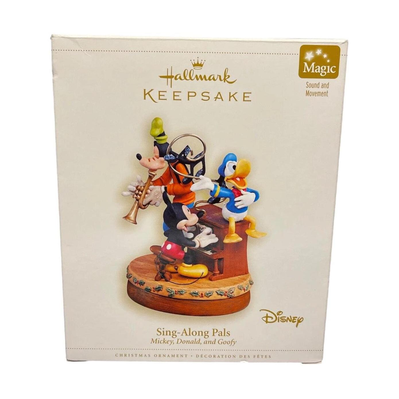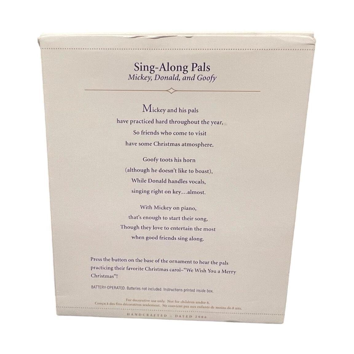 Strike up some holiday harmony with the 2006 Sing-Along Pals Hallmark Keepsake ornament featuring Mickey Mouse, Donald Duck, and Goofy. This joyful piece captures the beloved trio gathered around a vintage-style piano, singing Christmas tunes with cheerful expressions and festive attire. The detailed sculpting and bright colors showcase each character’s personality, from Mickey’s enthusiasm to Goofy’s playful grin. Released as part of Hallmark’s Disney collection, it perfectly blends nostalgia and music, making it a must-have for Disney fans and collectors who love timeless holiday fun.