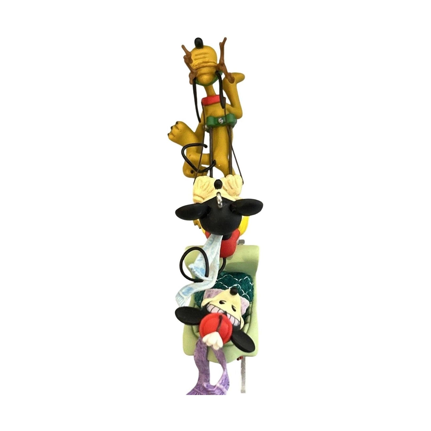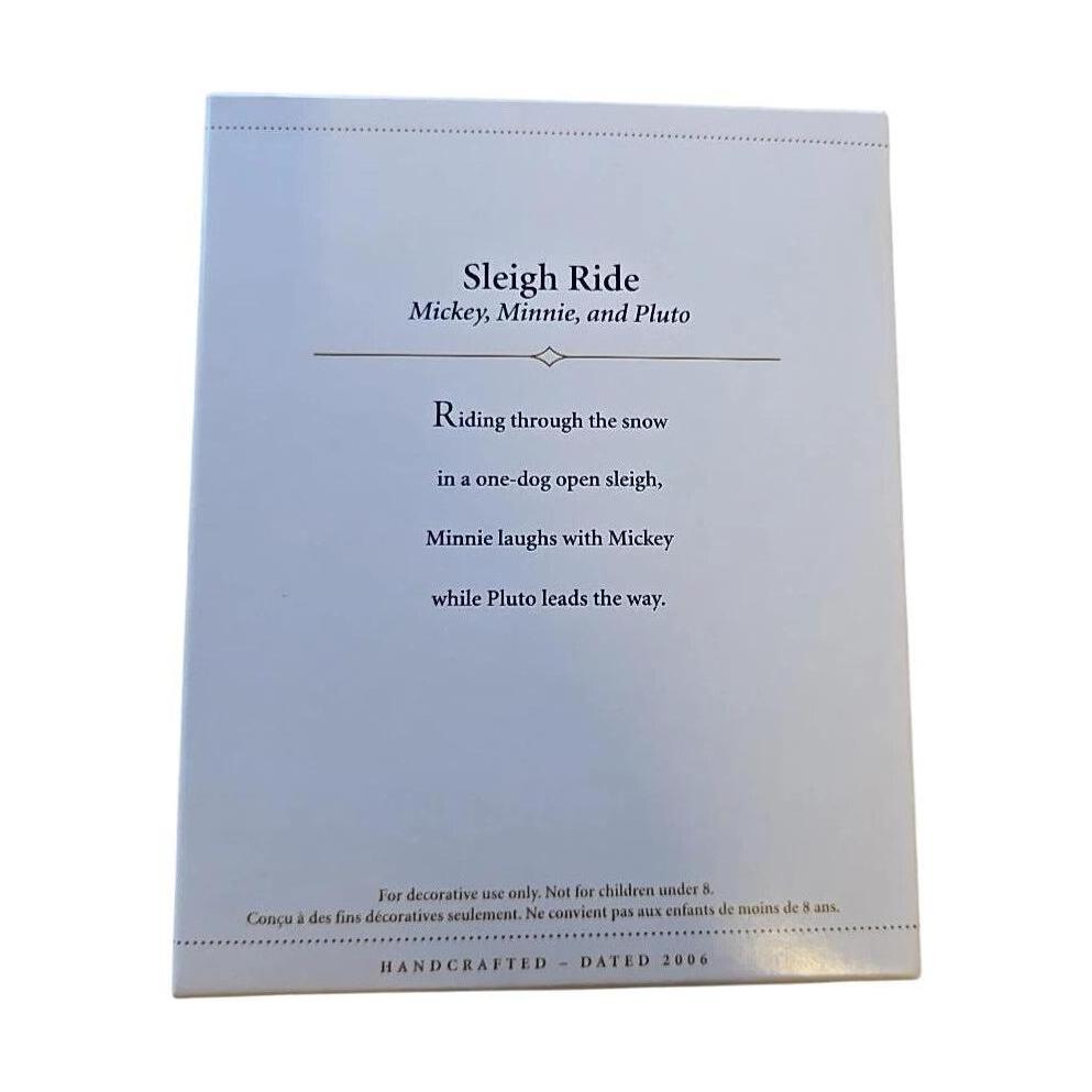 Relive the holiday magic with this vibrant 2006 edition ornament from Hallmark, featuring Mickey Mouse and Minnie Mouse sharing a joyous sleigh ride led by their loyal pup Pluto through a winter wonderland. The detailed sculpt captures Minnie’s laughter and Mickey’s cheerful wave, while Pluto enthusiastically pulls the bright red sleigh across snowy terrain — a charming nod to classic Disney holiday scenes. With full-color paintwork, shimmering accents on the sleigh runners, and crisp character likenesses, this keepsake stands out for both its thematic appeal and its collectible value. A delightful addition to any Disney or Hallmark ornament collection, the “Sleigh Ride” piece is ideal for decorating or as a nostalgic gift for fans of Mickey & friends.