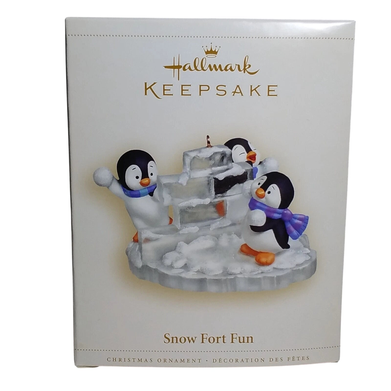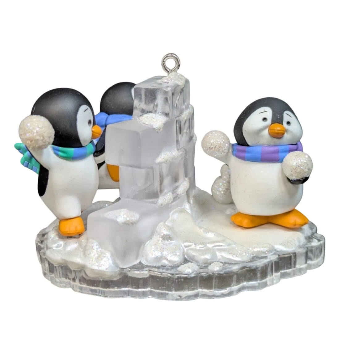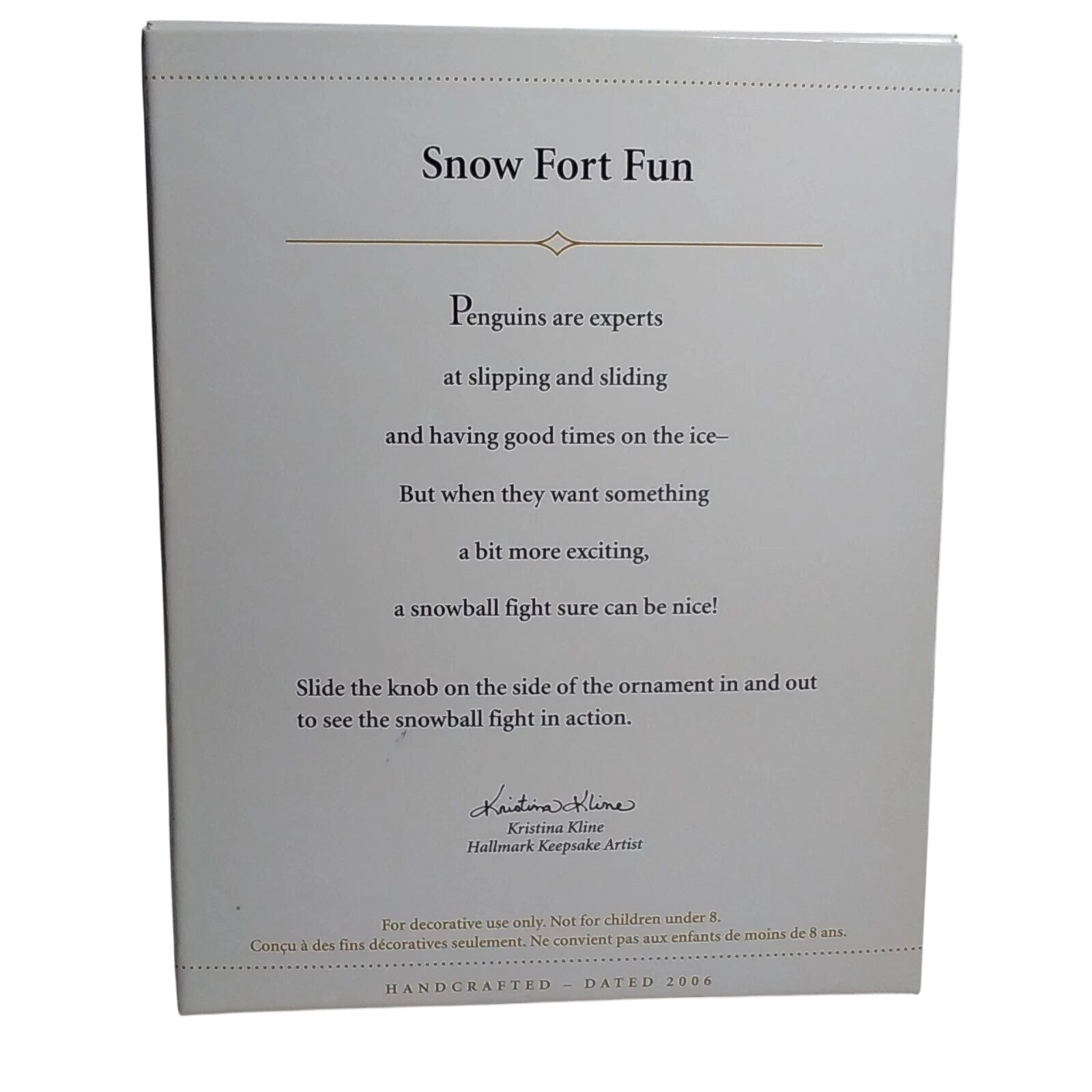 Celebrate mischievous winter joy with 2006 Snow Fort Fun, a lively animated ornament from Hallmark’s unofficial Kris’ Penguins collection. This charming keepsake features three adorable penguins engaged in a friendly snowball skirmish against a frosty fort backdrop. Slide the knob to bring the scene to life—watch the penguins hurl snowballs in a playful miniature snowball fight. Crafted by Kristina Kline Gaughran, this dynamic ornament arrives Mint-in-Box, ready to delight your holiday arrangement.