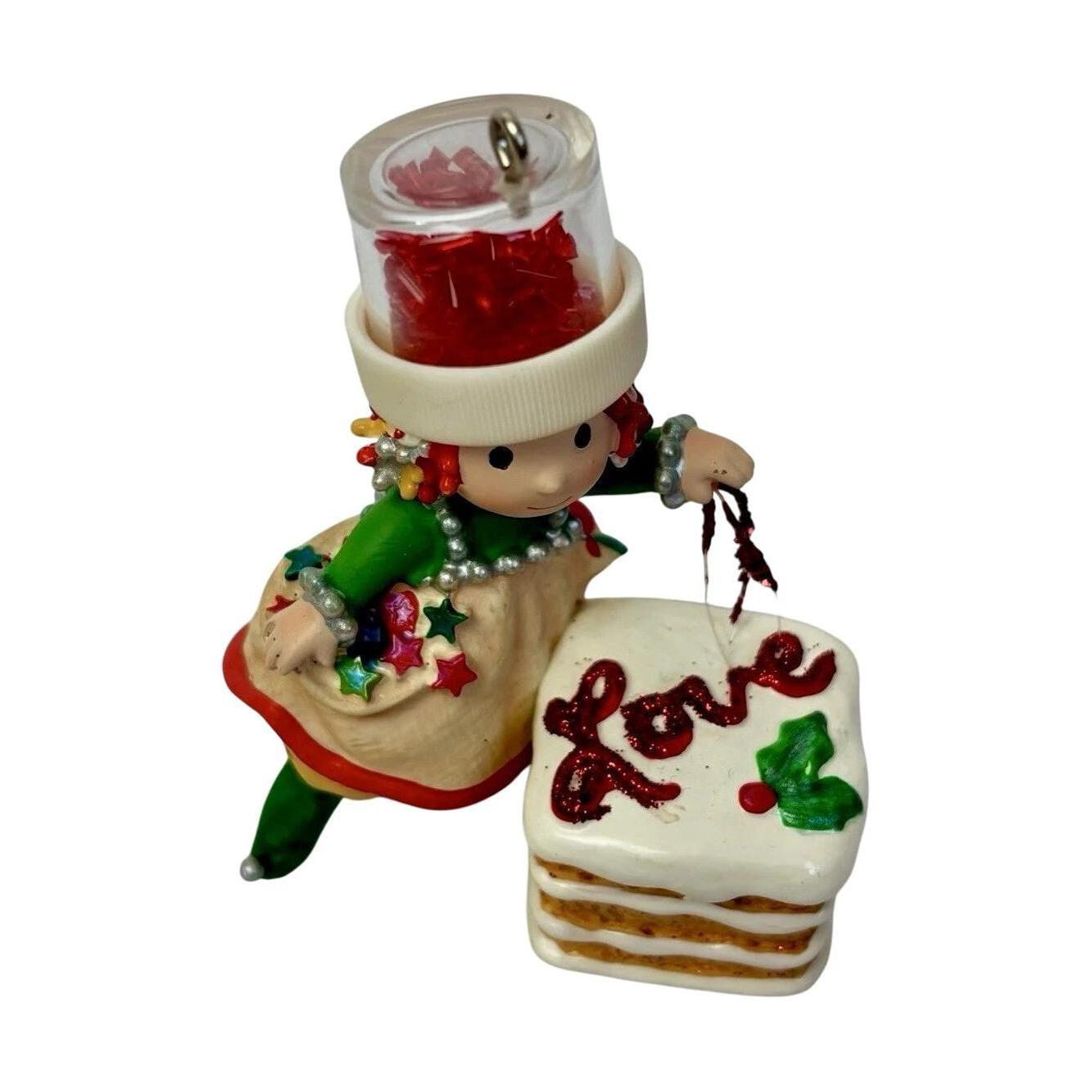 Add a dash of whimsy to your holiday baking with 2006 Sprinkle (The Merry Bakers Series) by Hallmark. This Gold Crown Exclusive Keepsake ornament features Sprinkle the elf, cheerfully putting the finishing touches on holiday treats—sprinkling colorful sugar over a frosted cake inscribed with the word “Love.”