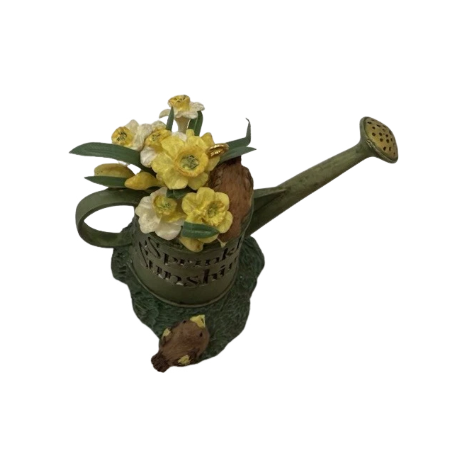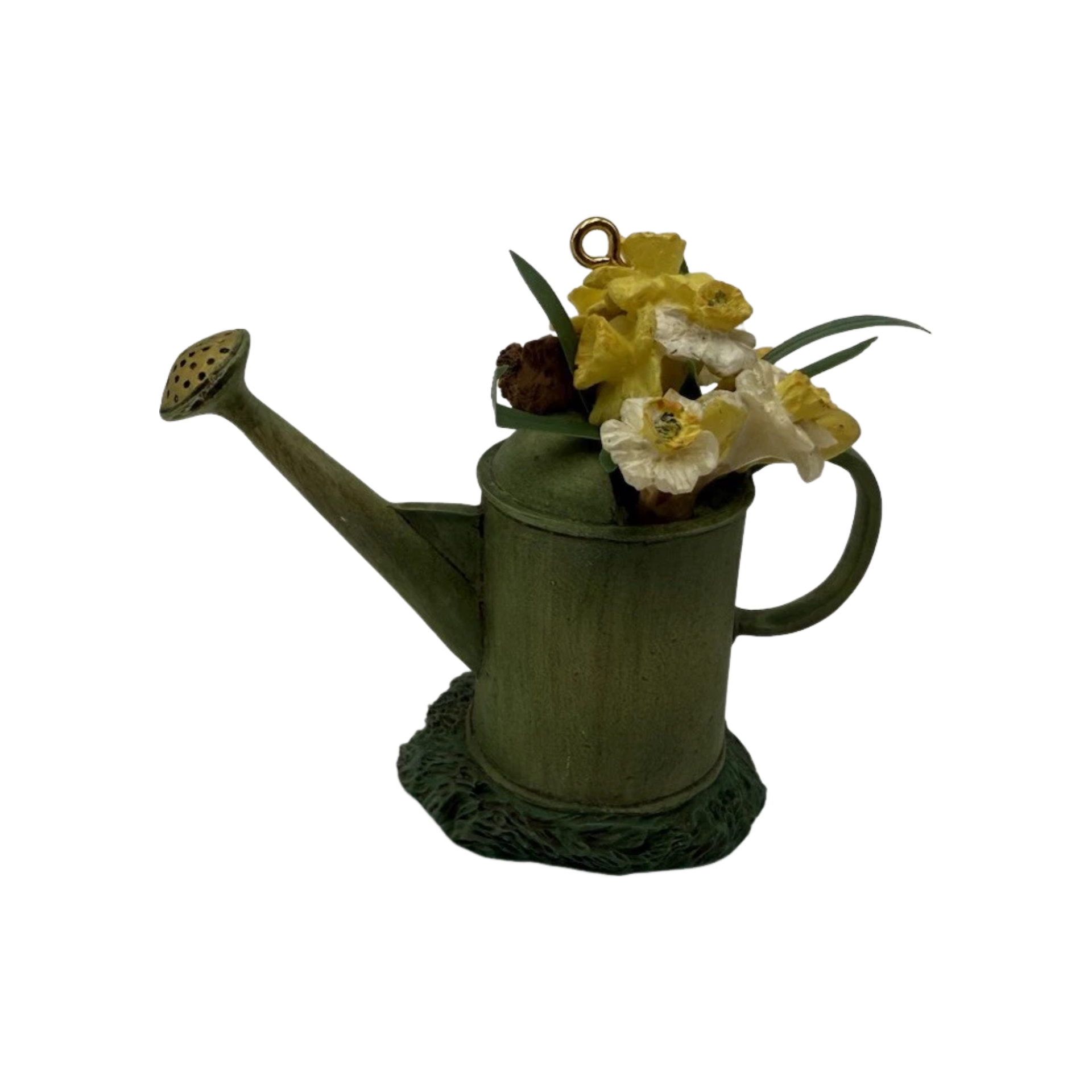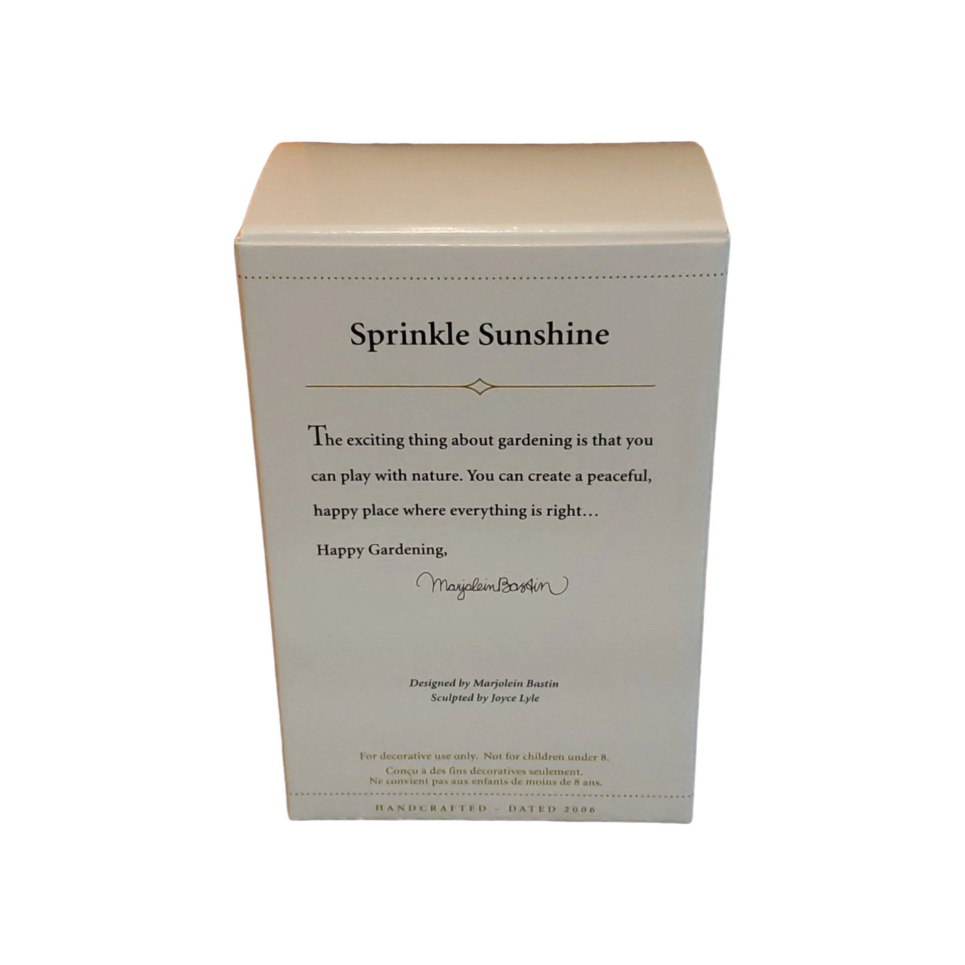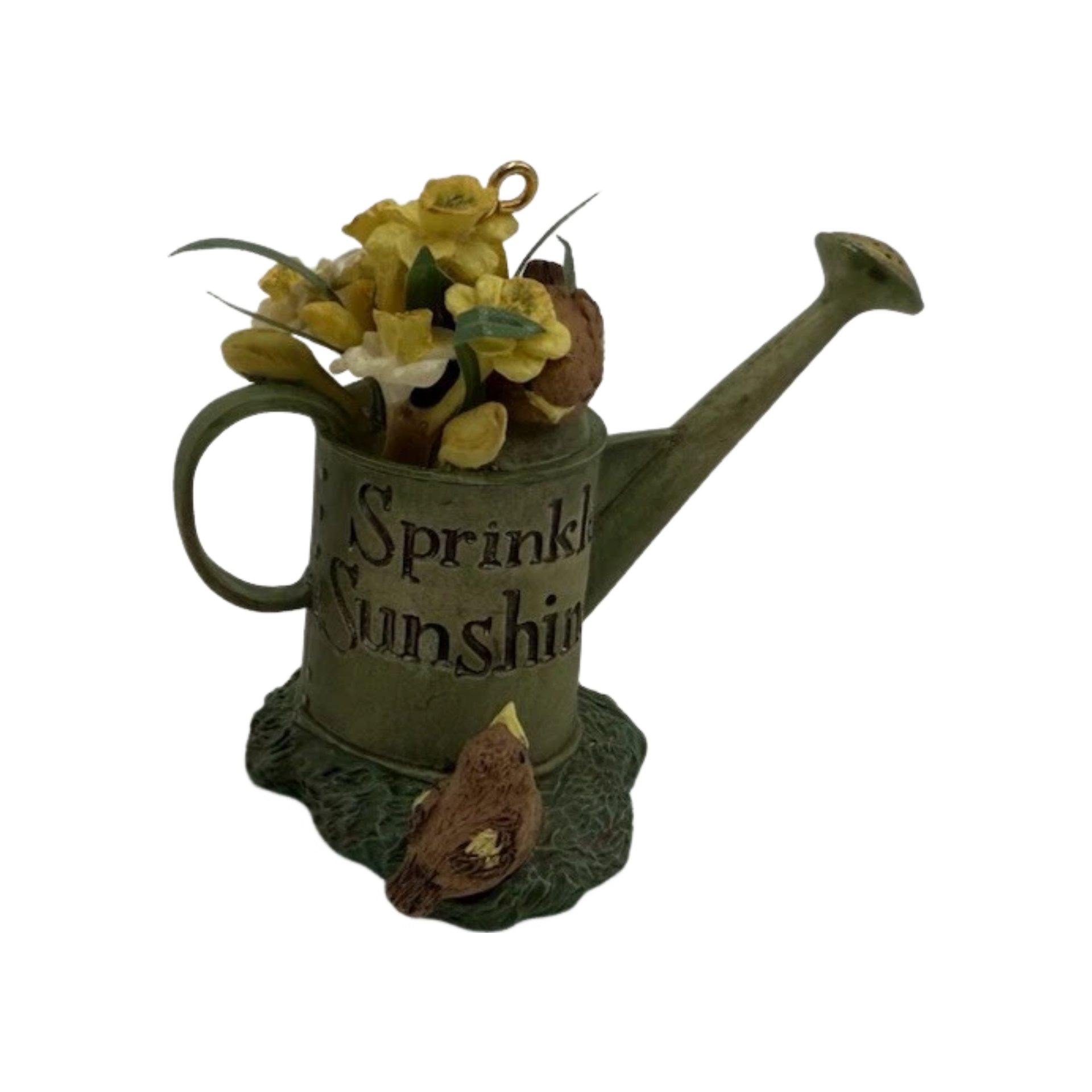 The 2006 Sprinkle Sunshine ornament from the Hallmark Keepsake “Nature’s Sketchbook” line features a charming garden-themed design by Marjolein Bastin with sculpting by Joyce Lyle. The piece depicts a quaint watering can inscribed with “Sprinkle Sunshine,” surrounded by delicate flora and tiny birds—a celebration of nature’s gentle beauty. Dated 2006 and model number QEO8266, it’s marked as a “very low production” item in its series, making it particularly desirable for collectors of nature-themed or Bastin-art-based ornaments.