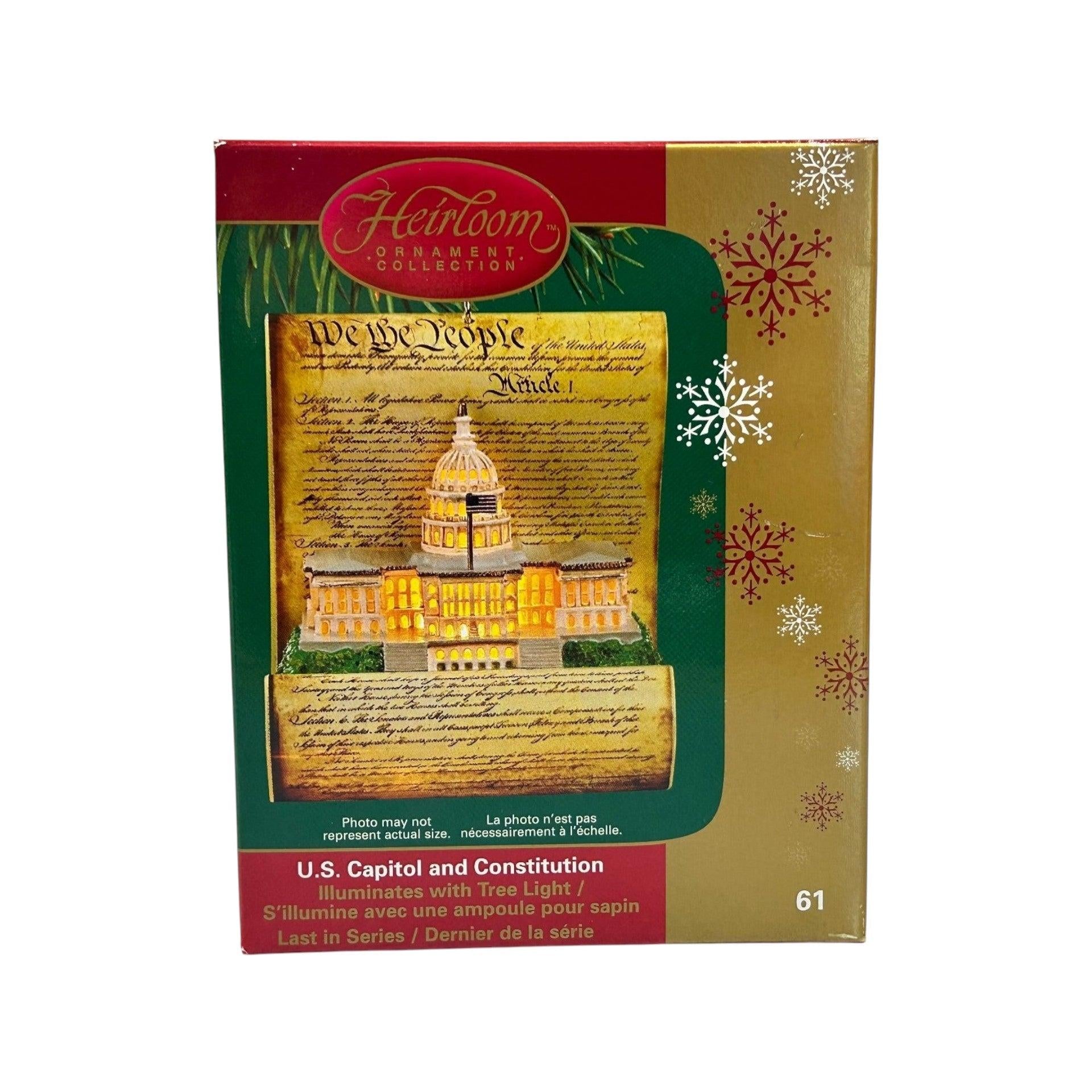 This special ornament from Carlton Cards beautifully captures two iconic symbols of American heritage—the domed U.S. Capitol building and the foundational document of the U.S. Constitution—rendered with high-quality craftsmanship in the Heirloom Collection. The sculpted design features finely-detailed architectural elements of the Capitol, a scroll or parchment motif referencing the Constitution, and subtle patriotic colour accents that raise this piece beyond typical holiday décor into collectible territory. Meant for tree display or a patriotic themed collection, it offers both nostalgic appeal and timeless American symbolism. Its rarity and thematic focus make it a prized item for both decoration and historic-oriented collectors.