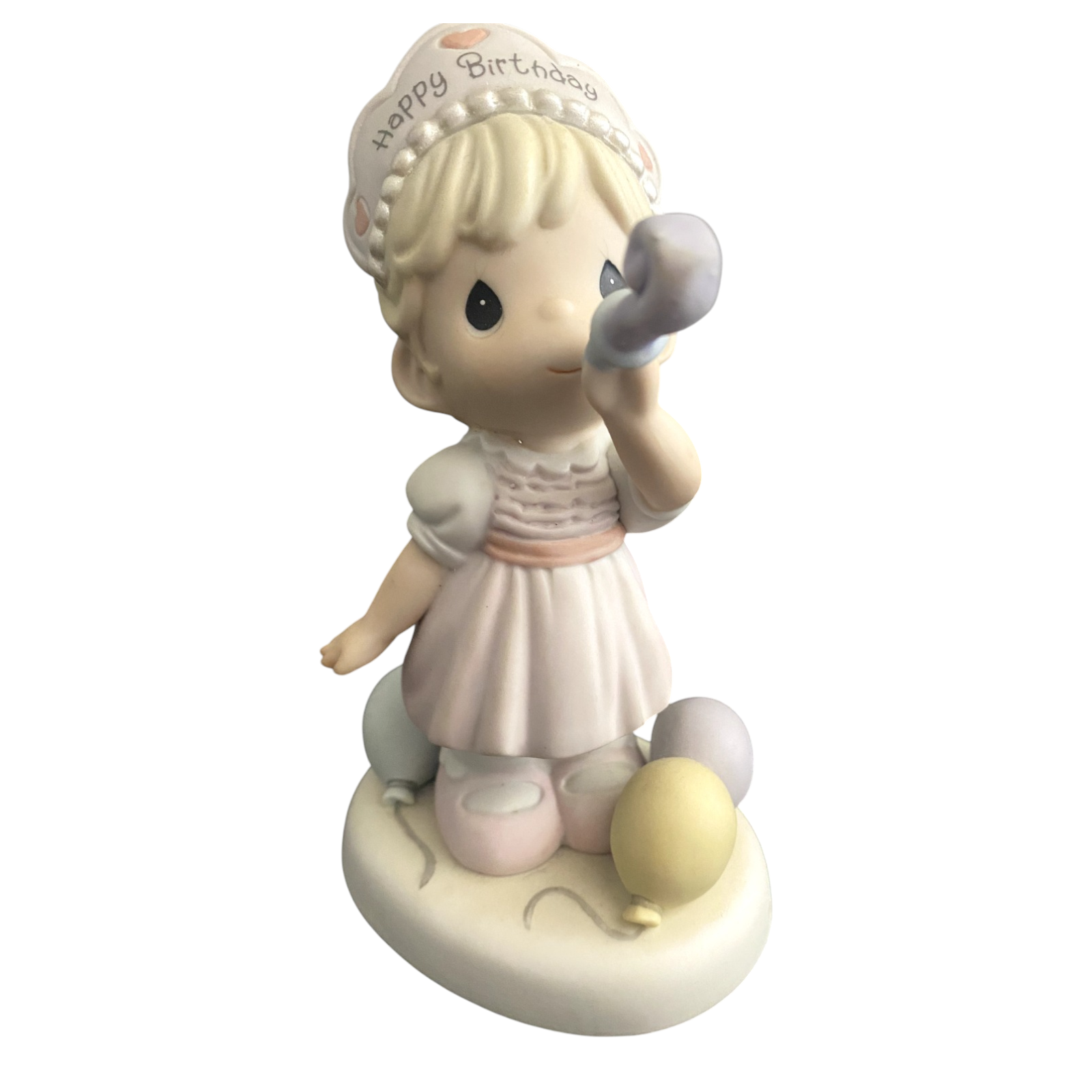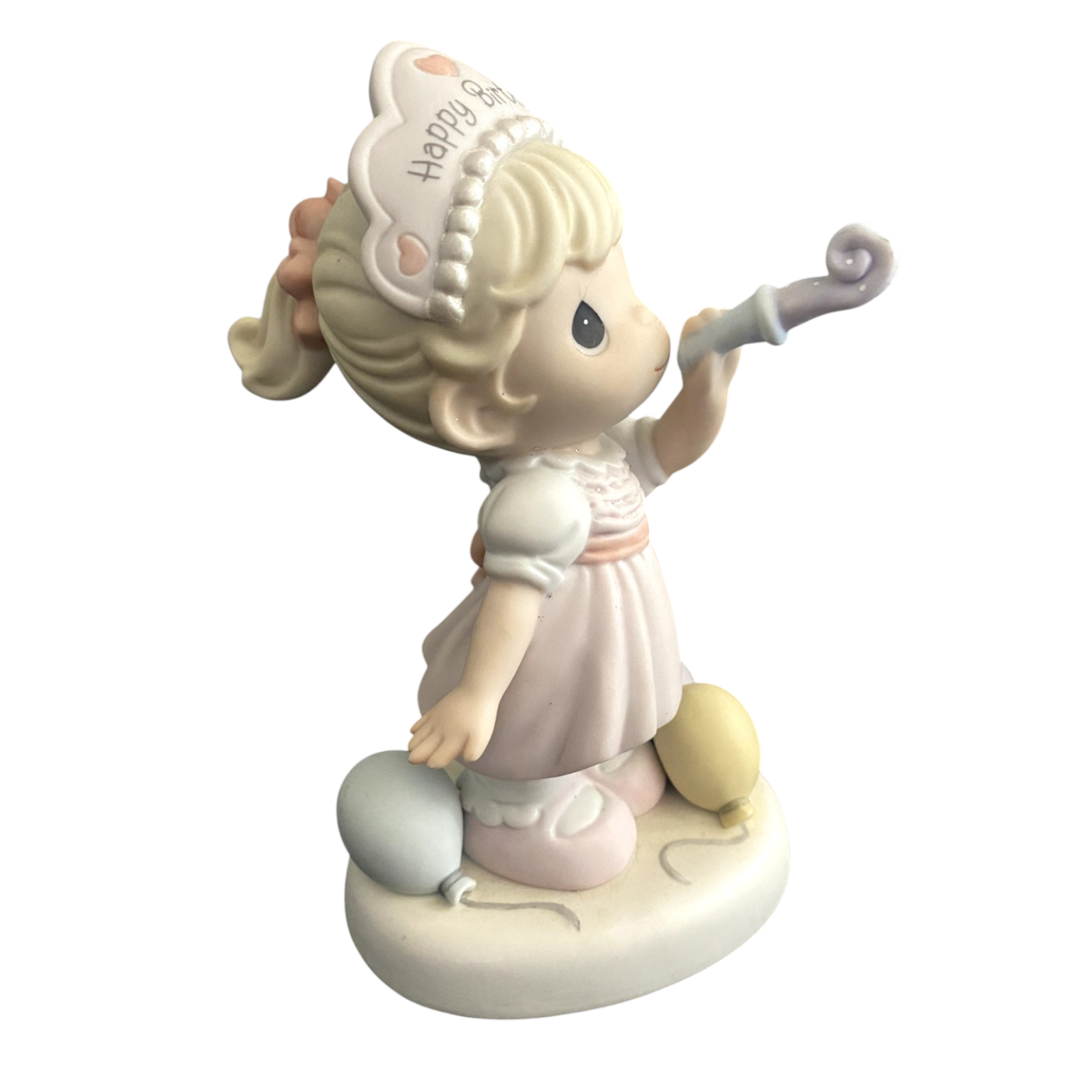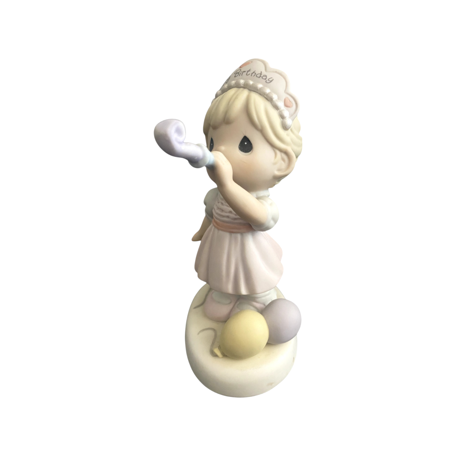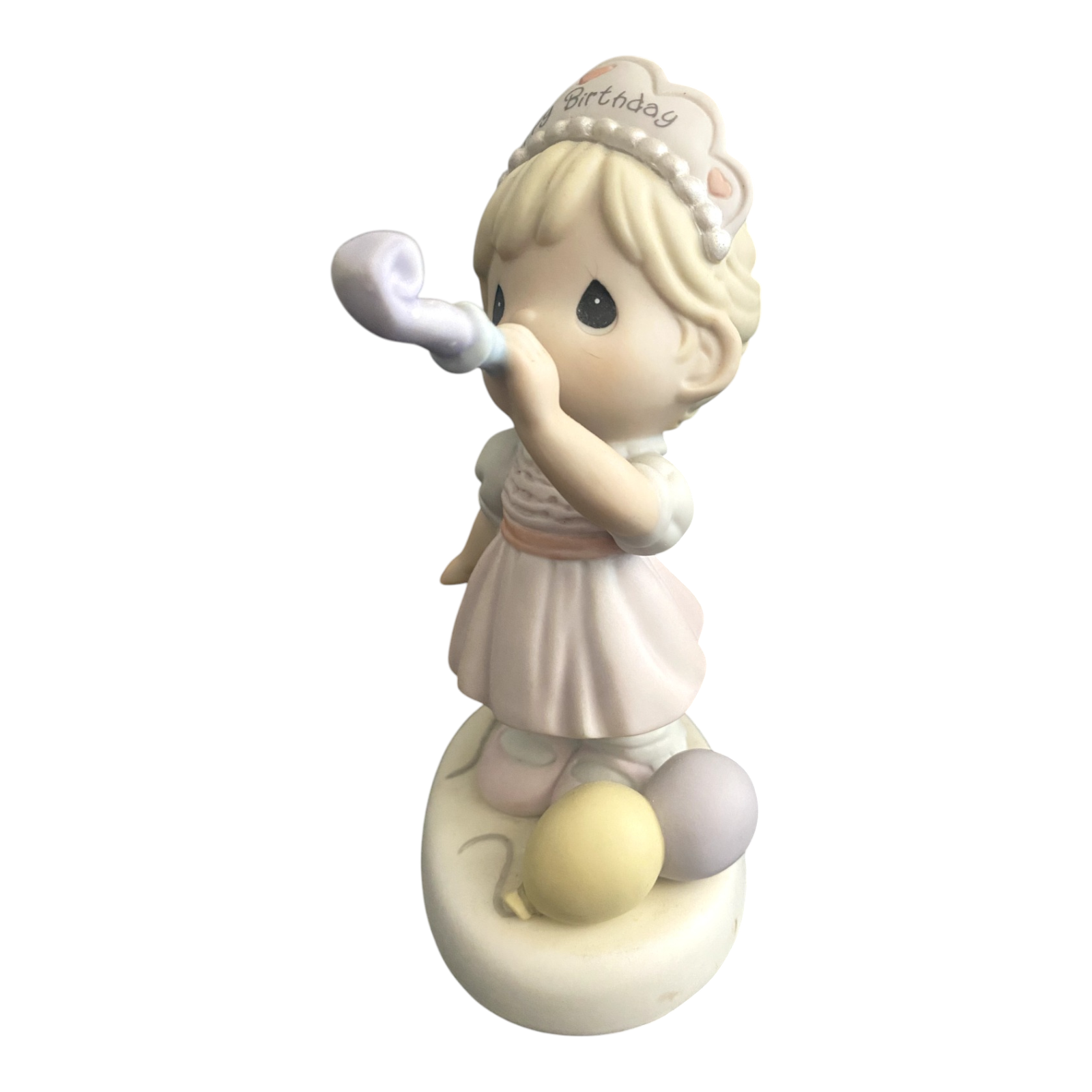 Celebrate a special birthday with this charming 2006 collectible from Precious Moments—“Wishing You a Year Filled With Birthday Cheer” (Item No. 630016). The delicate porcelain-bisque figurine features a sweet birthday girl in a pink frock and “pearl”-trimmed tiara, blowing a party horn, capturing joyful wishes for the year ahead. The piece comes in its original box and is ready for gifting or display. No batteries, cords, or lights are required—this figurine is purely decorative.