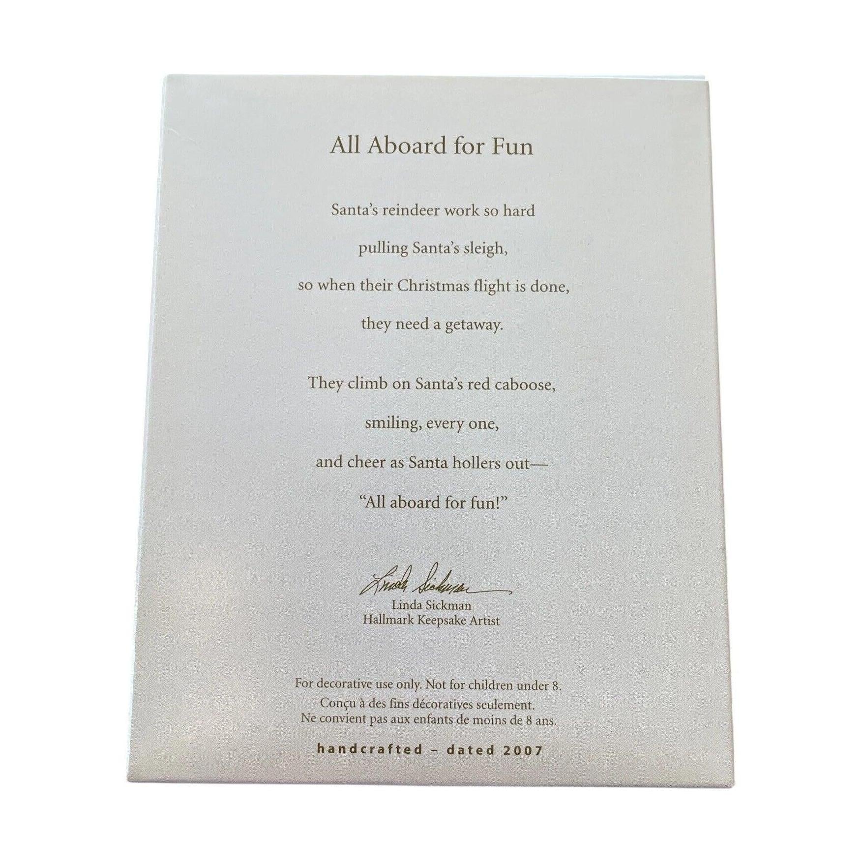 This special-edition ornament from the Hallmark Keepsake line was released in 2007 to commemorate the 20th Anniversary of the Keepsake Ornament Club. The design, by artist Linda Sickman, features a festive red caboose decorated in holiday trimmings with Santa and his reindeer enjoying some down-time: a playful “All Aboard for Fun” theme. As an event exclusive (available only at specific Keepsake Ornament Club gatherings) it holds extra appeal for collectors of club-exclusive or limited-quantity pieces.