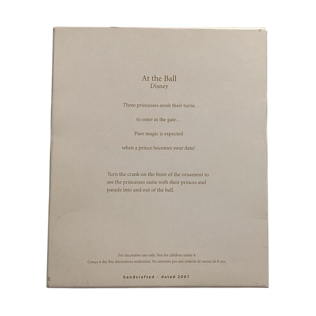 Step into a royal celebration with the 2007 At the Ball Hallmark Keepsake ornament featuring beloved Disney Princesses. This elegant ornament showcases Cinderella, Belle, and Aurora dressed in sparkling gowns as they attend an enchanting holiday ball. Surrounded by golden accents and graceful sculpting, the scene captures each princess’s timeless beauty and charm. A favorite among Disney fans, this collectible embodies the magic, grace, and wonder of Disney’s fairy-tale world—perfect for adding royal sparkle to your Christmas tree.