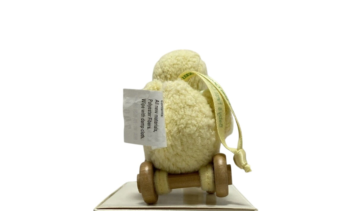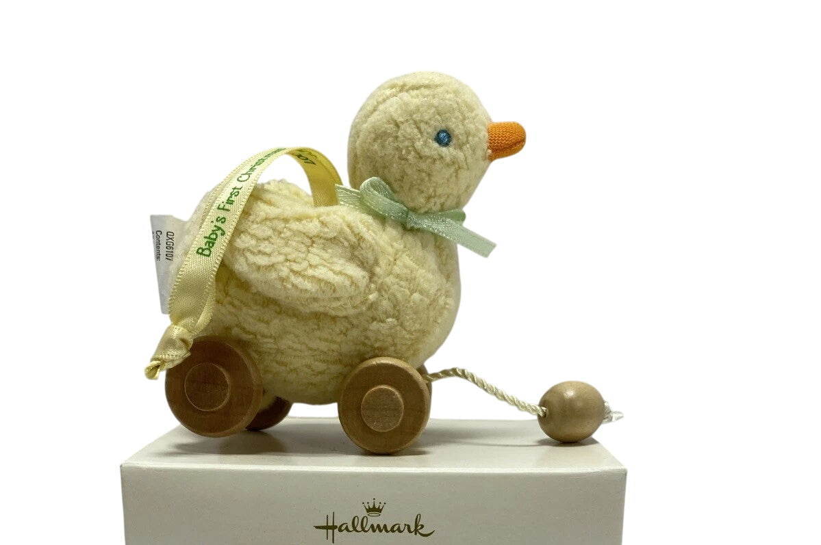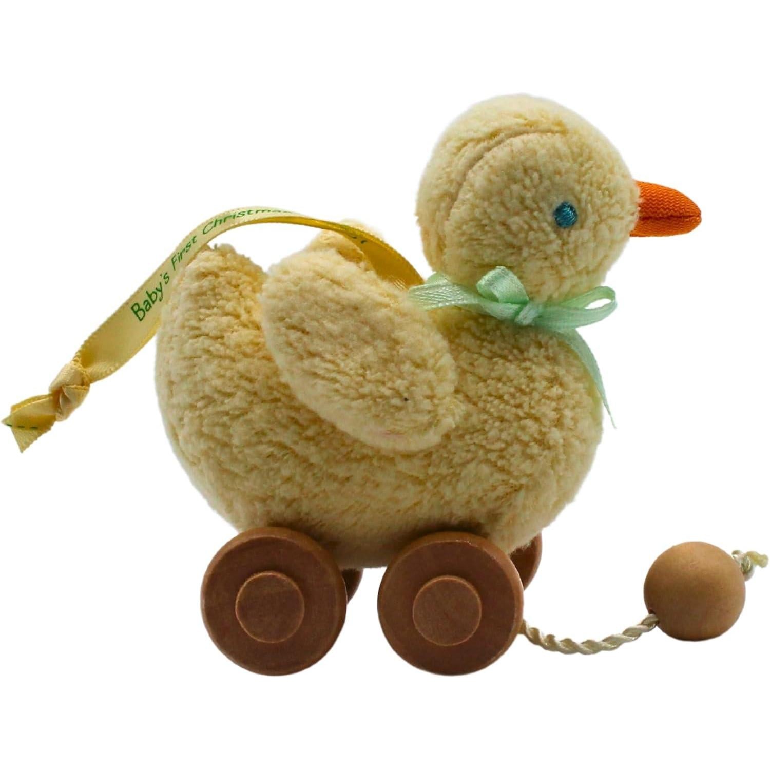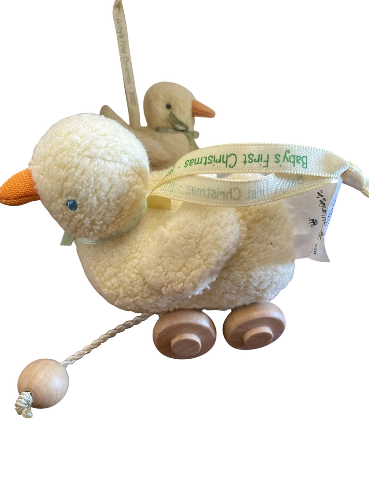 Capture the charm of baby’s first holiday with the 2007 Baby’s First Christmas Duck Pull Toy keepsake ornament. This piece features a soft plush duck on wheeled pull toy style wheels, perfect as a nostalgic tribute to classic baby playthings. A ribbon across the back reads “Baby’s First Christmas – 2007,” dating the ornament and making it a sentimental addition to any tree.